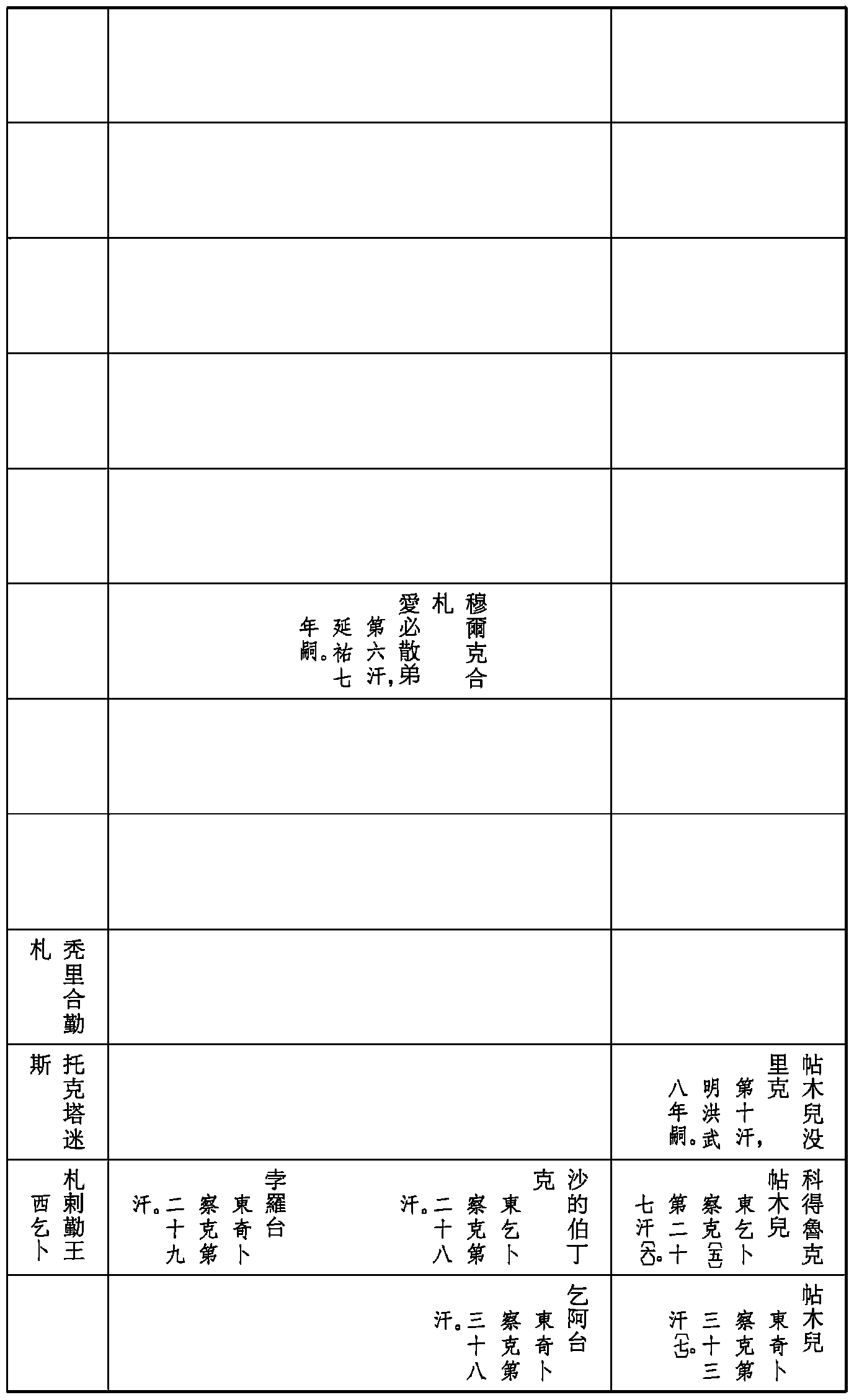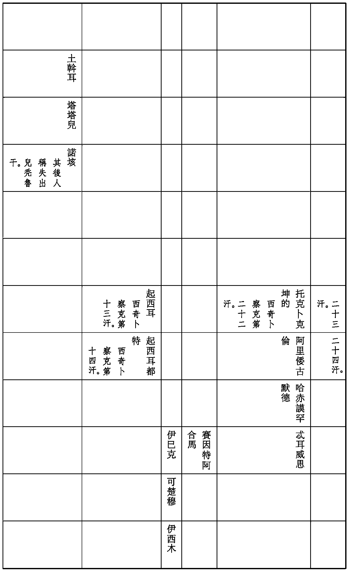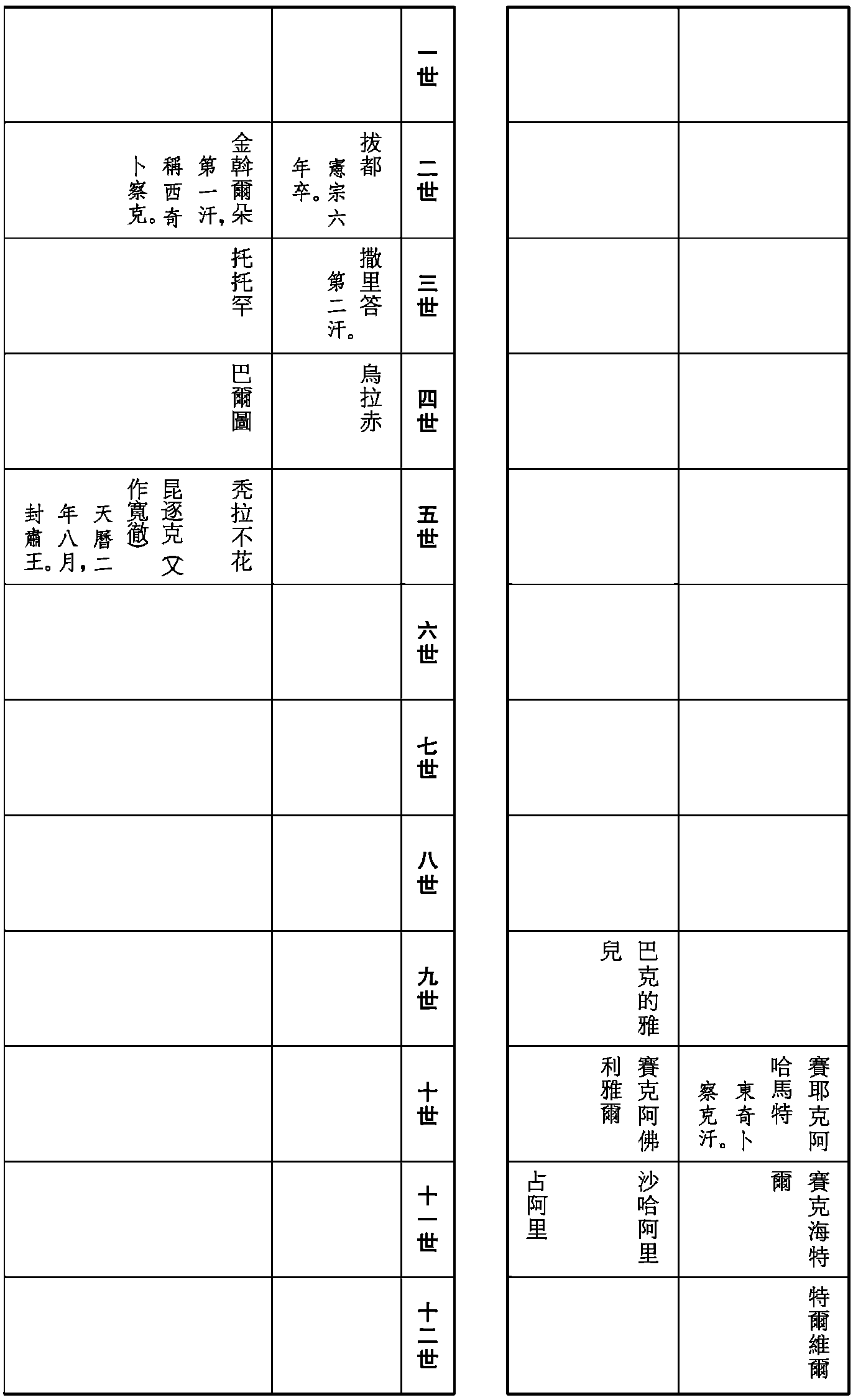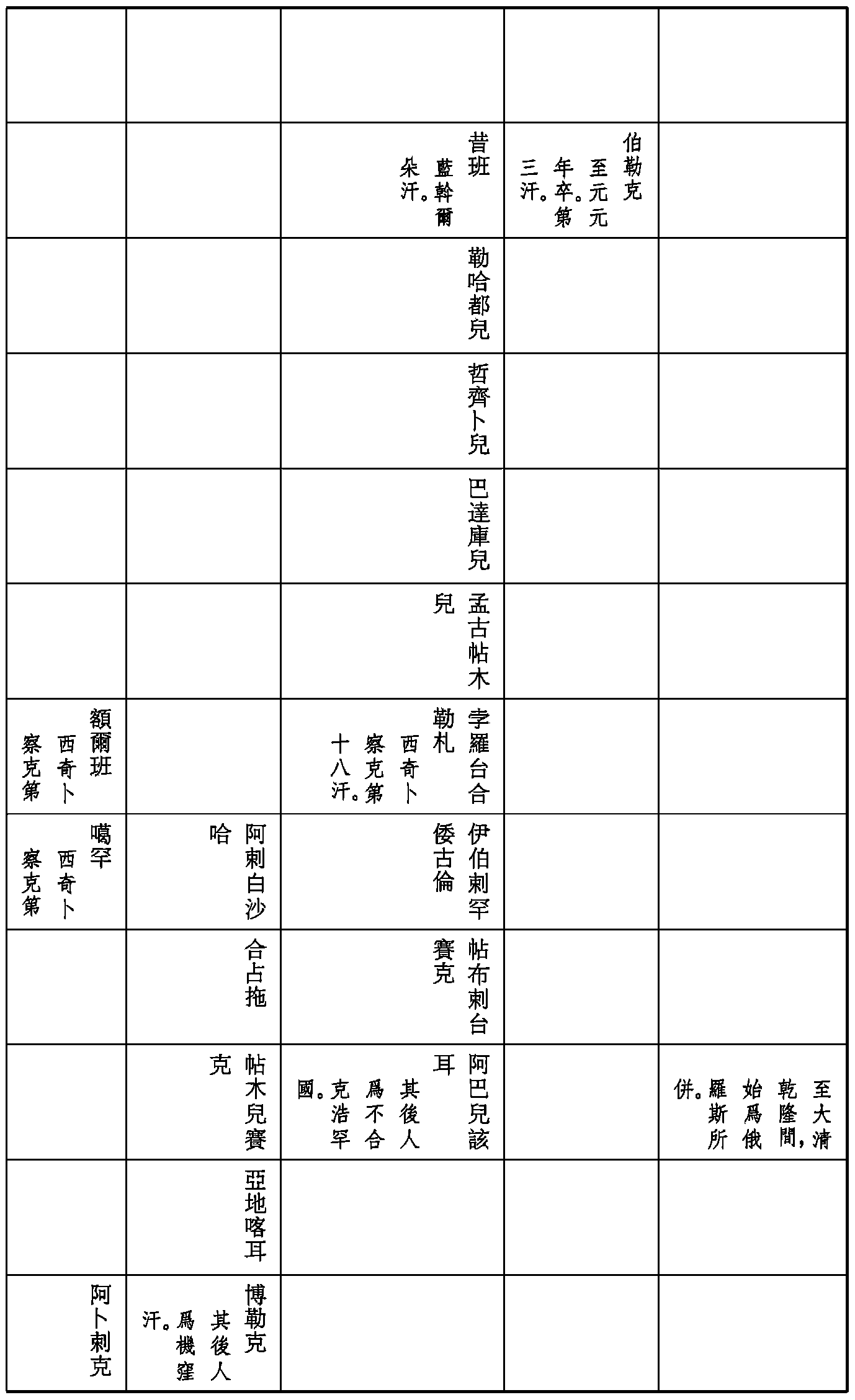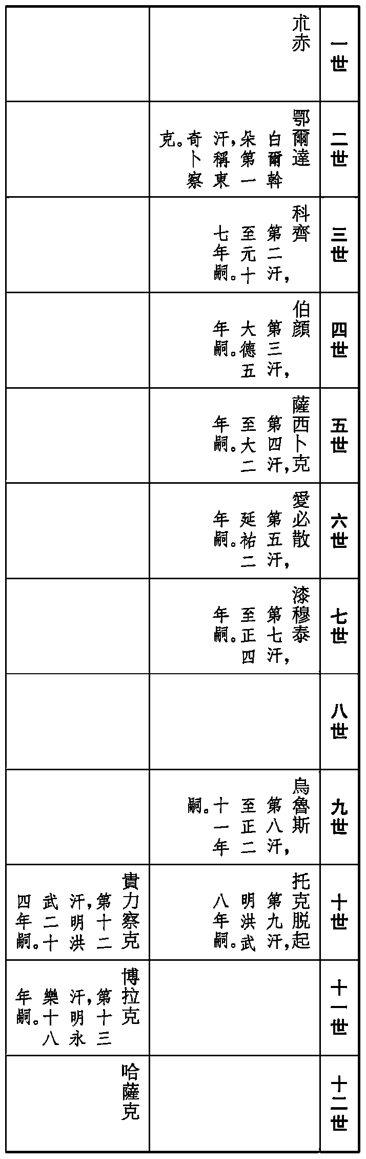 [五]「東乞卜察克」,「東」原作「西」,下各欄及下二「東奇卜察克」同。按此表係鄂爾達世系,鄂爾達既稱東奇卜察克,其子孫亦當同稱「東」,不應稱「西」。「西奇卜察克」指拔都一系,此顯係誤置,因改。下同改。