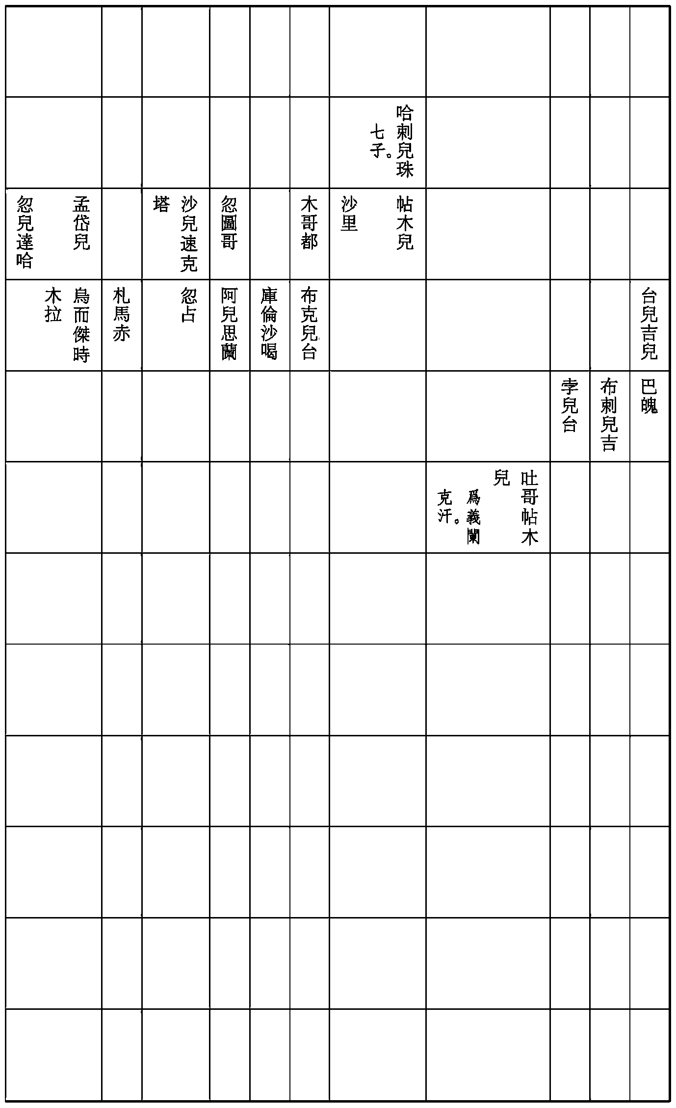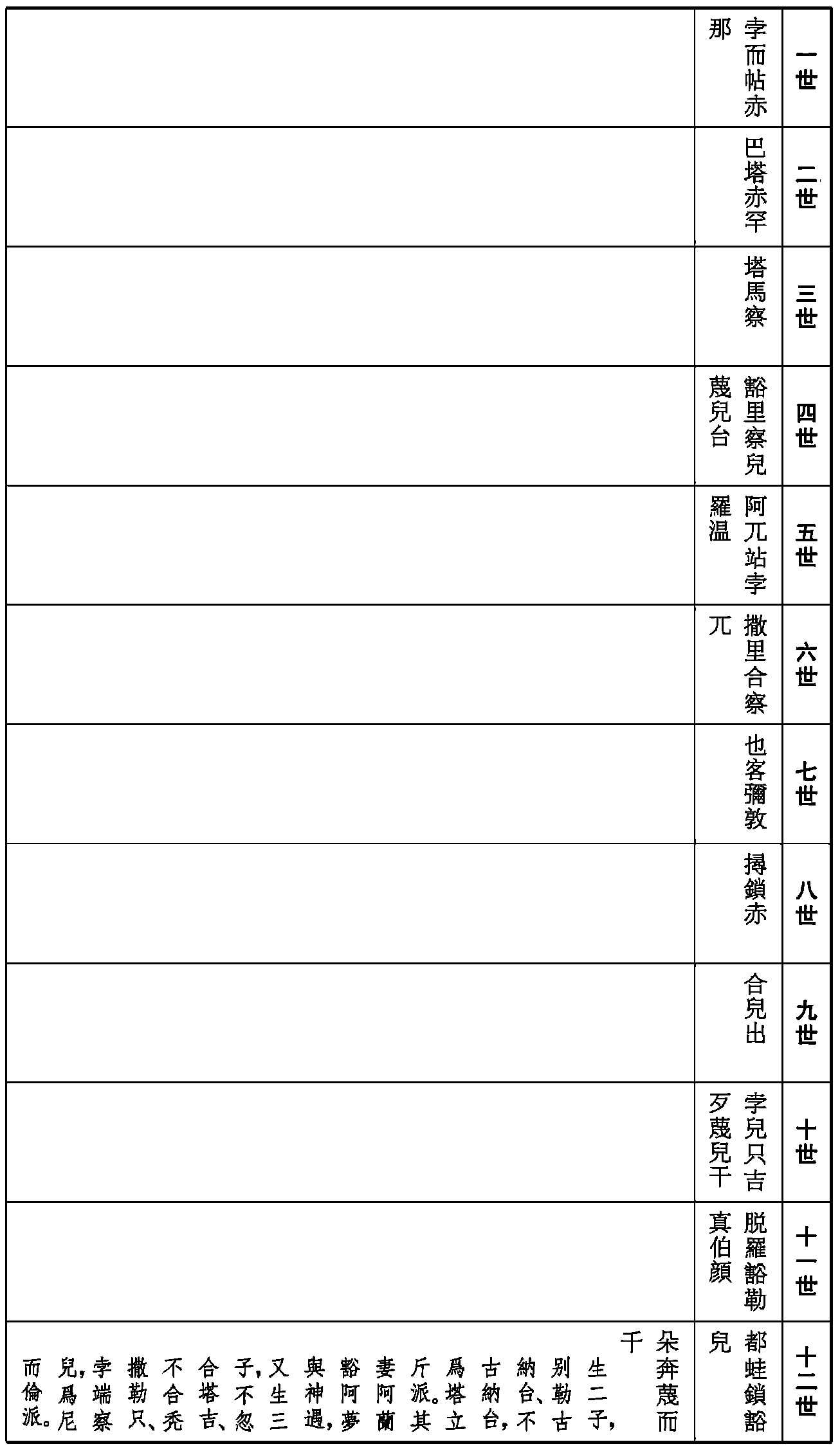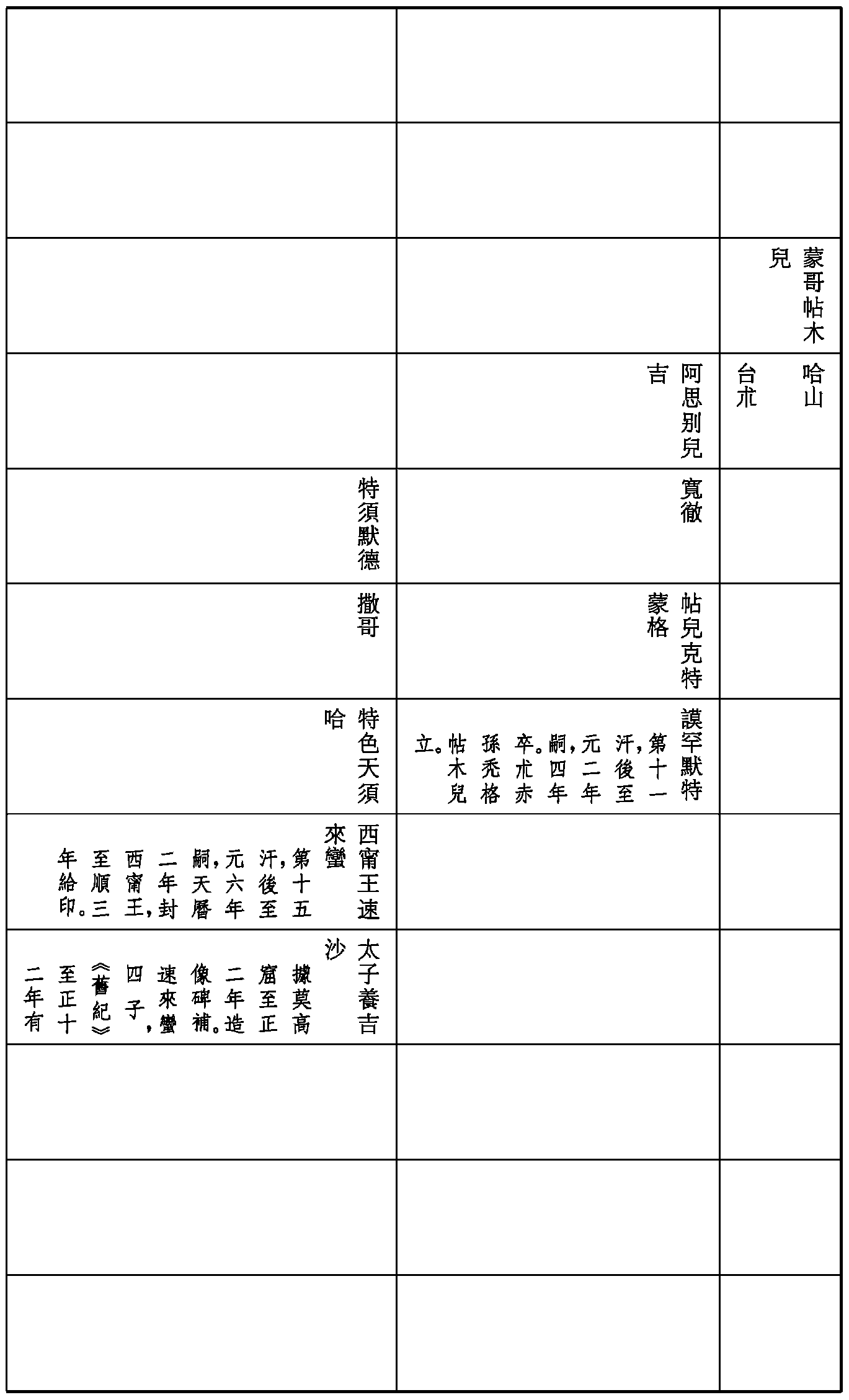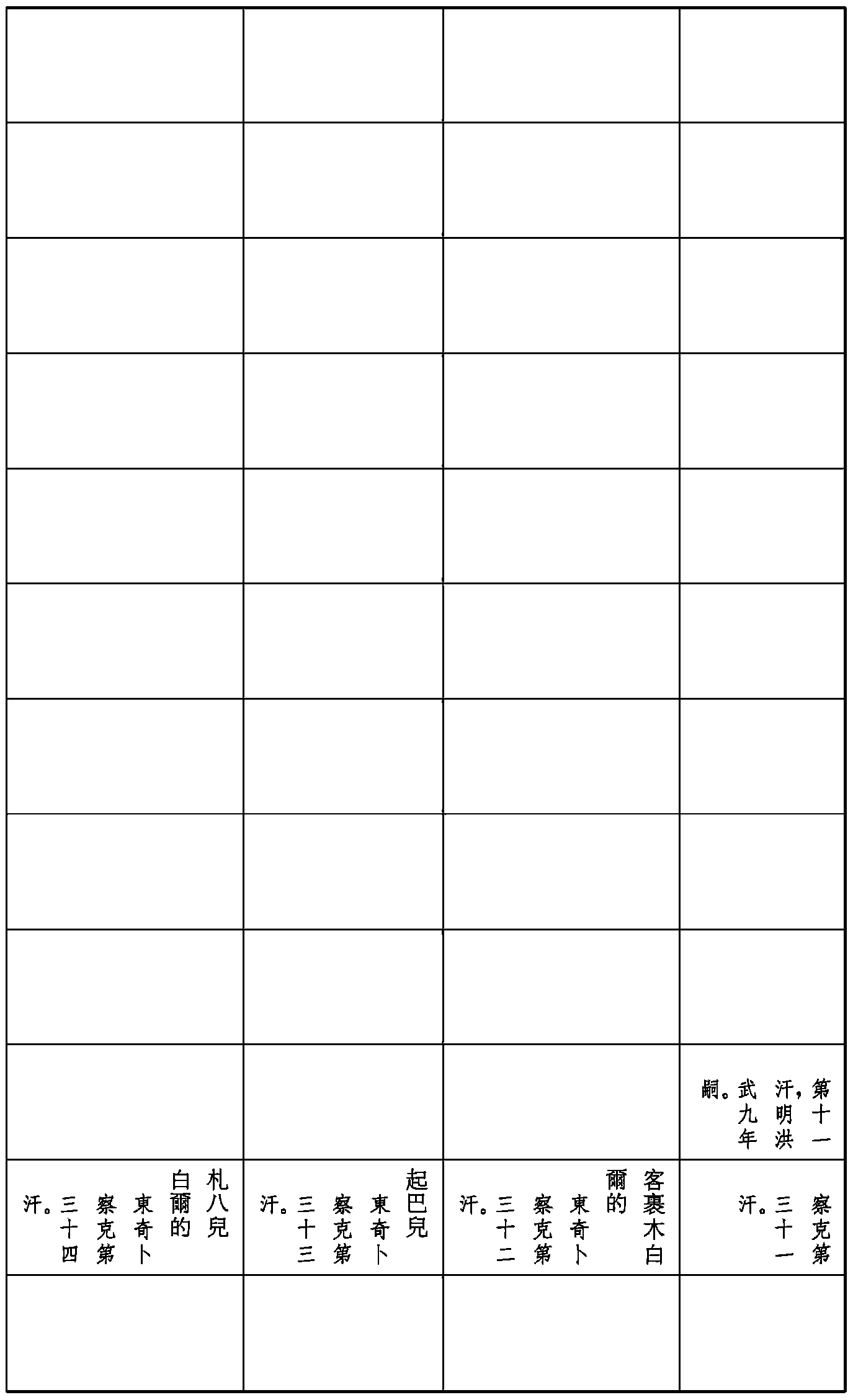 [五]「東乞卜察克」,「東」原作「西」,下各欄及下二「東奇卜察克」同。按此表係鄂爾達世系,鄂爾達既稱東奇卜察克,其子孫亦當同稱「東」,不應稱「西」。「西奇卜察克」指拔都一系,此顯係誤置,因改。下同改。