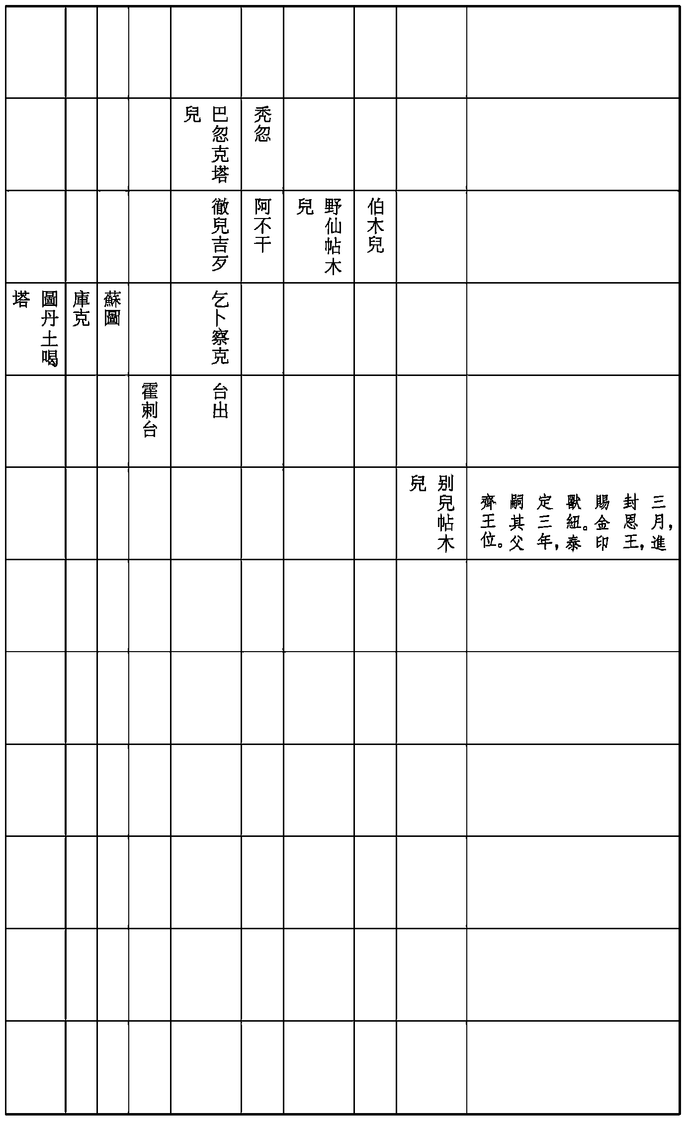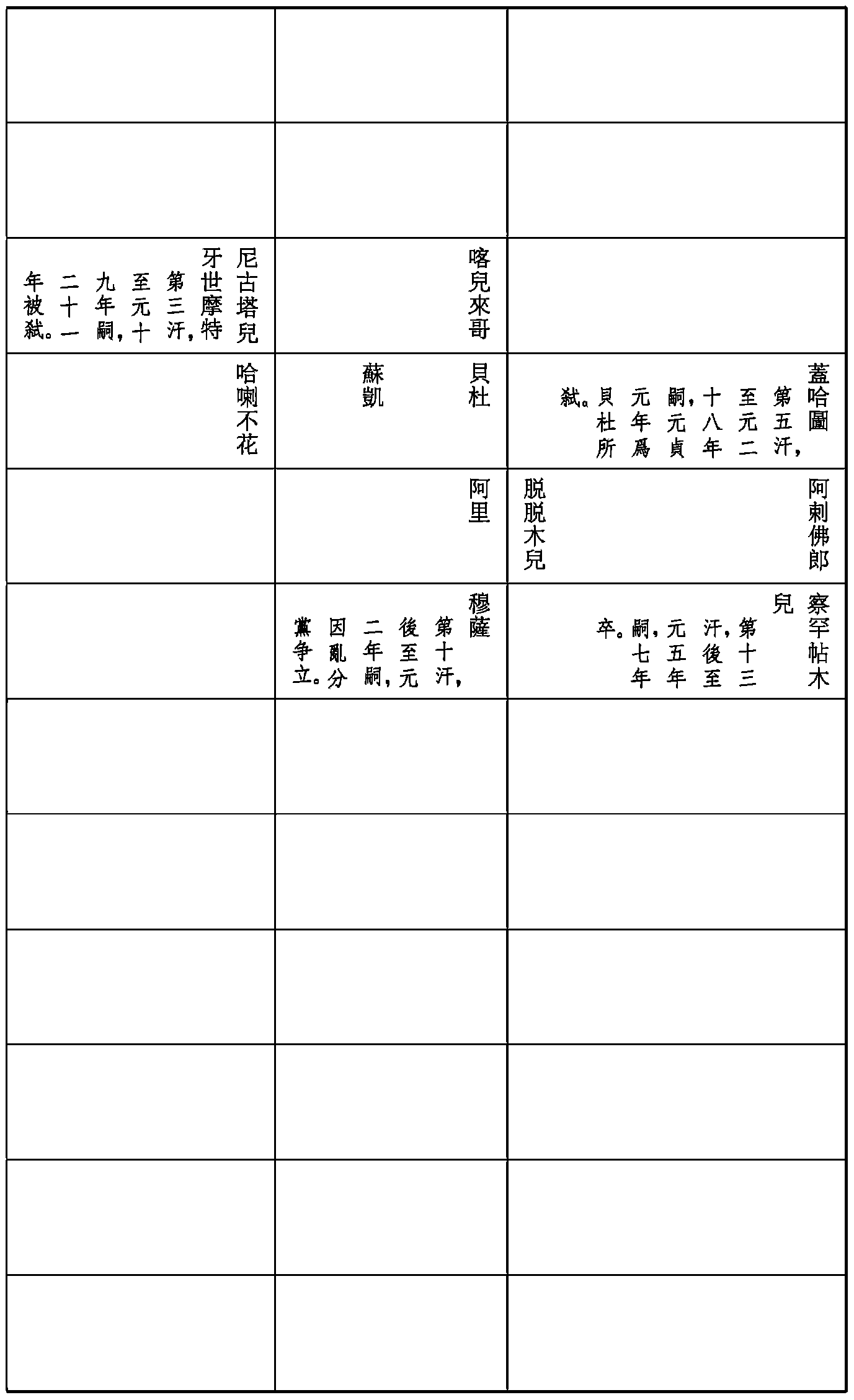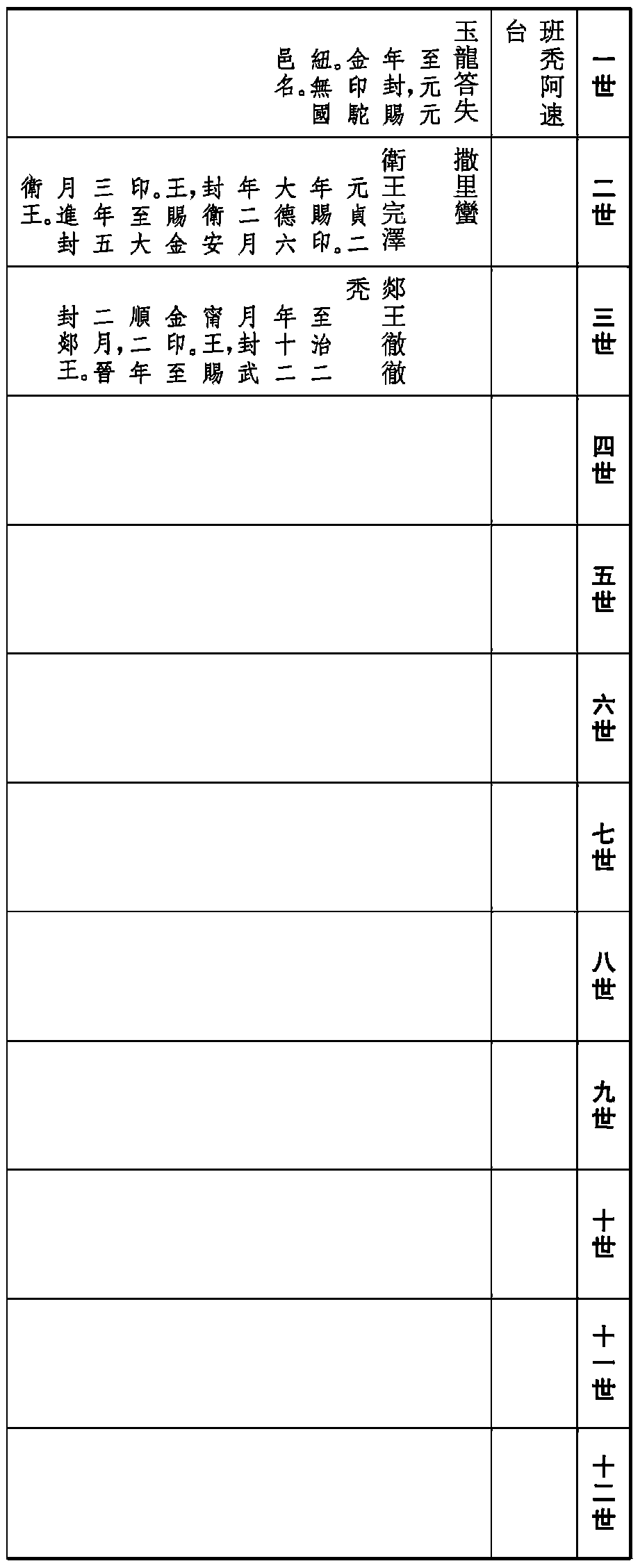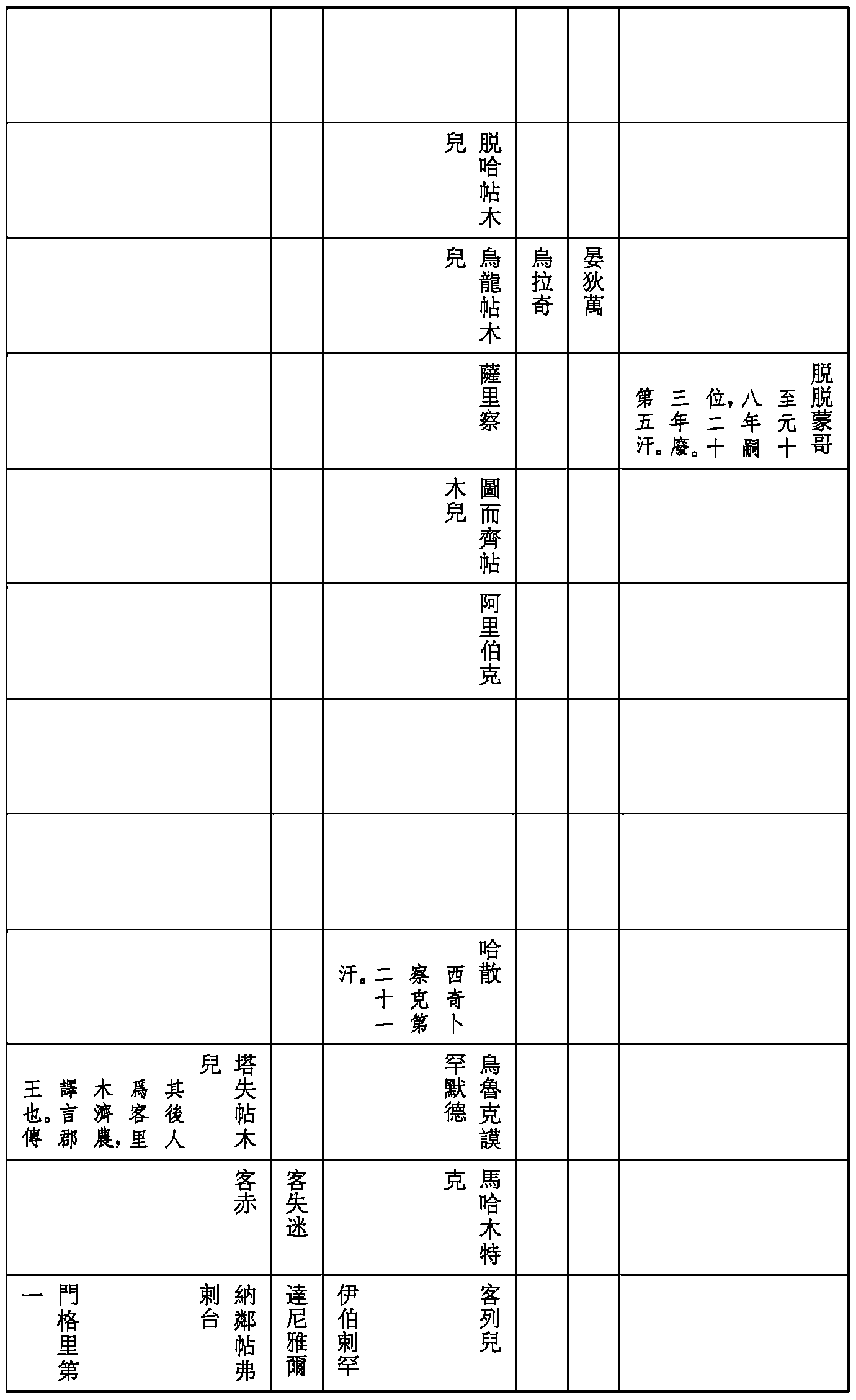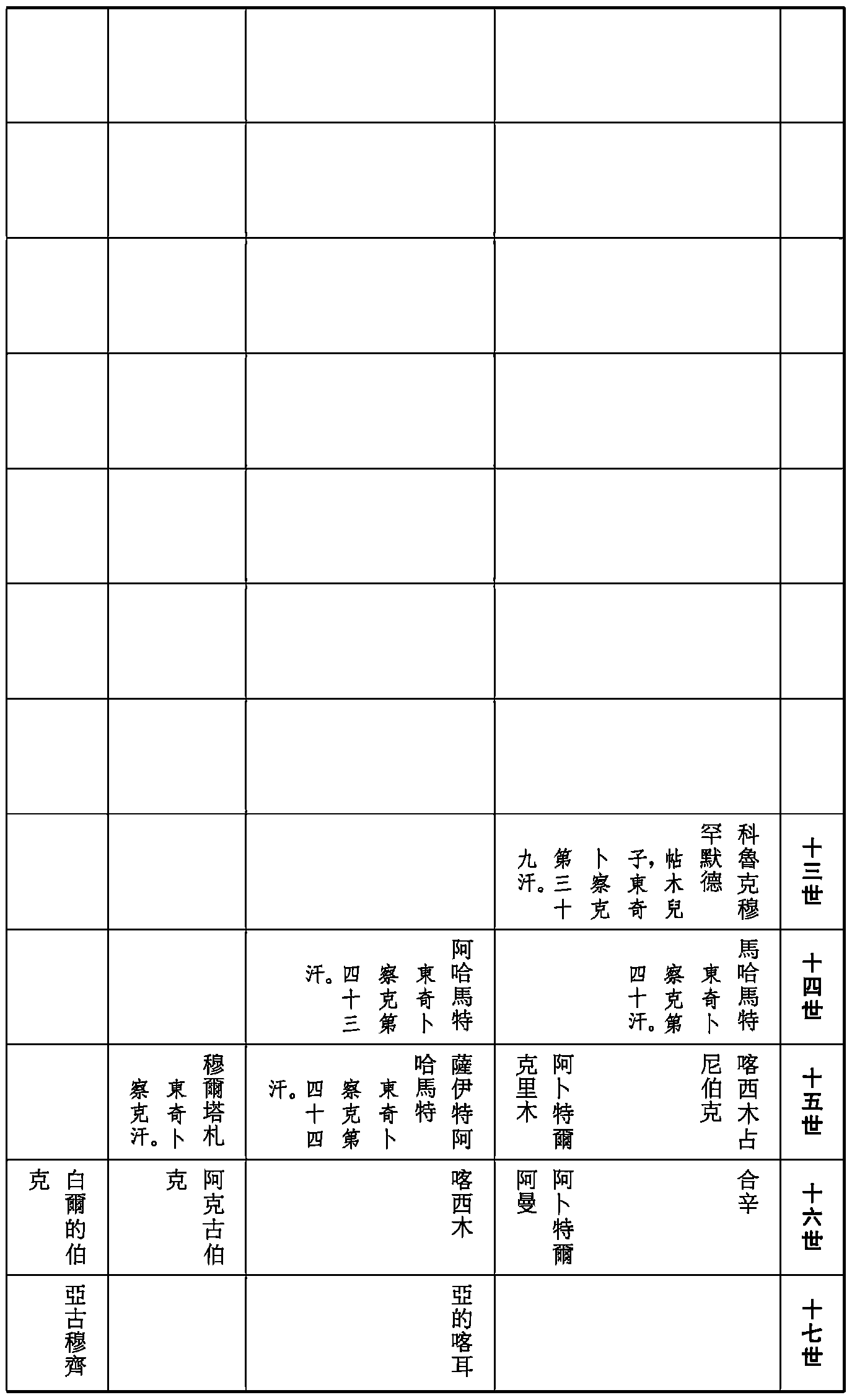 [五]「東乞卜察克」,「東」原作「西」,下各欄及下二「東奇卜察克」同。按此表係鄂爾達世系,鄂爾達既稱東奇卜察克,其子孫亦當同稱「東」,不應稱「西」。「西奇卜察克」指拔都一系,此顯係誤置,因改。下同改。