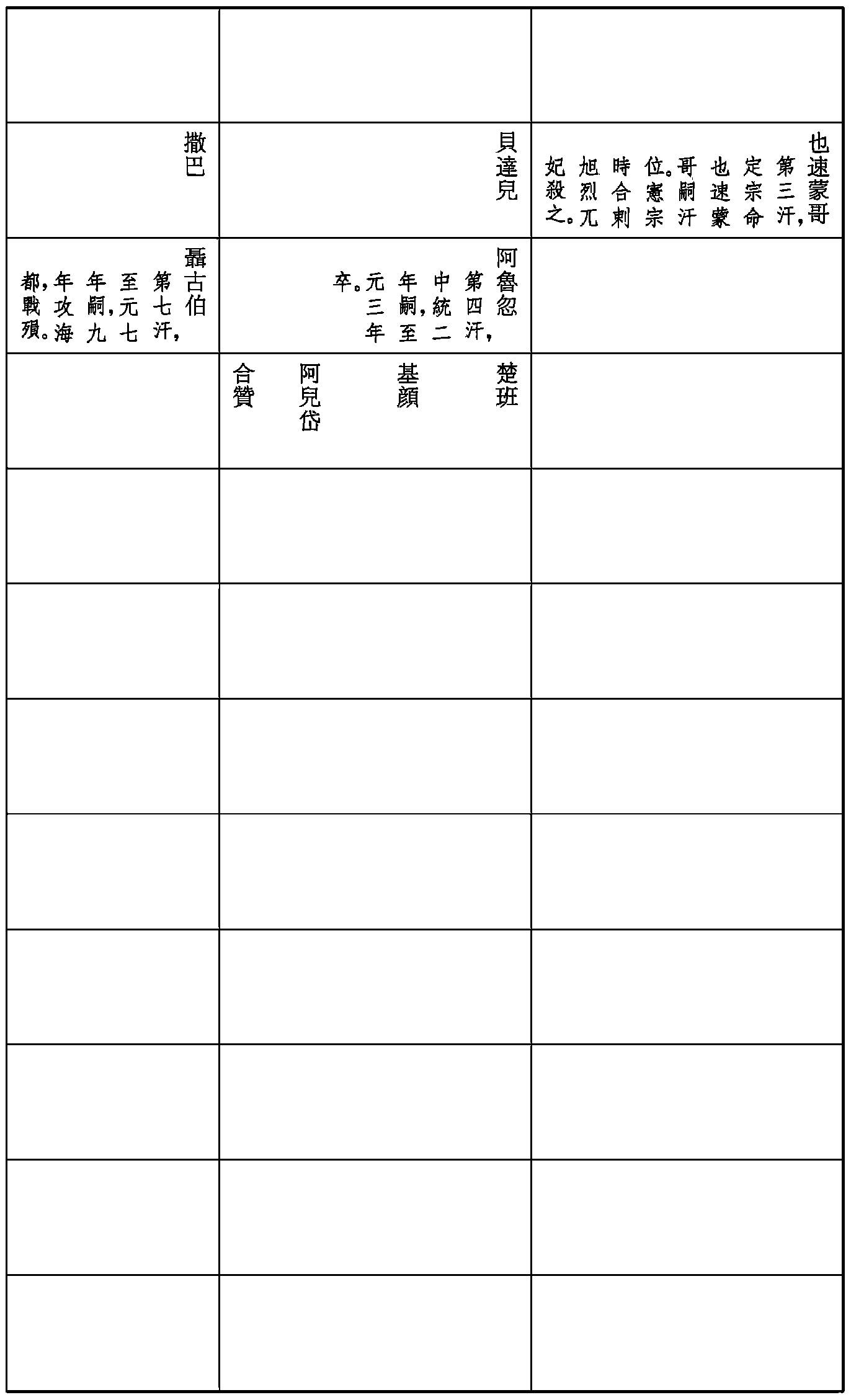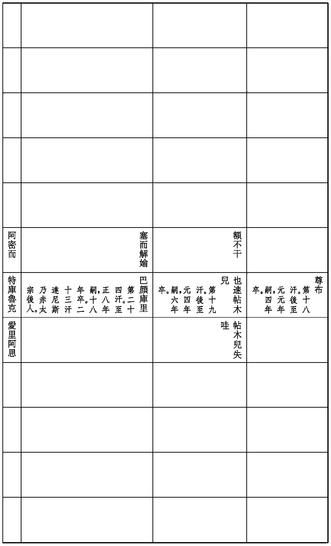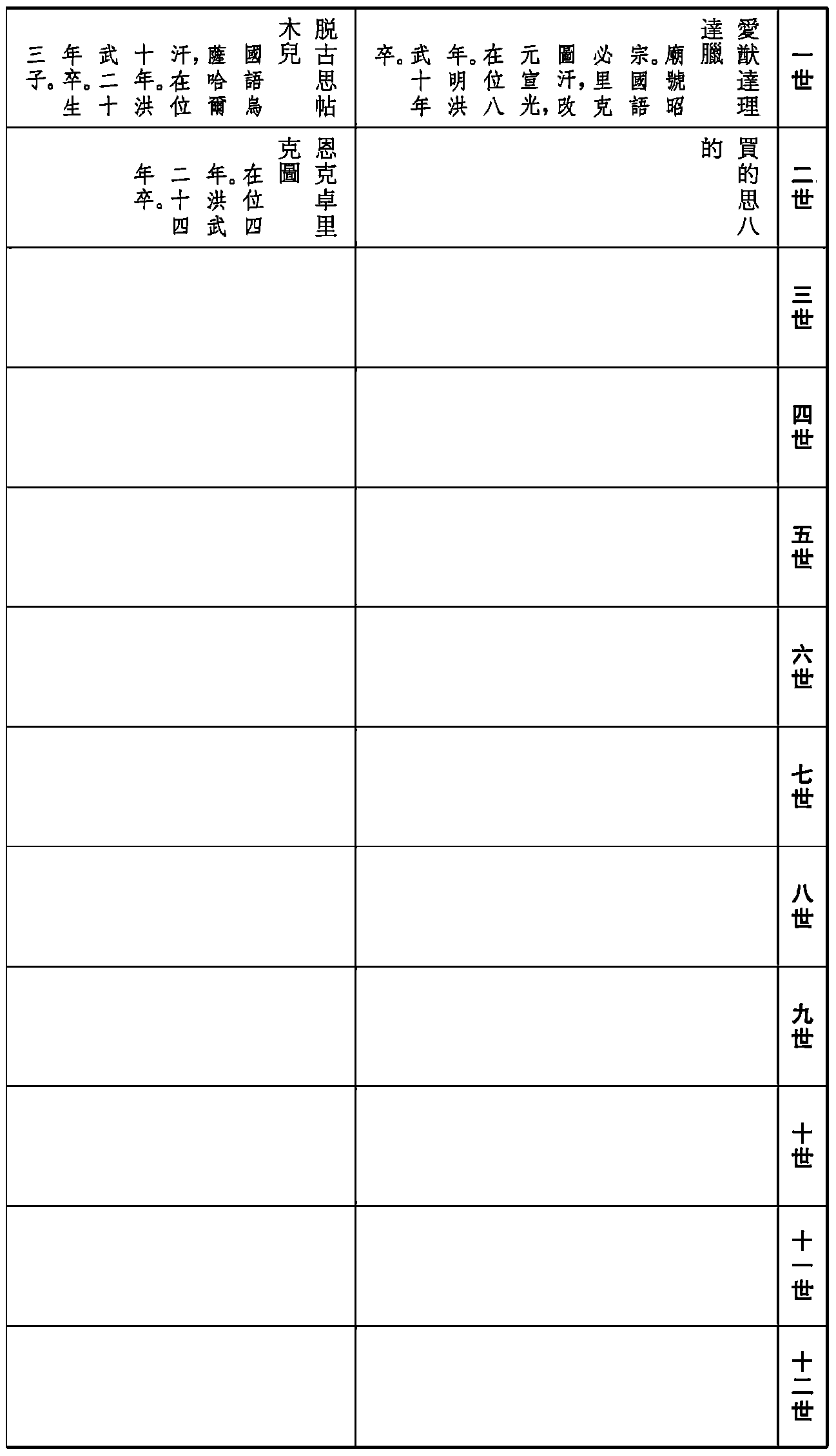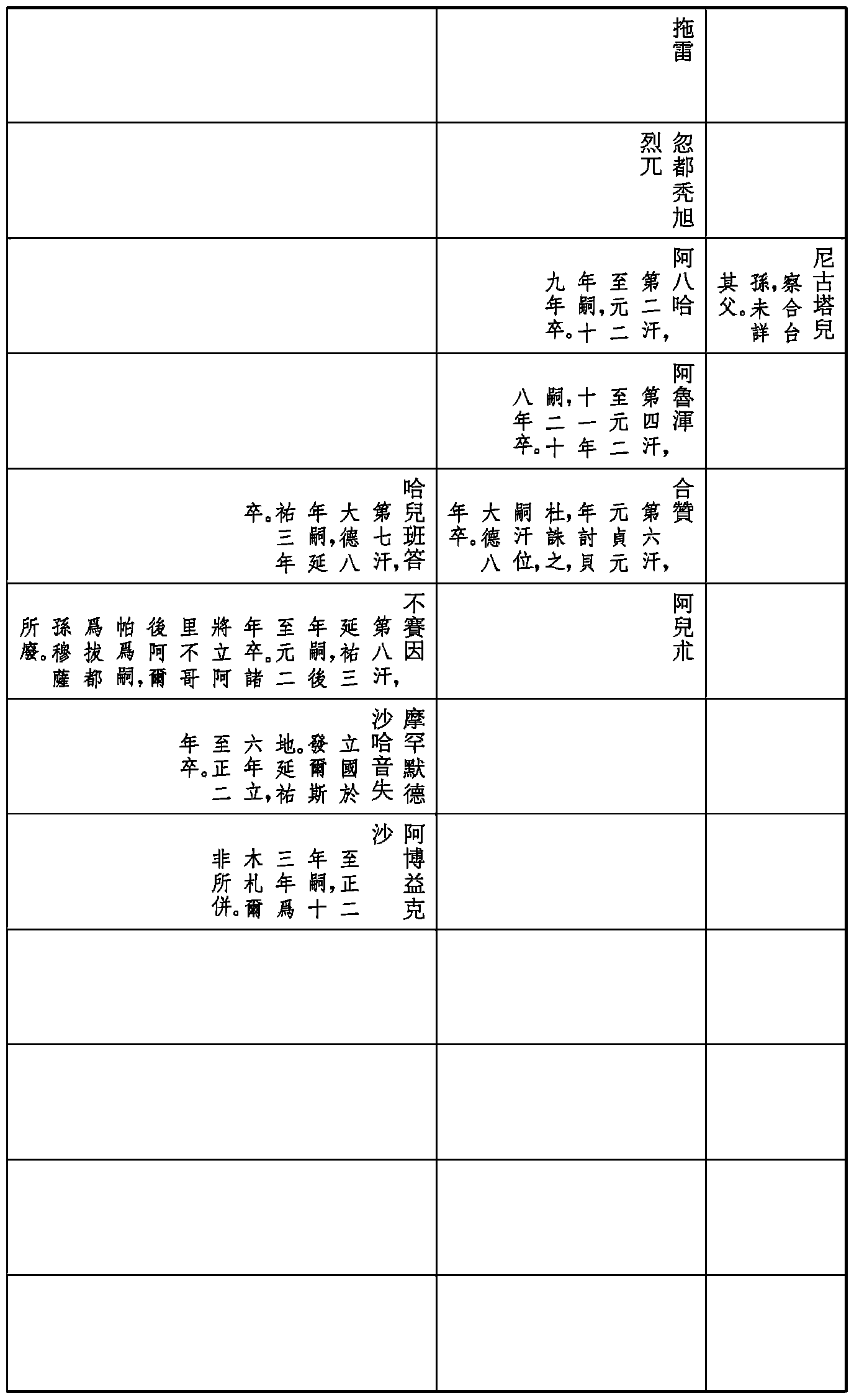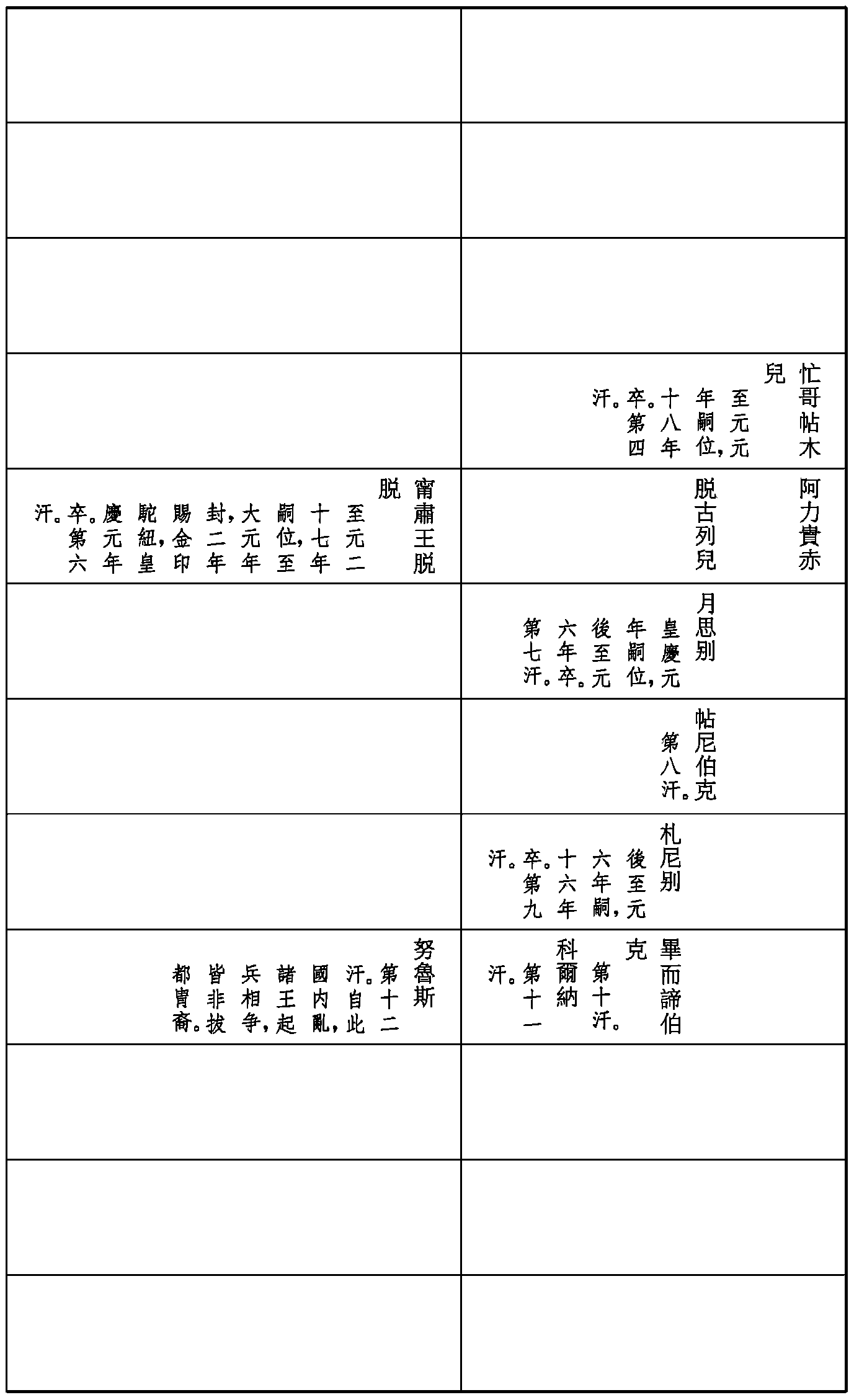 [五]「東乞卜察克」,「東」原作「西」,下各欄及下二「東奇卜察克」同。按此表係鄂爾達世系,鄂爾達既稱東奇卜察克,其子孫亦當同稱「東」,不應稱「西」。「西奇卜察克」指拔都一系,此顯係誤置,因改。下同改。