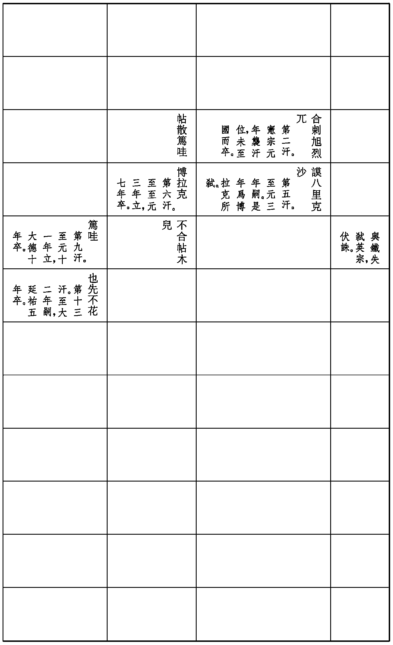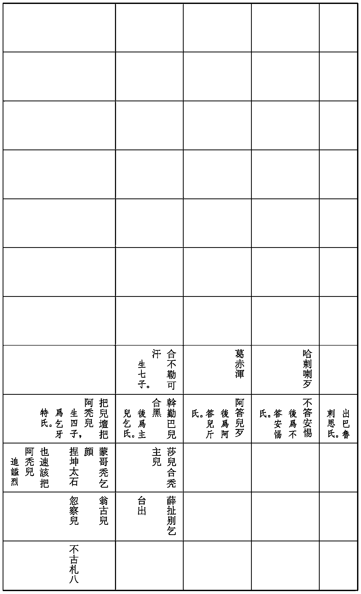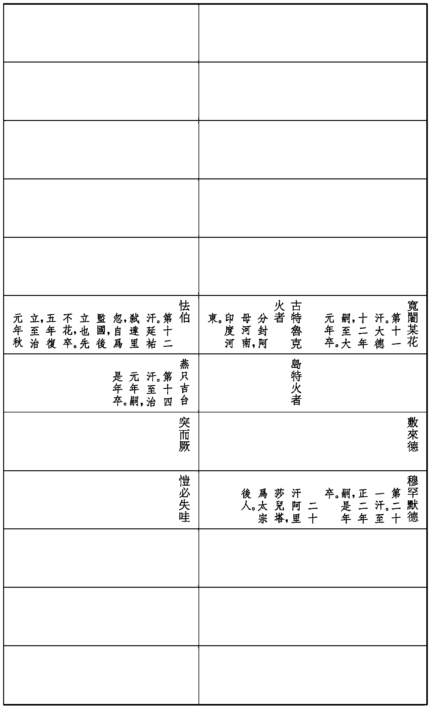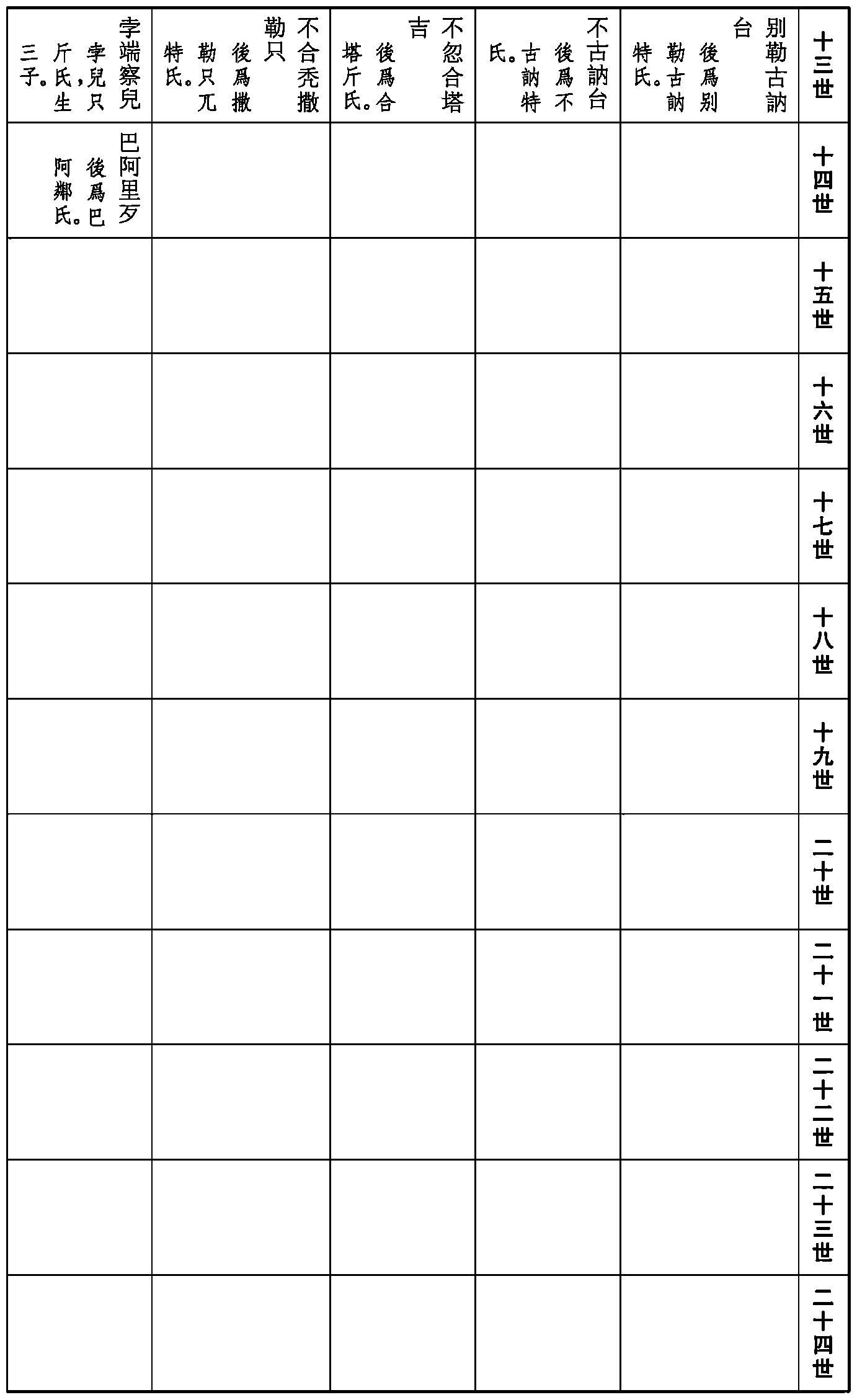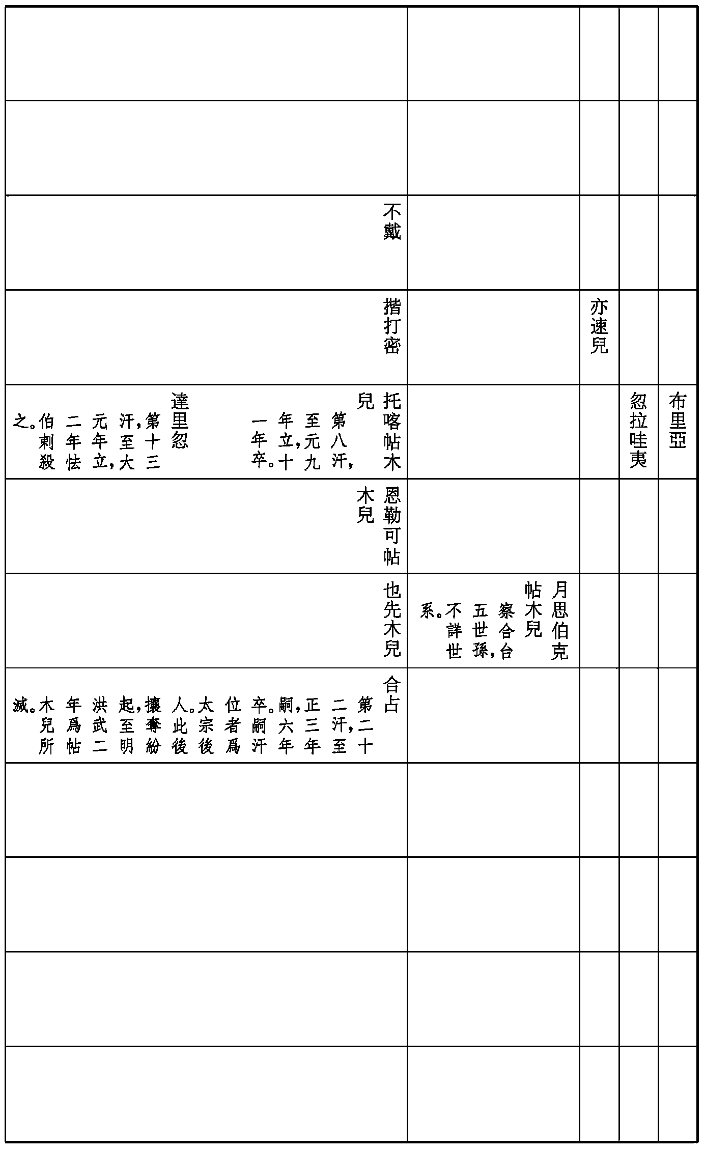 [五]「東乞卜察克」,「東」原作「西」,下各欄及下二「東奇卜察克」同。按此表係鄂爾達世系,鄂爾達既稱東奇卜察克,其子孫亦當同稱「東」,不應稱「西」。「西奇卜察克」指拔都一系,此顯係誤置,因改。下同改。