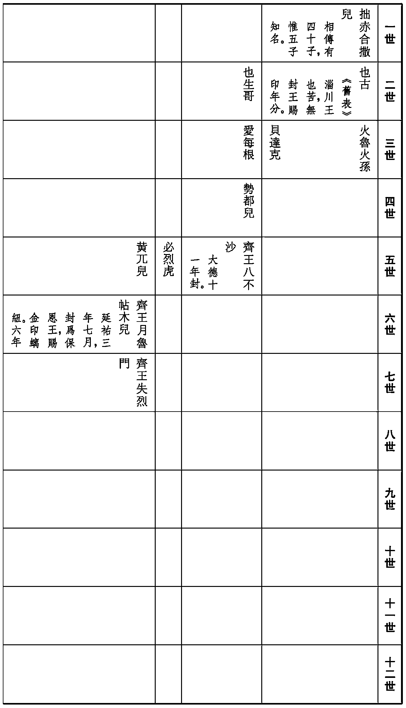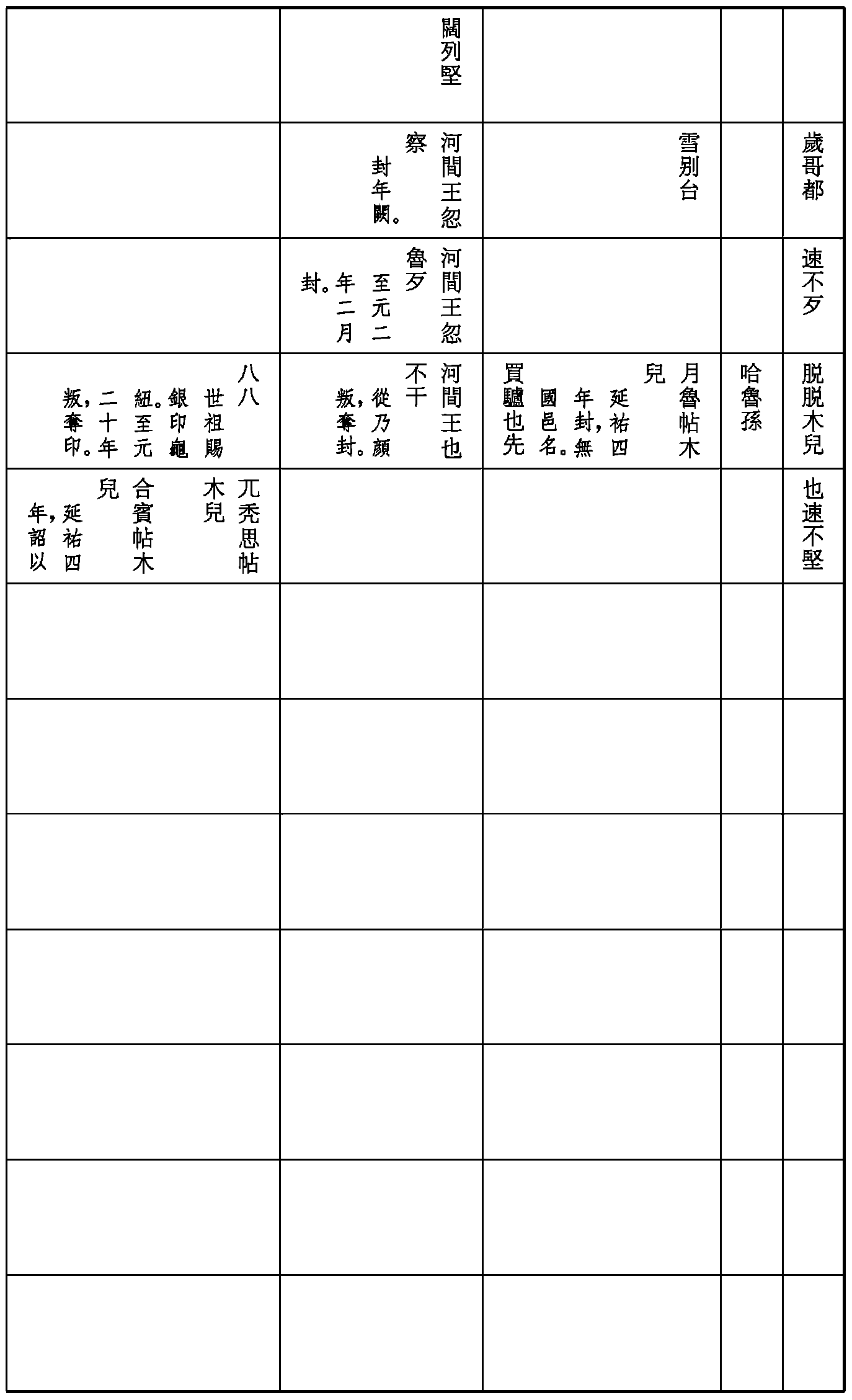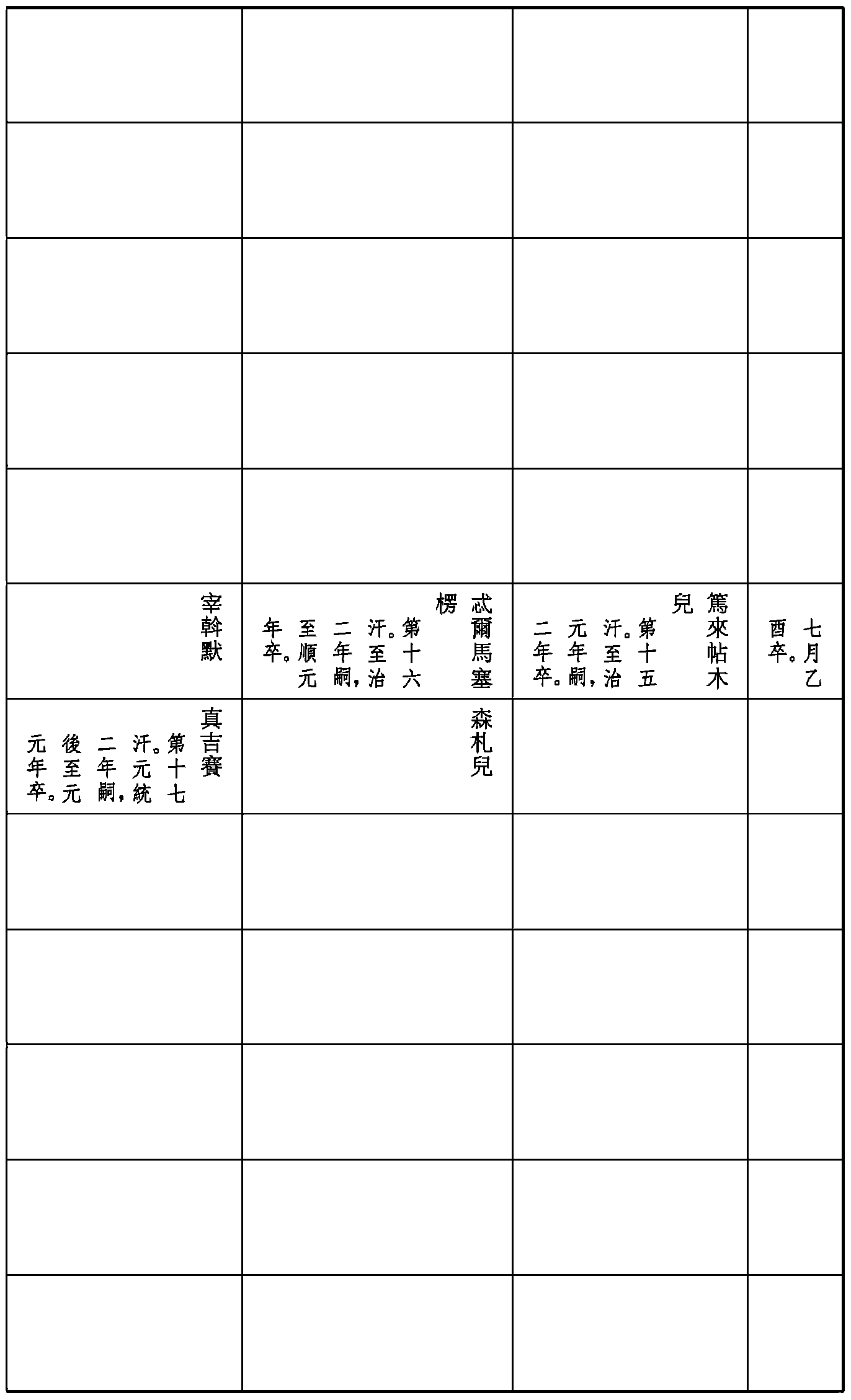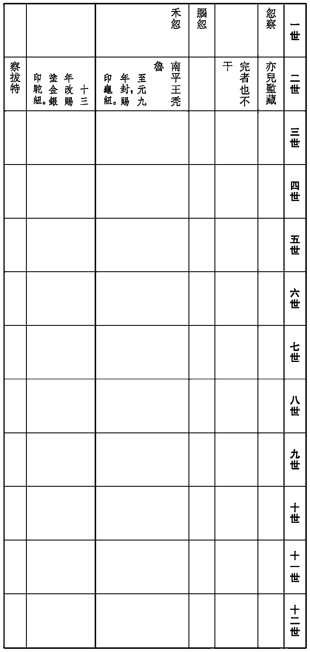 [五]「東乞卜察克」,「東」原作「西」,下各欄及下二「東奇卜察克」同。按此表係鄂爾達世系,鄂爾達既稱東奇卜察克,其子孫亦當同稱「東」,不應稱「西」。「西奇卜察克」指拔都一系,此顯係誤置,因改。下同改。