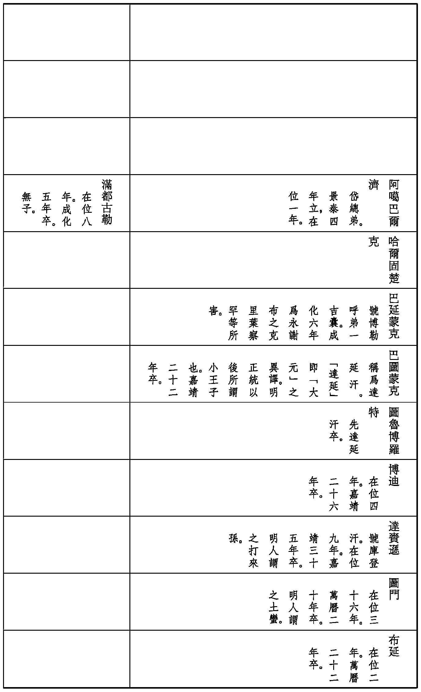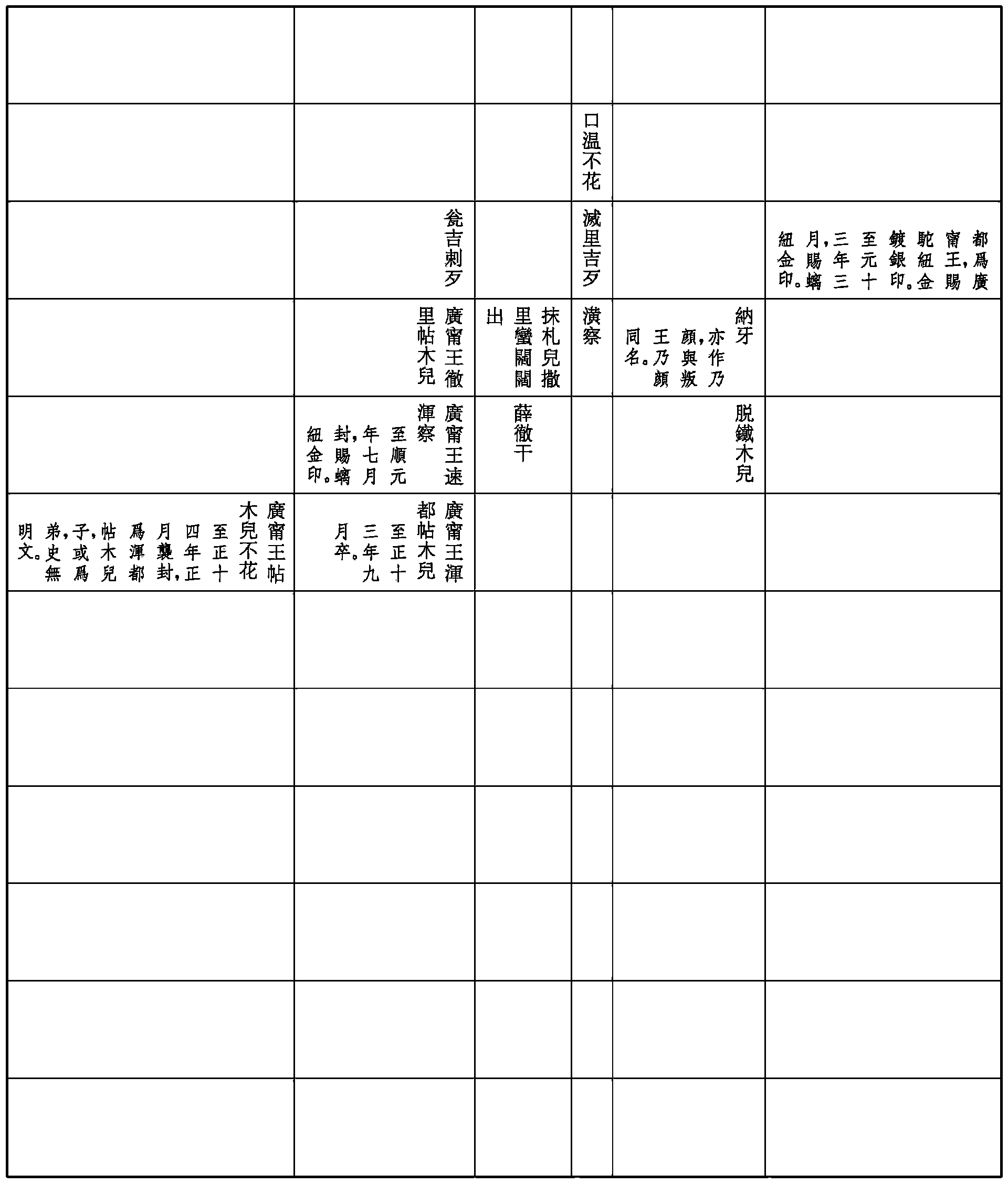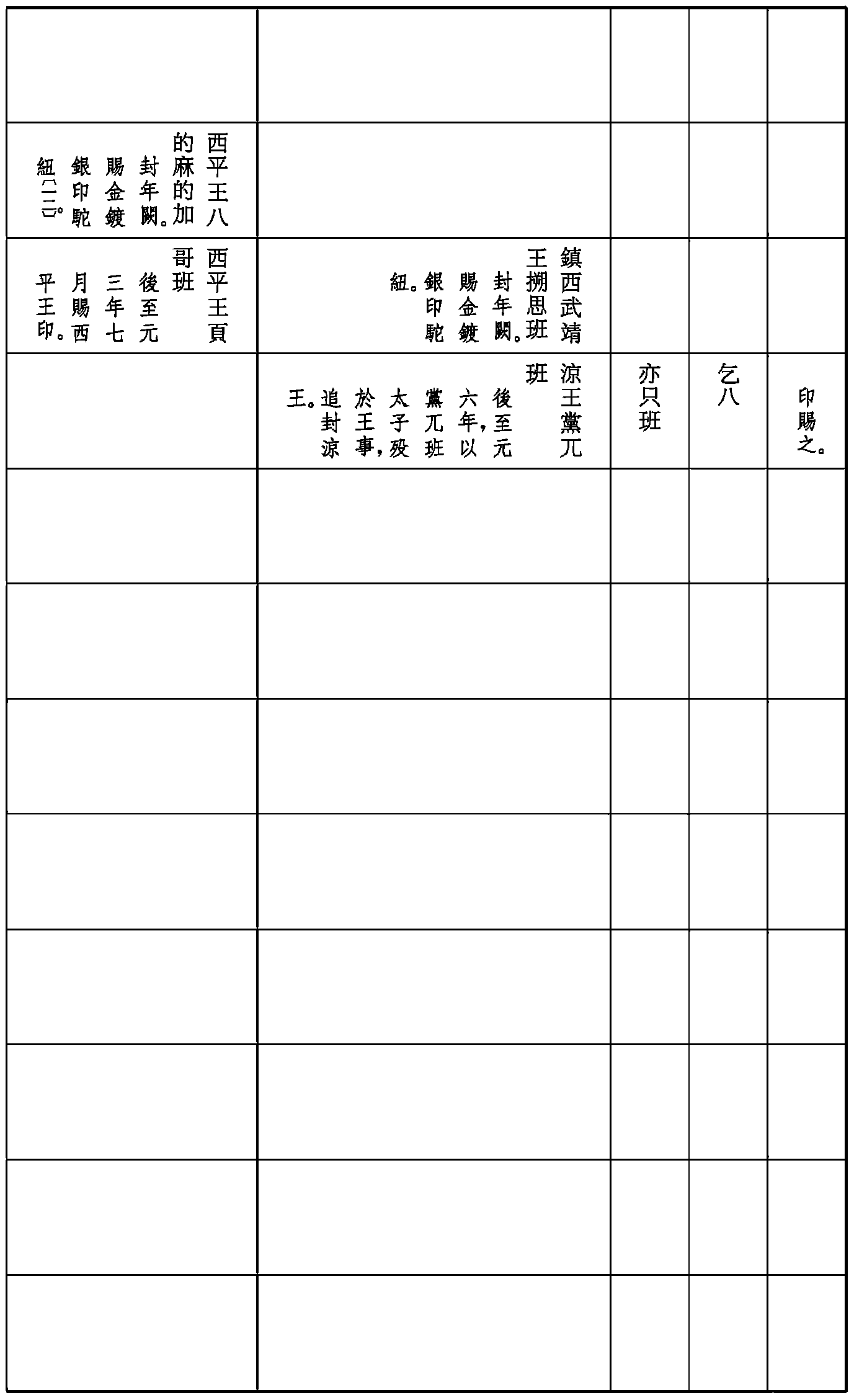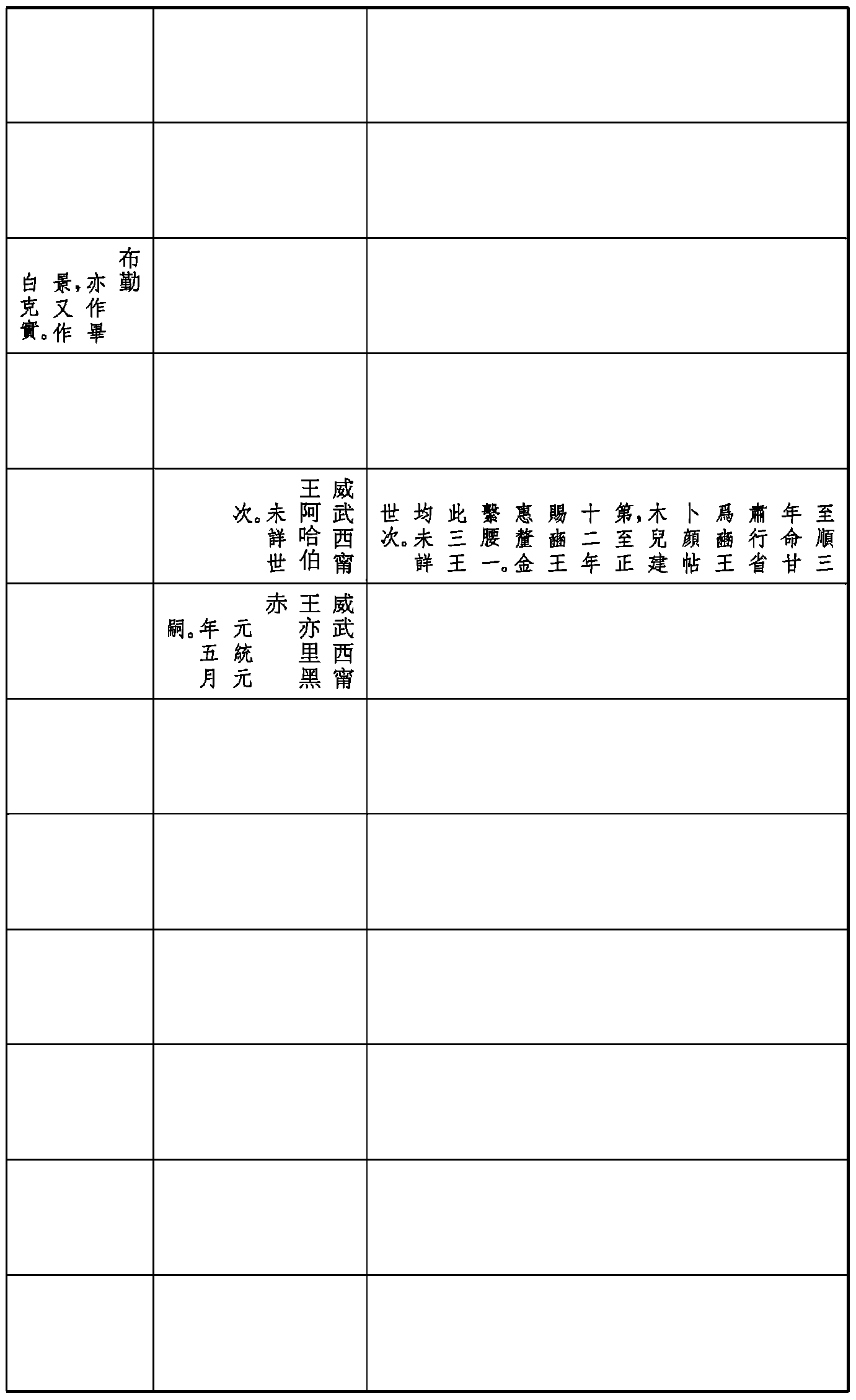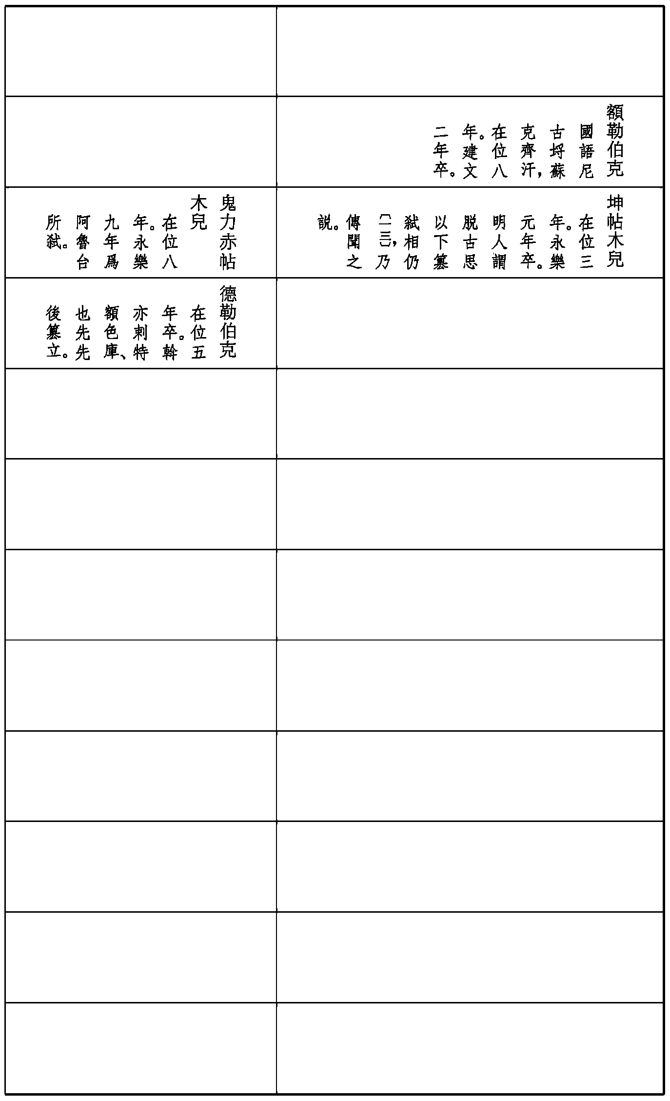 [五]「東乞卜察克」,「東」原作「西」,下各欄及下二「東奇卜察克」同。按此表係鄂爾達世系,鄂爾達既稱東奇卜察克,其子孫亦當同稱「東」,不應稱「西」。「西奇卜察克」指拔都一系,此顯係誤置,因改。下同改。