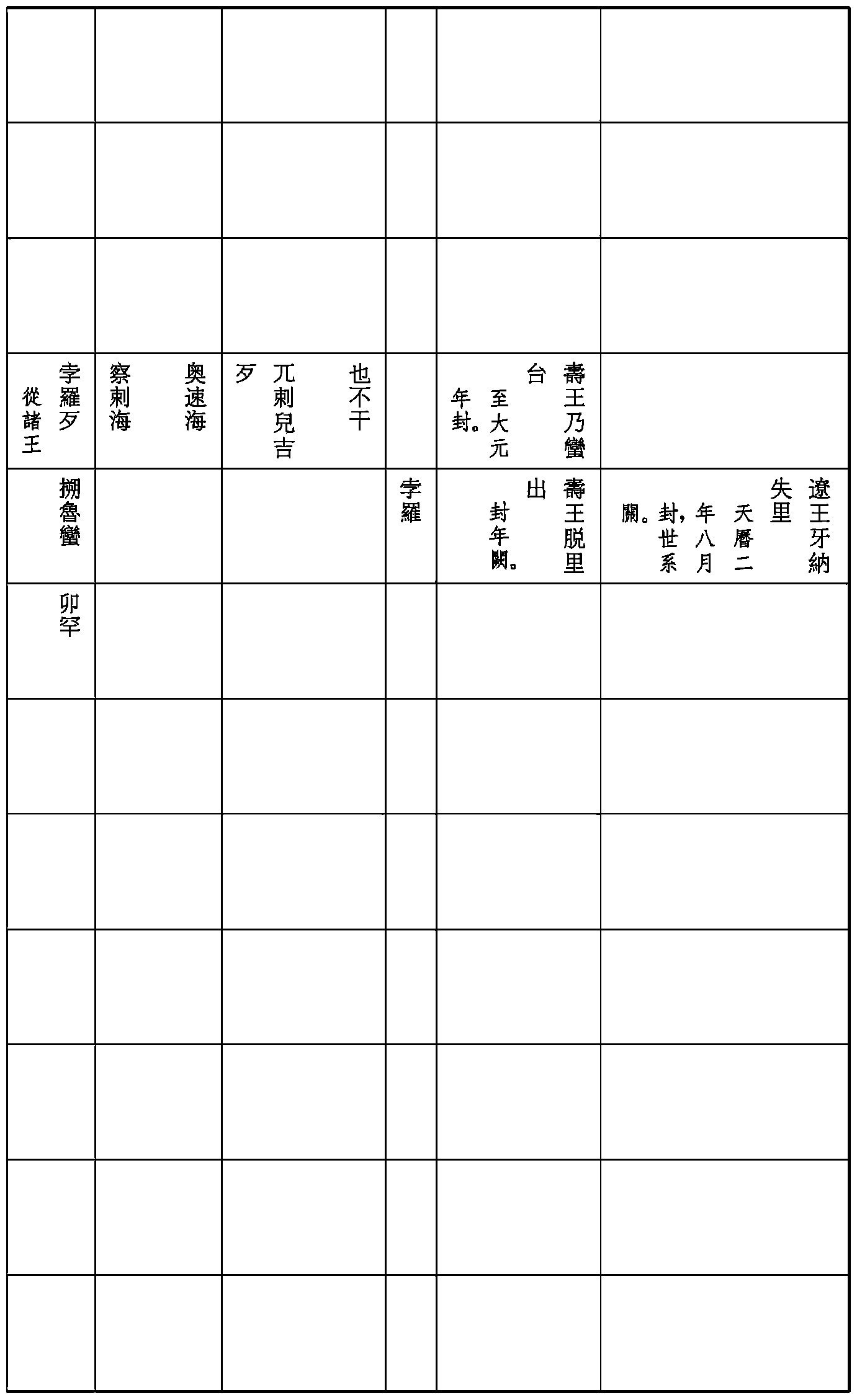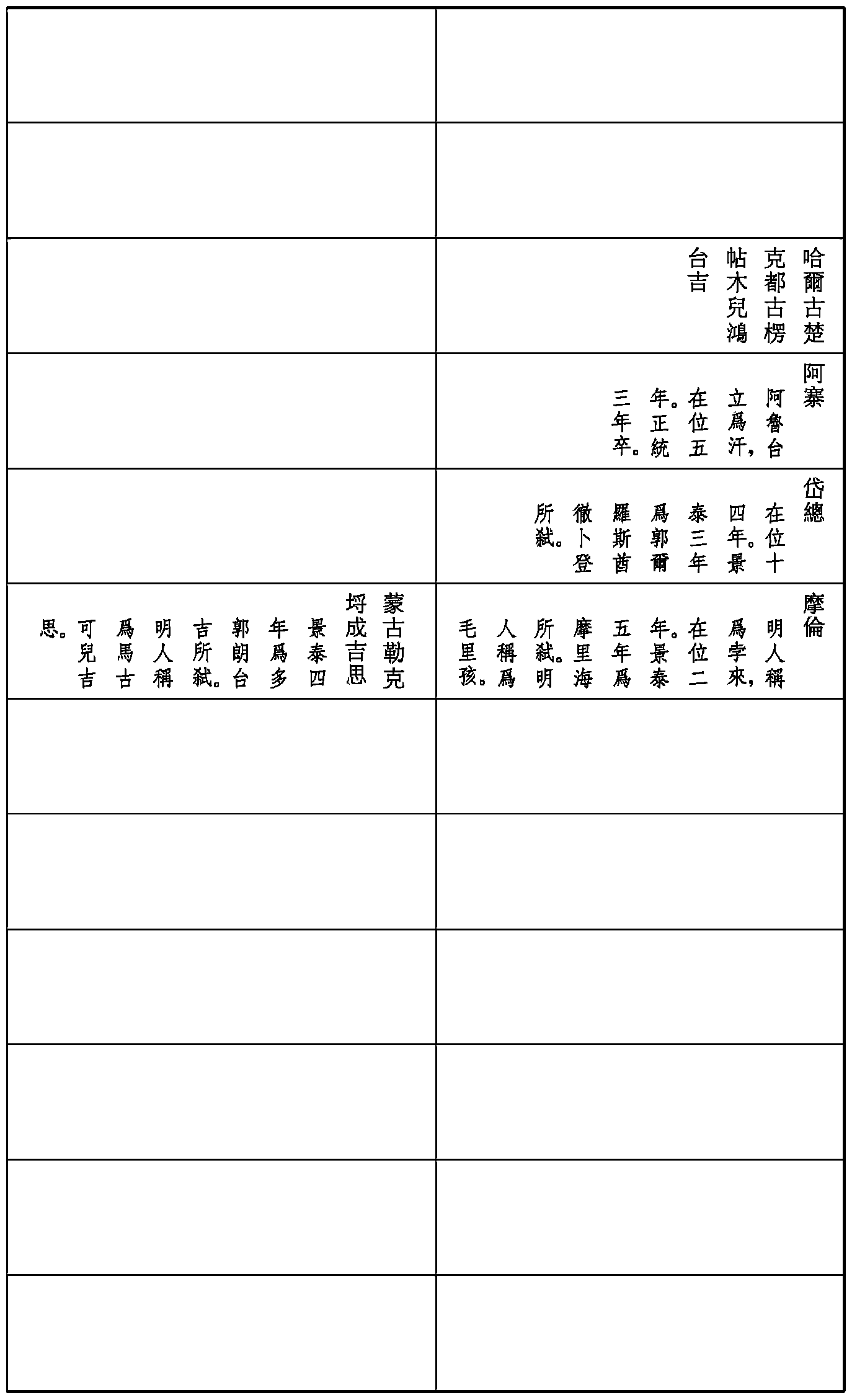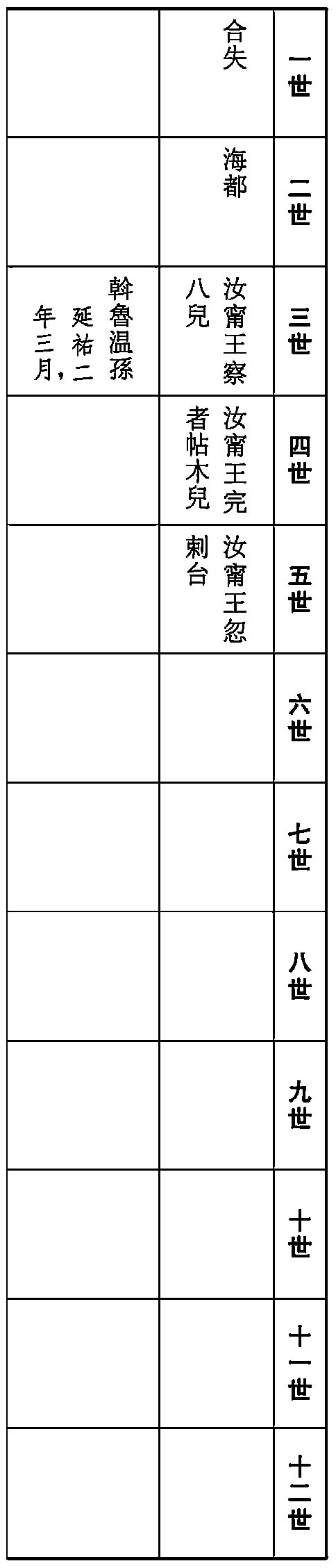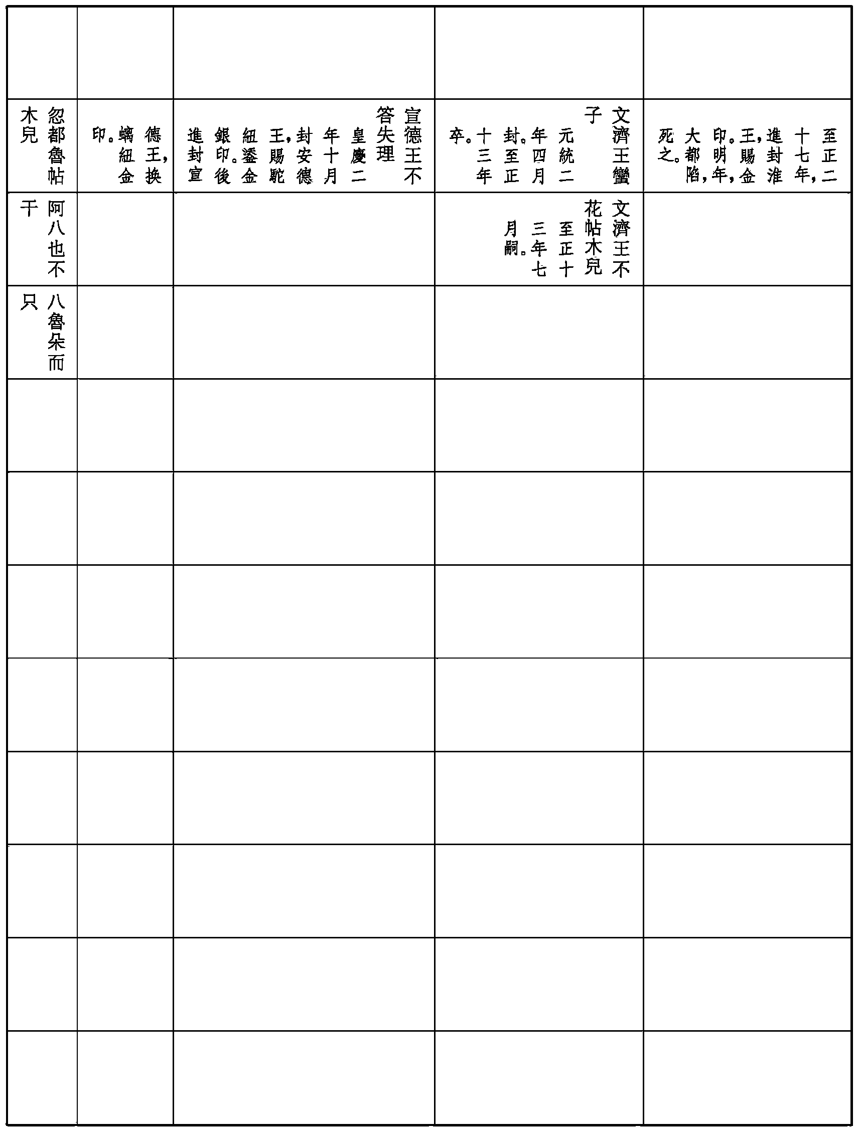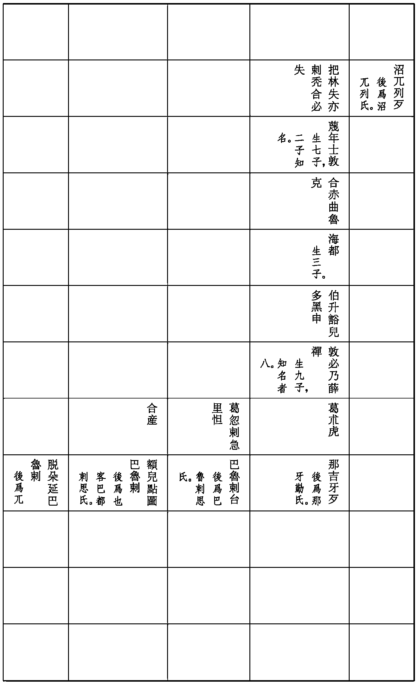 [五]「東乞卜察克」,「東」原作「西」,下各欄及下二「東奇卜察克」同。按此表係鄂爾達世系,鄂爾達既稱東奇卜察克,其子孫亦當同稱「東」,不應稱「西」。「西奇卜察克」指拔都一系,此顯係誤置,因改。下同改。