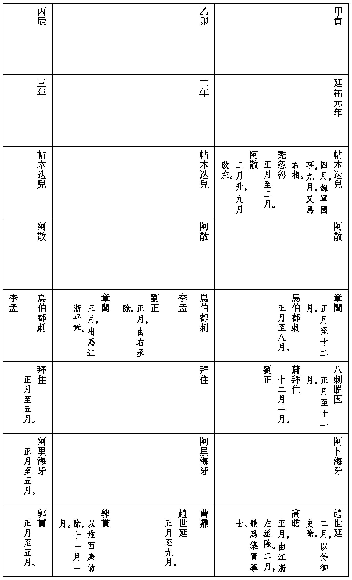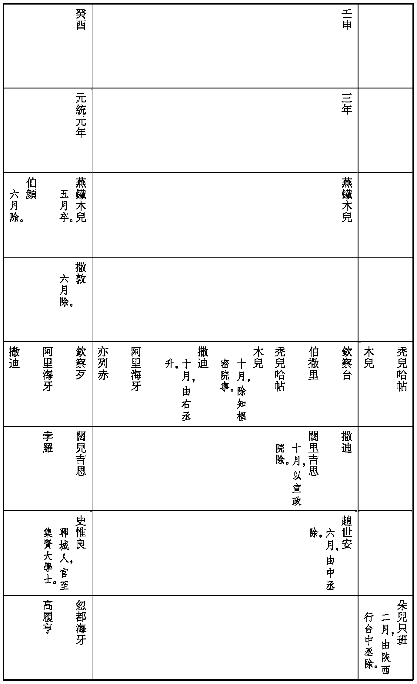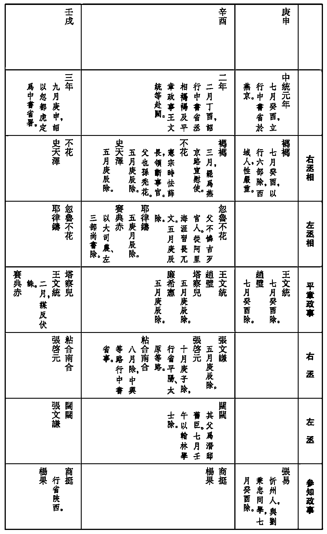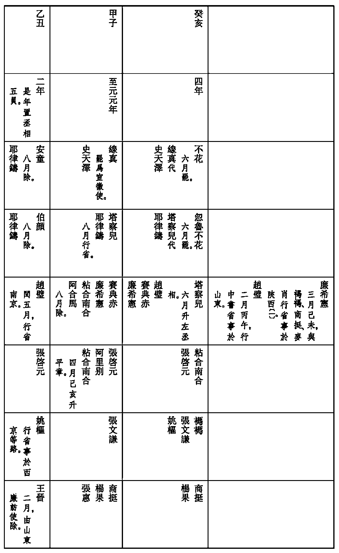 太宗立中書省,以耶律楚材爲令,粘合重山、鎮海爲左右丞相。楚材卒,楊惟中代之。惟中卒,不復置令。憲宗又罷左右丞相不置。至世祖始立行中書省於燕京,旋改中書省,置左右丞相、平章政事、左右丞、參知政事,凡四等。成宗定左右丞相以下平章政事二員、左右丞各一員、參知政事二員,爲八府。自後雖有增益,然祖宗之制不敢踰也。至正以來,武夫悍卒躐登宰執多至三四十人,省臣之選始濫矣。夫中書,政本也,就其人之賢不肖以考其政之治亂得失,猶立表測景,未有不相應者也。作《宰相年表》。