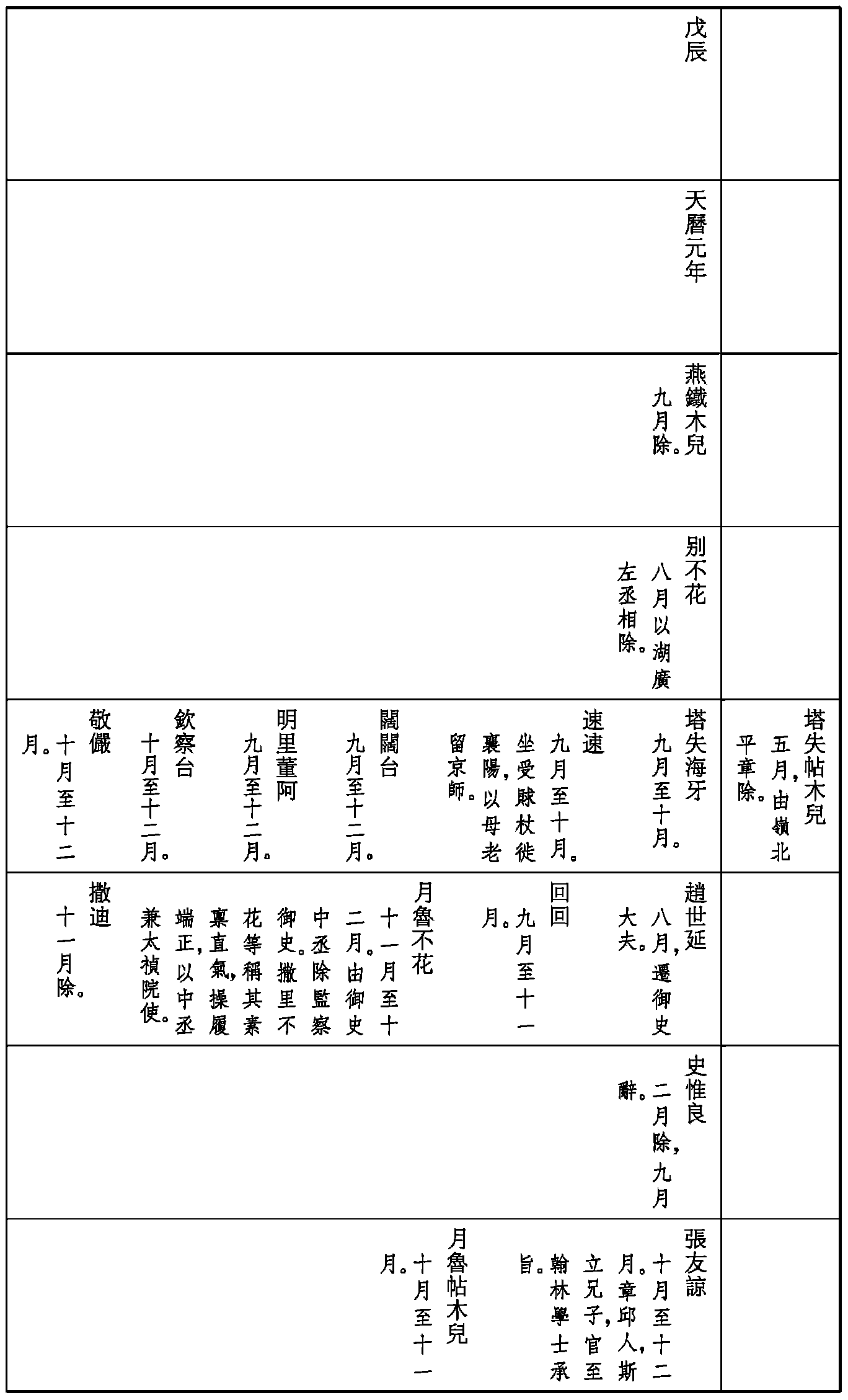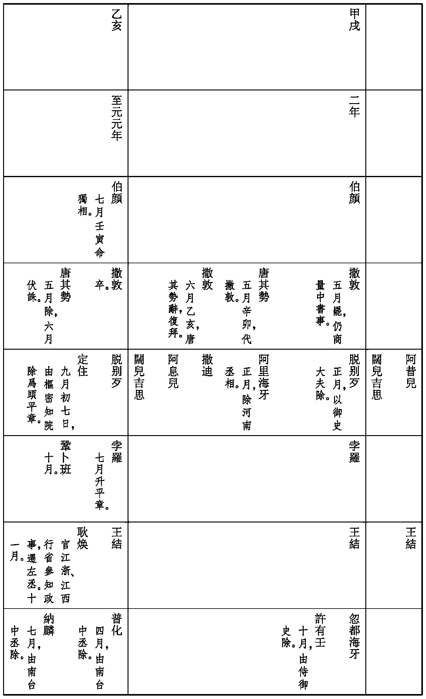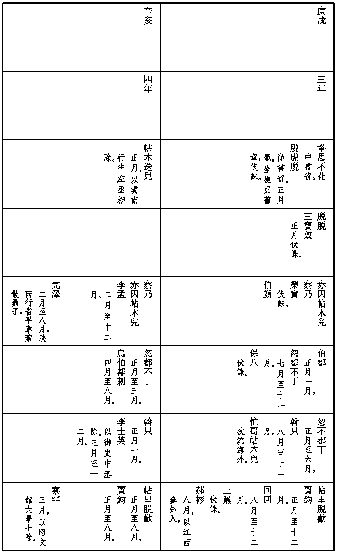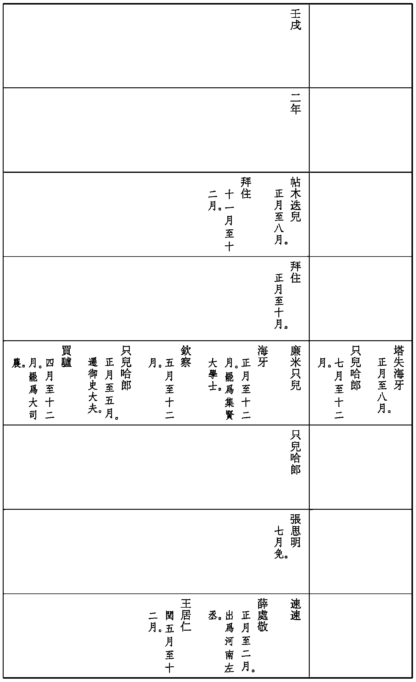 太宗立中書省,以耶律楚材爲令,粘合重山、鎮海爲左右丞相。楚材卒,楊惟中代之。惟中卒,不復置令。憲宗又罷左右丞相不置。至世祖始立行中書省於燕京,旋改中書省,置左右丞相、平章政事、左右丞、參知政事,凡四等。成宗定左右丞相以下平章政事二員、左右丞各一員、參知政事二員,爲八府。自後雖有增益,然祖宗之制不敢踰也。至正以來,武夫悍卒躐登宰執多至三四十人,省臣之選始濫矣。夫中書,政本也,就其人之賢不肖以考其政之治亂得失,猶立表測景,未有不相應者也。作《宰相年表》。