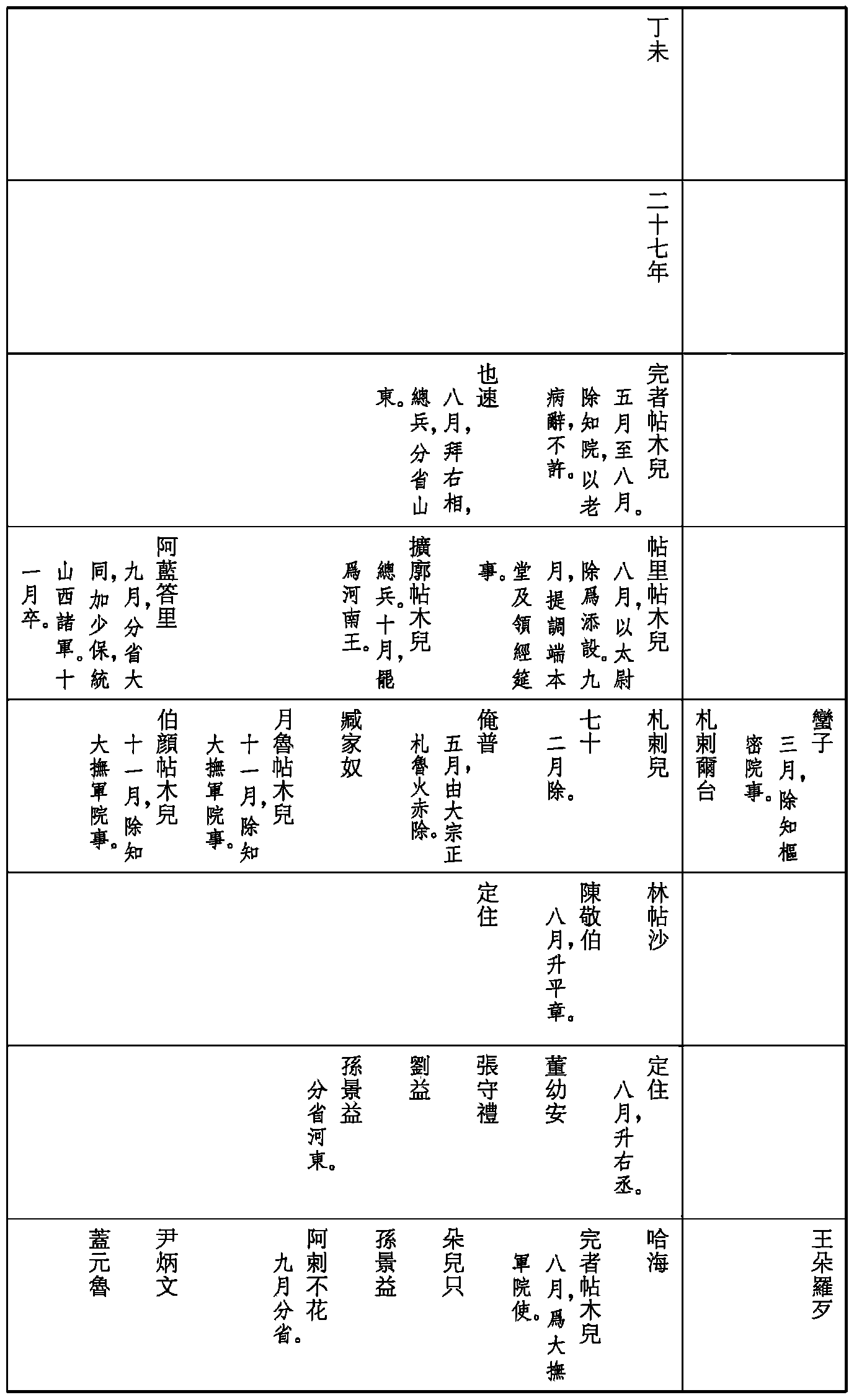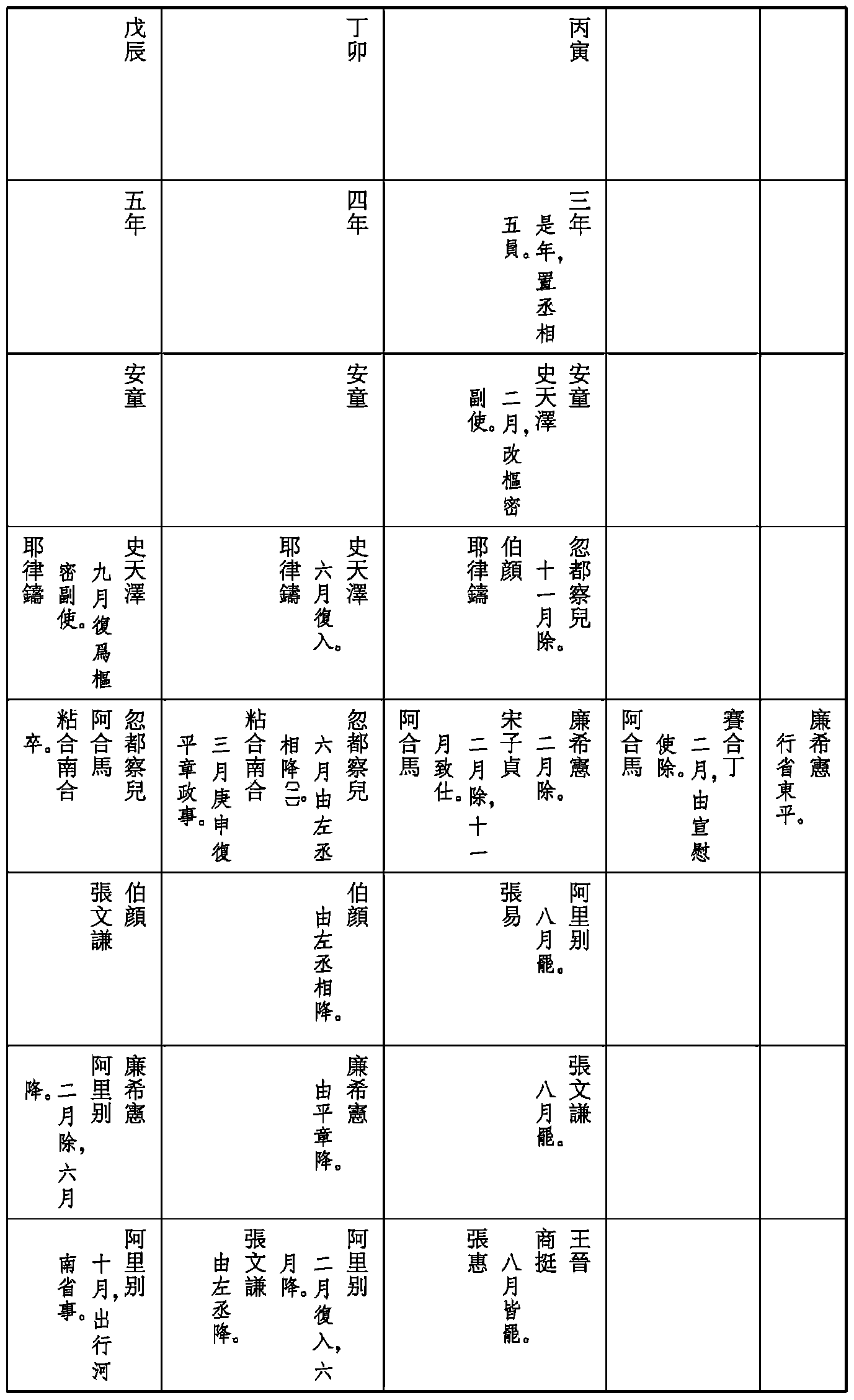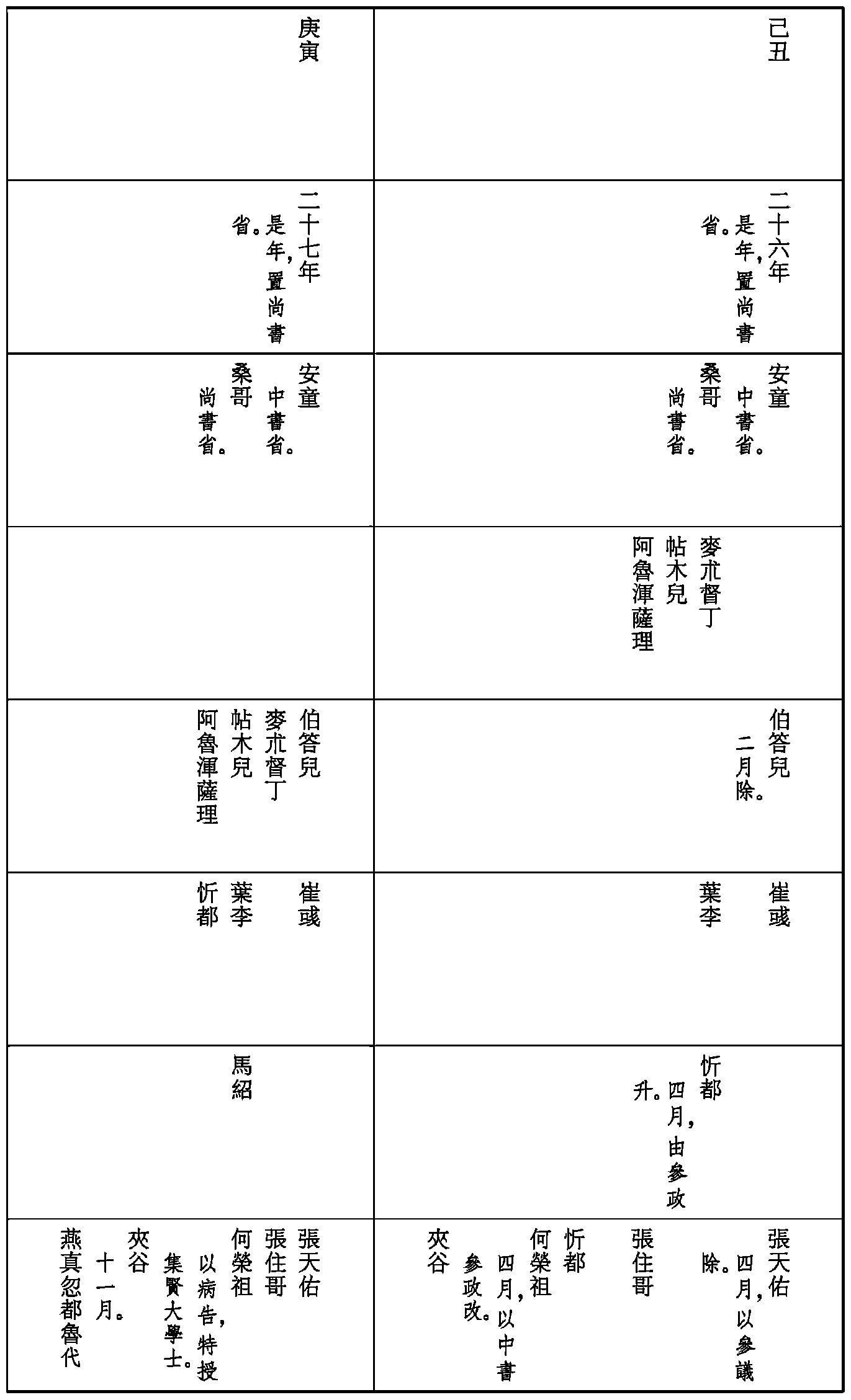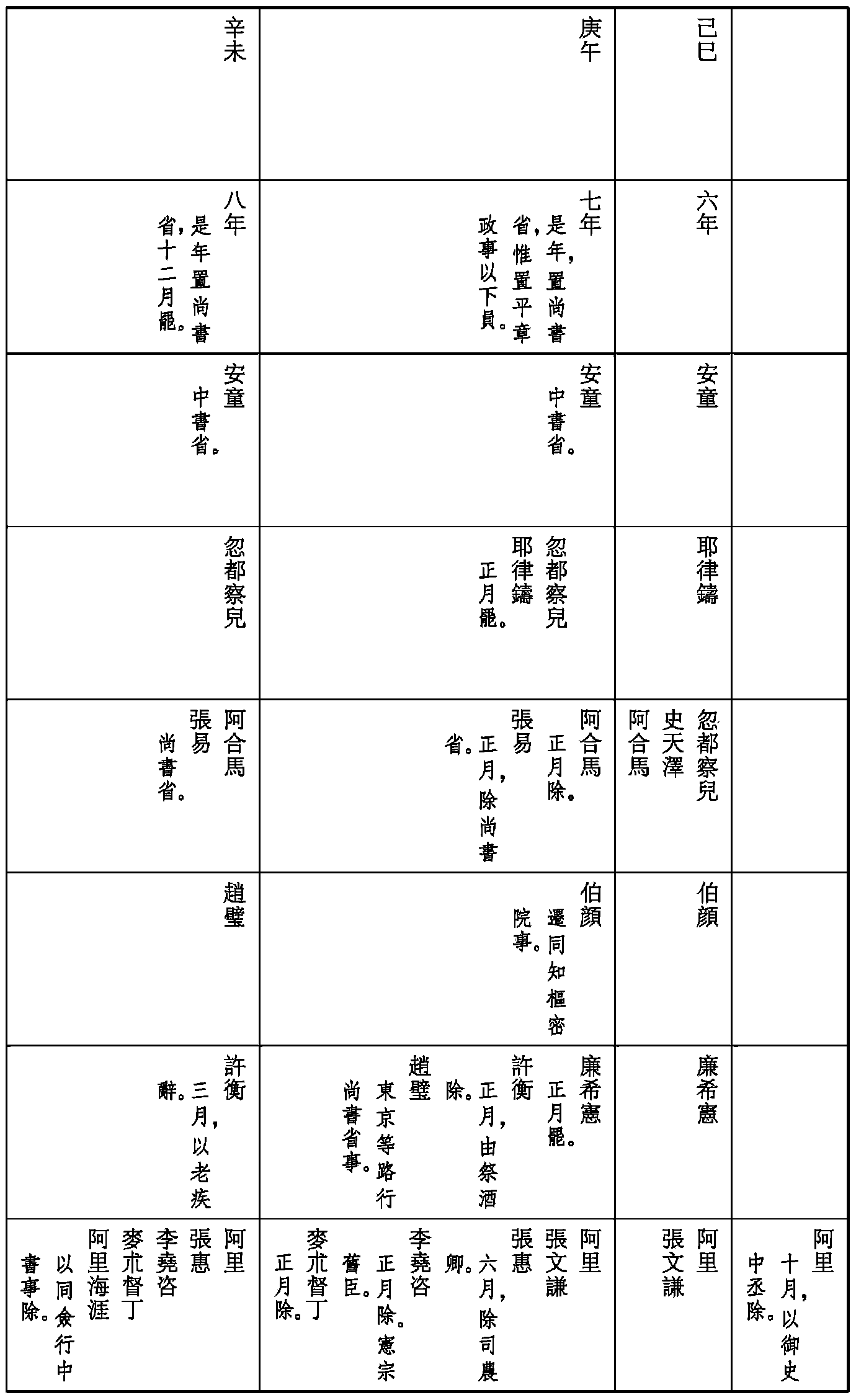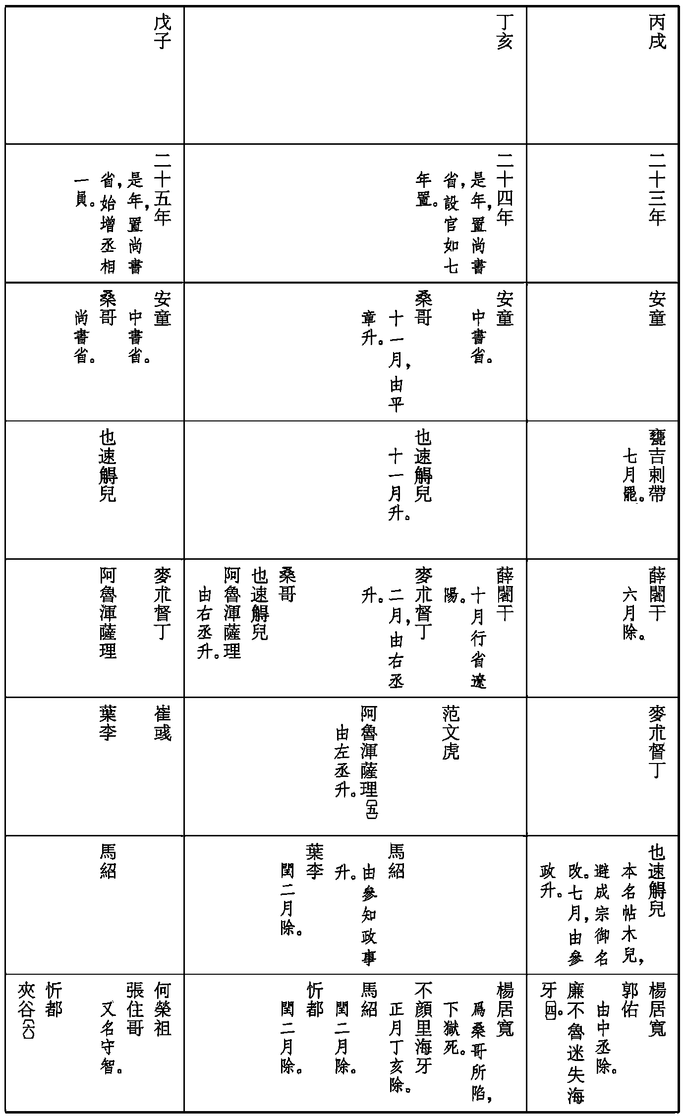 [一〇]「三月免署商議省事」,「署商議省事」五字原誤在下欄「咱喜魯丁」下。按《元史》卷一七本紀第十七《世祖十四》載「平章政事麥朮丁以久居其任,乞令免署,惟食其禄,與商議中書省事」,今據以移正。