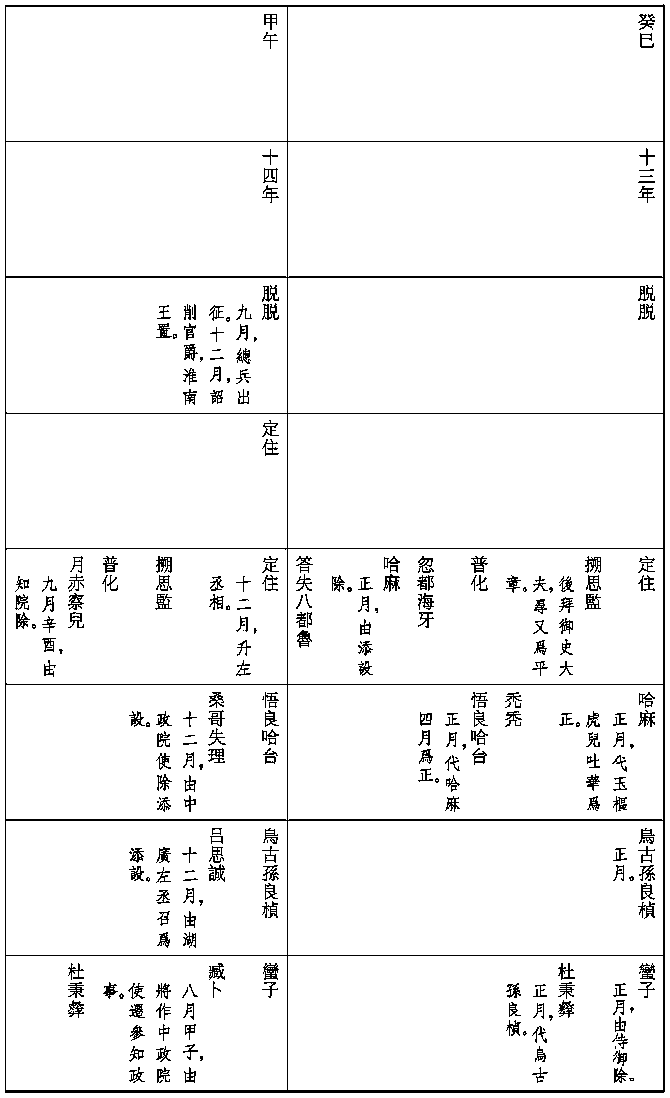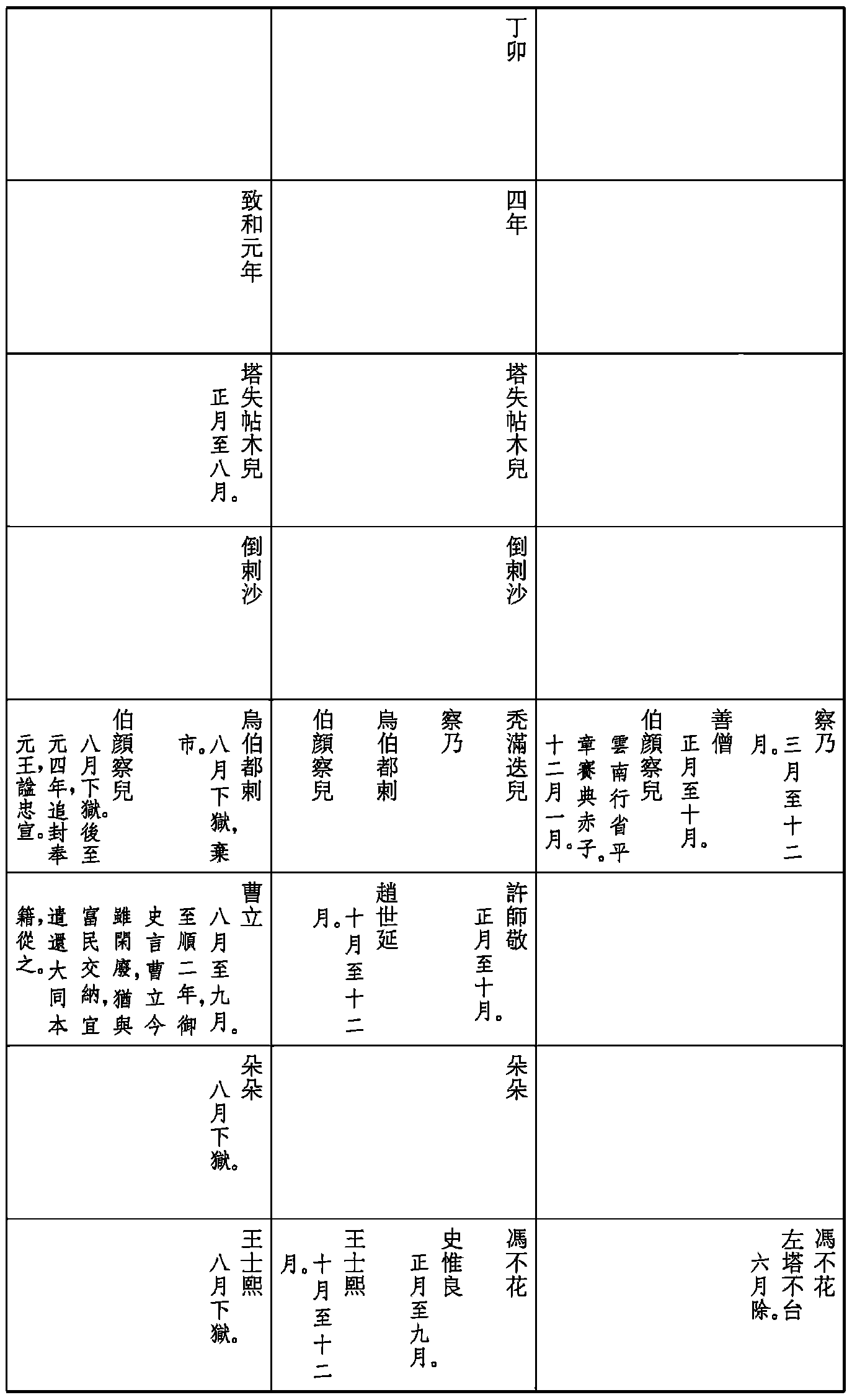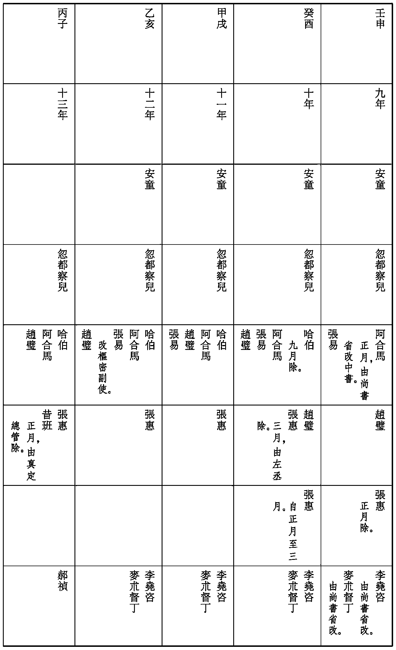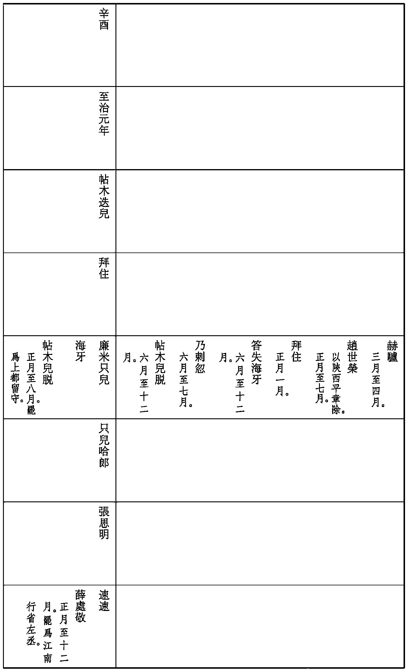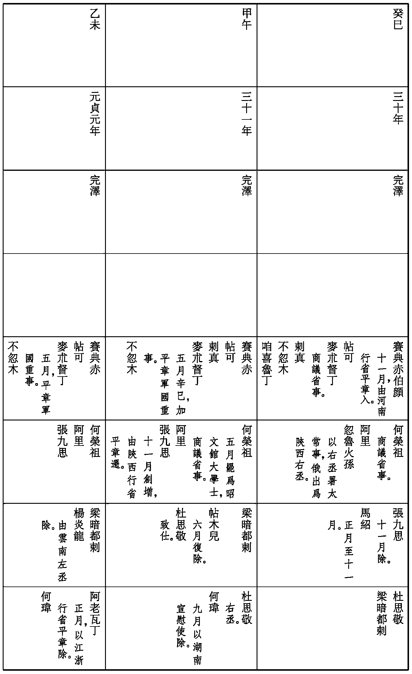 [一〇]「三月免署商議省事」,「署商議省事」五字原誤在下欄「咱喜魯丁」下。按《元史》卷一七本紀第十七《世祖十四》載「平章政事麥朮丁以久居其任,乞令免署,惟食其禄,與商議中書省事」,今據以移正。