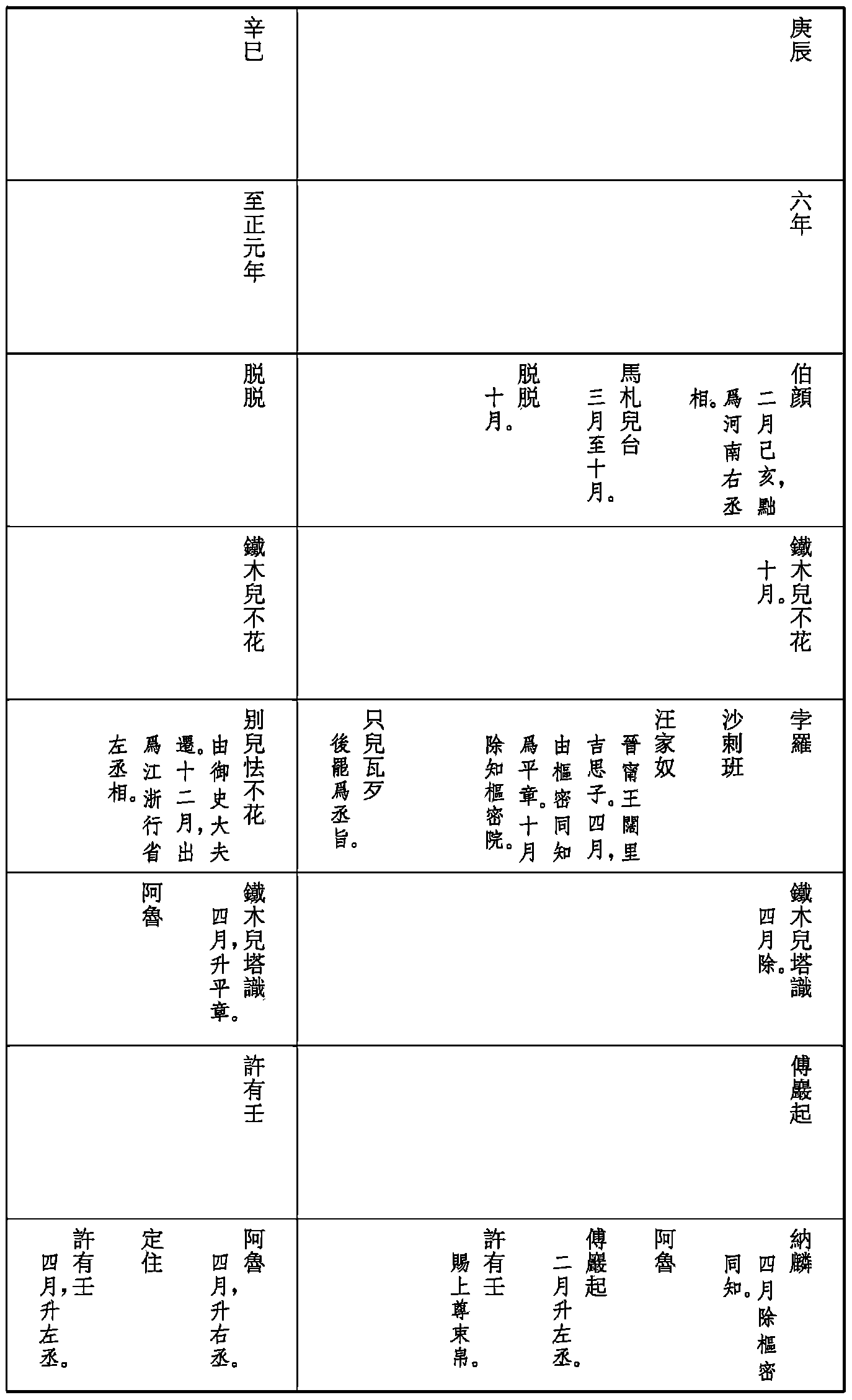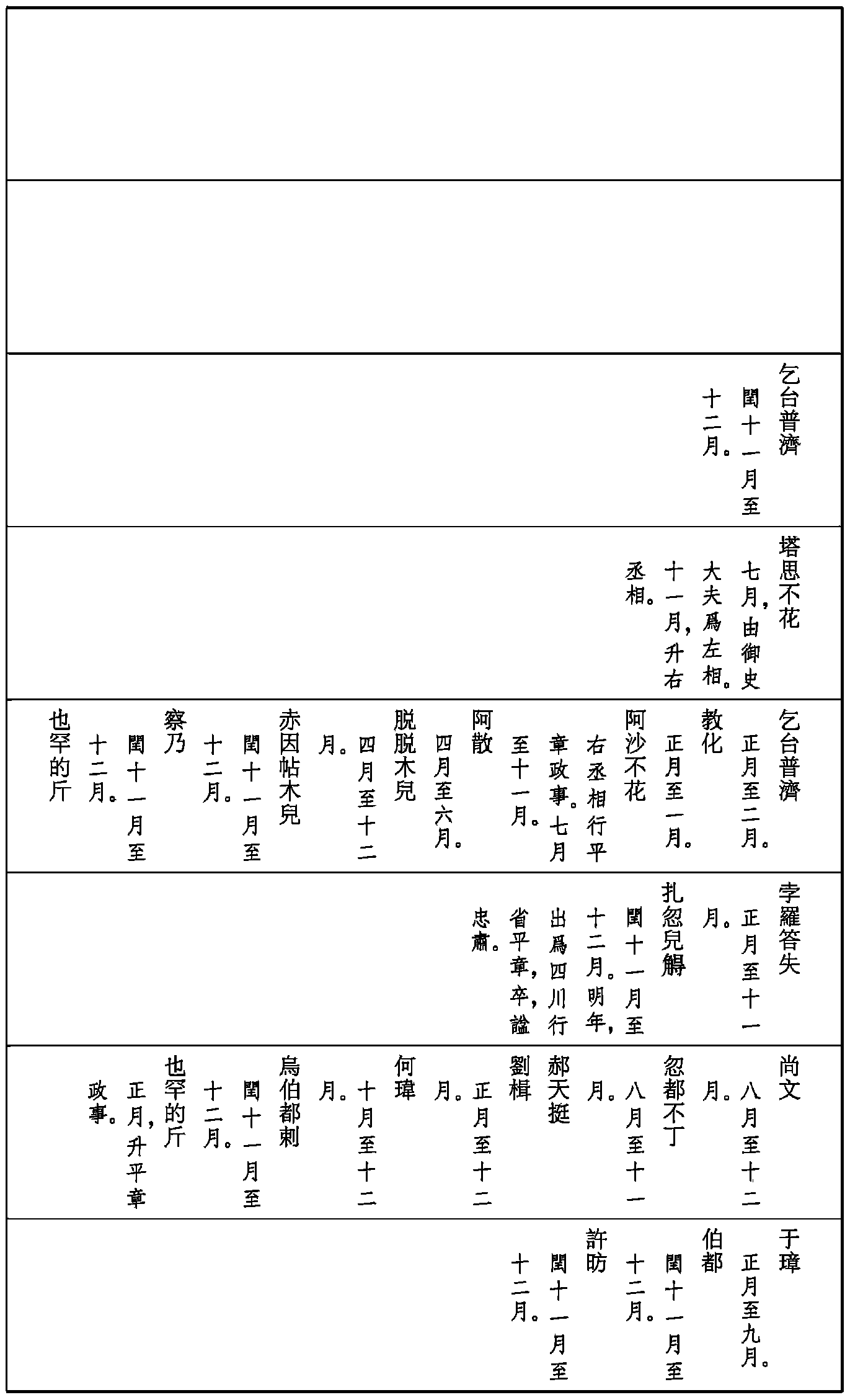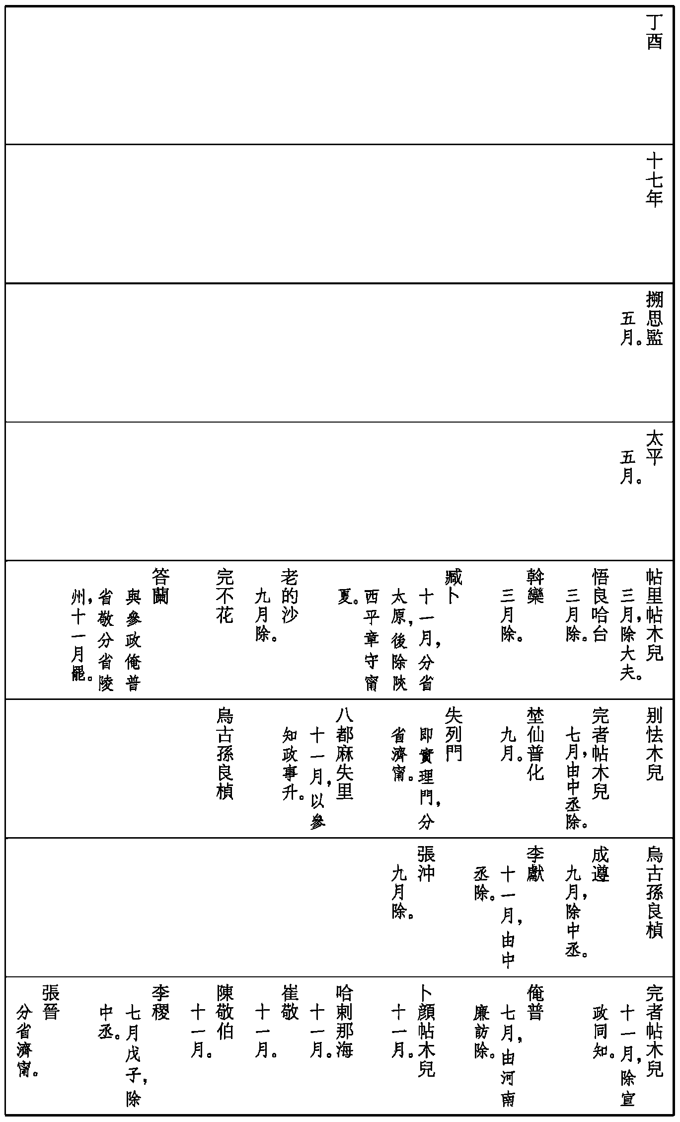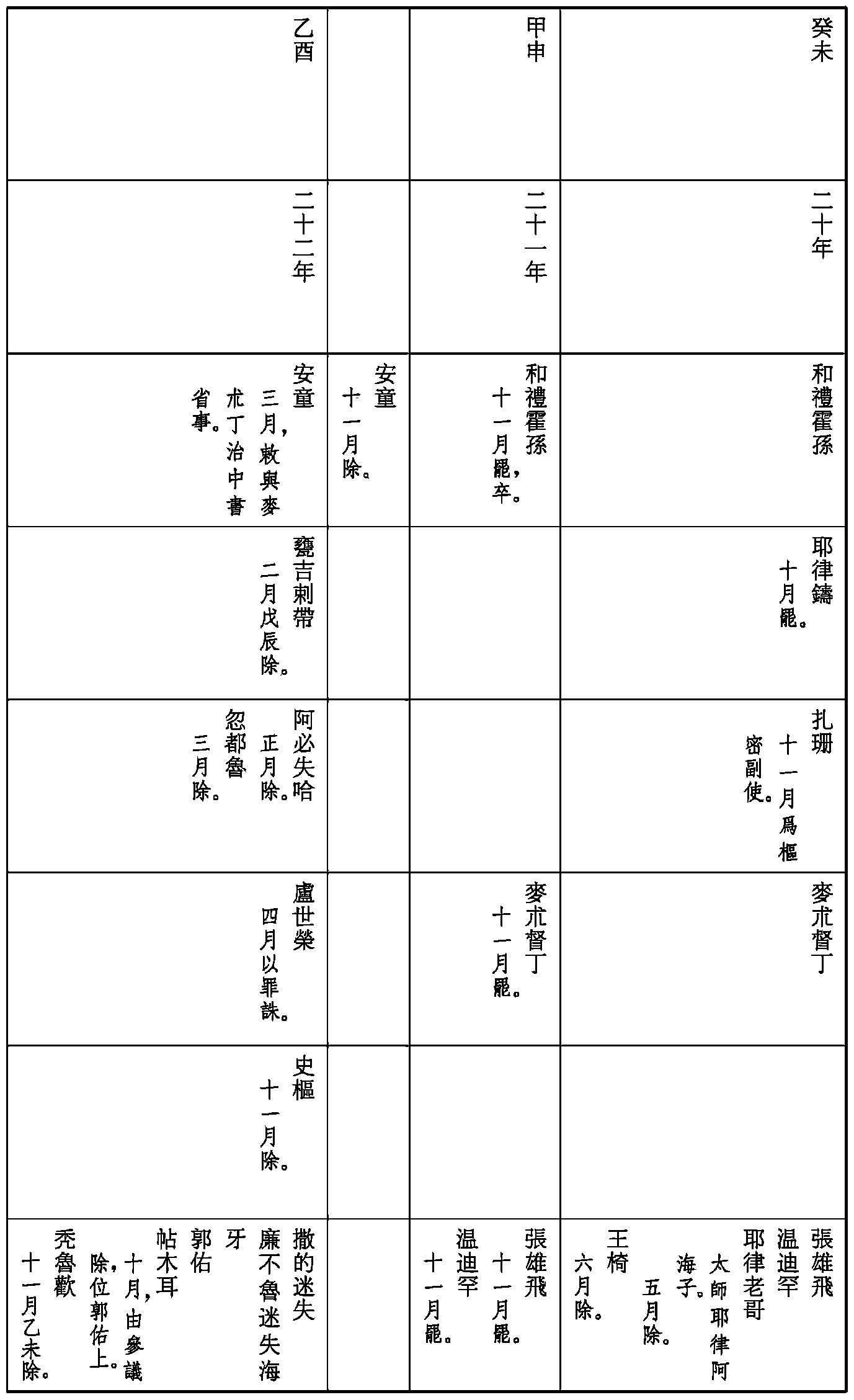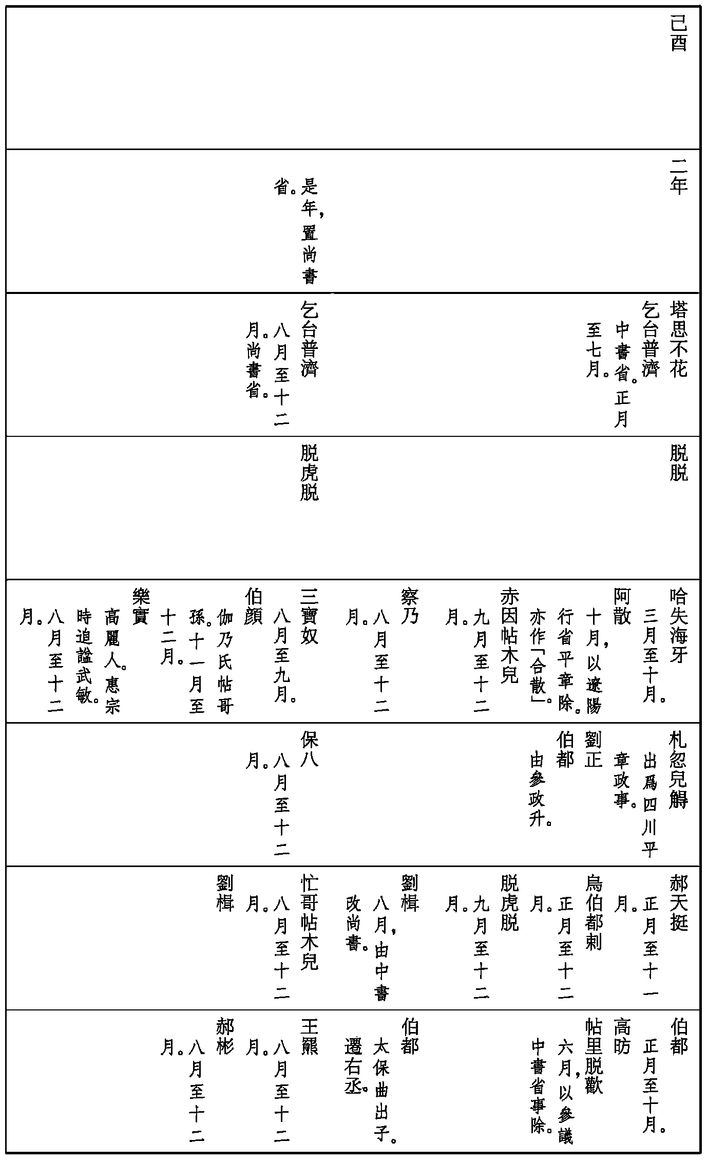 [一〇]「三月免署商議省事」,「署商議省事」五字原誤在下欄「咱喜魯丁」下。按《元史》卷一七本紀第十七《世祖十四》載「平章政事麥朮丁以久居其任,乞令免署,惟食其禄,與商議中書省事」,今據以移正。