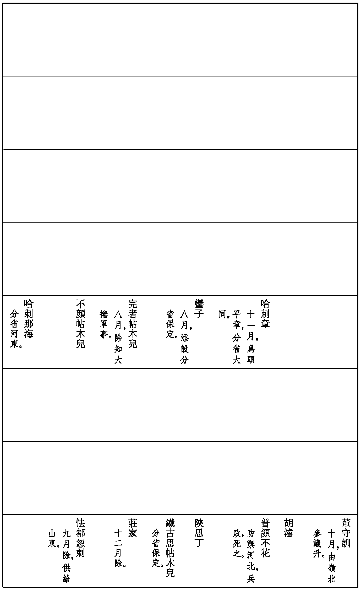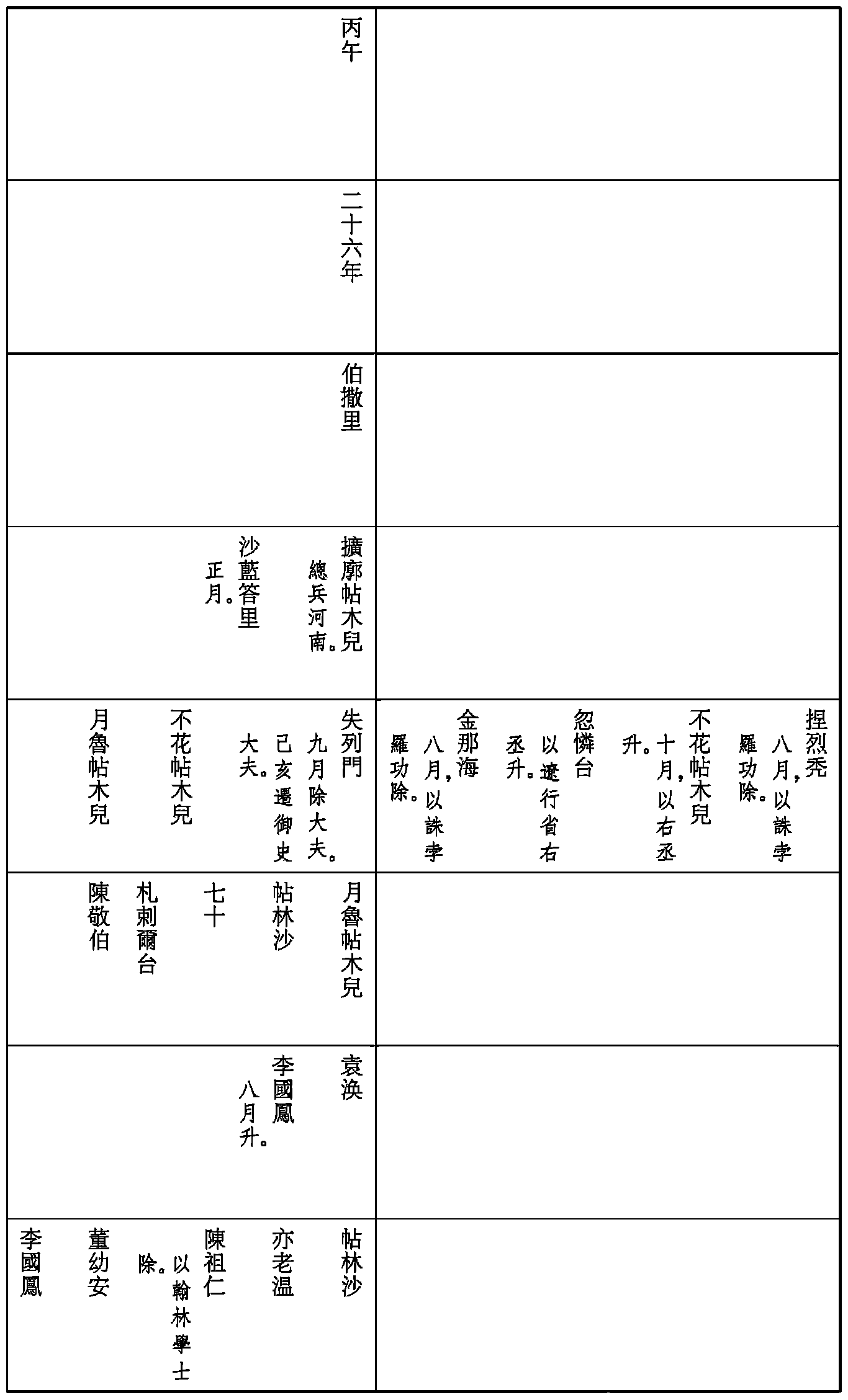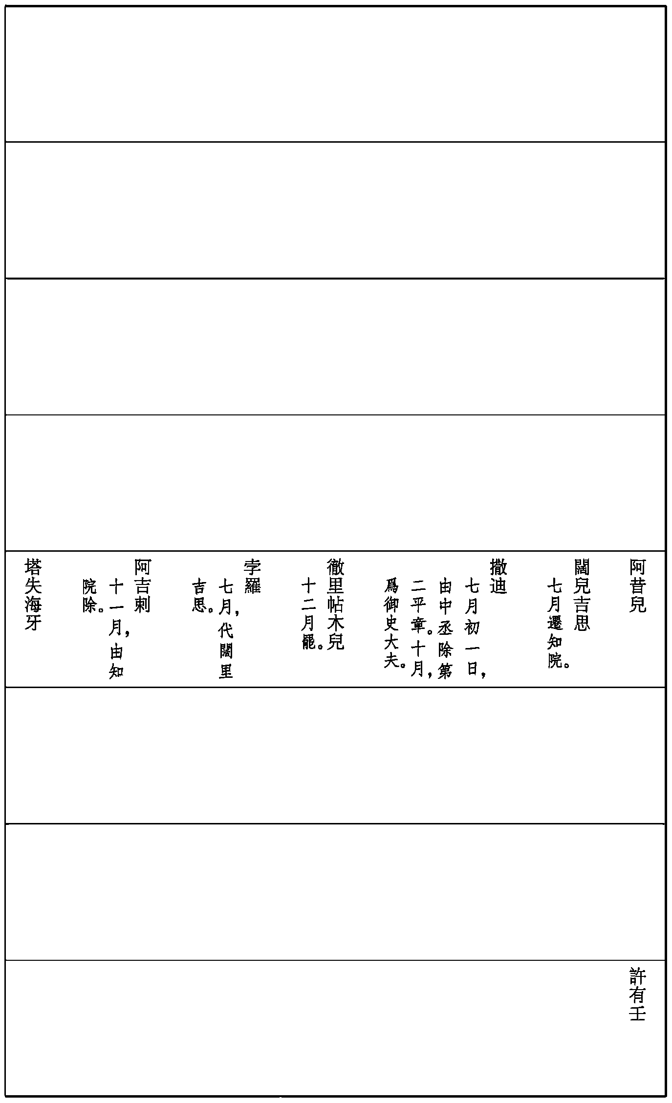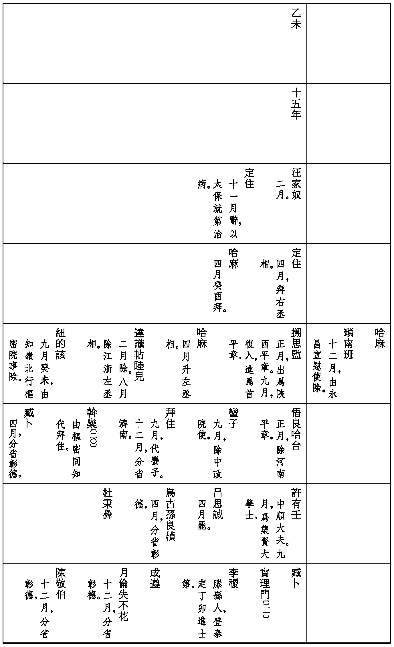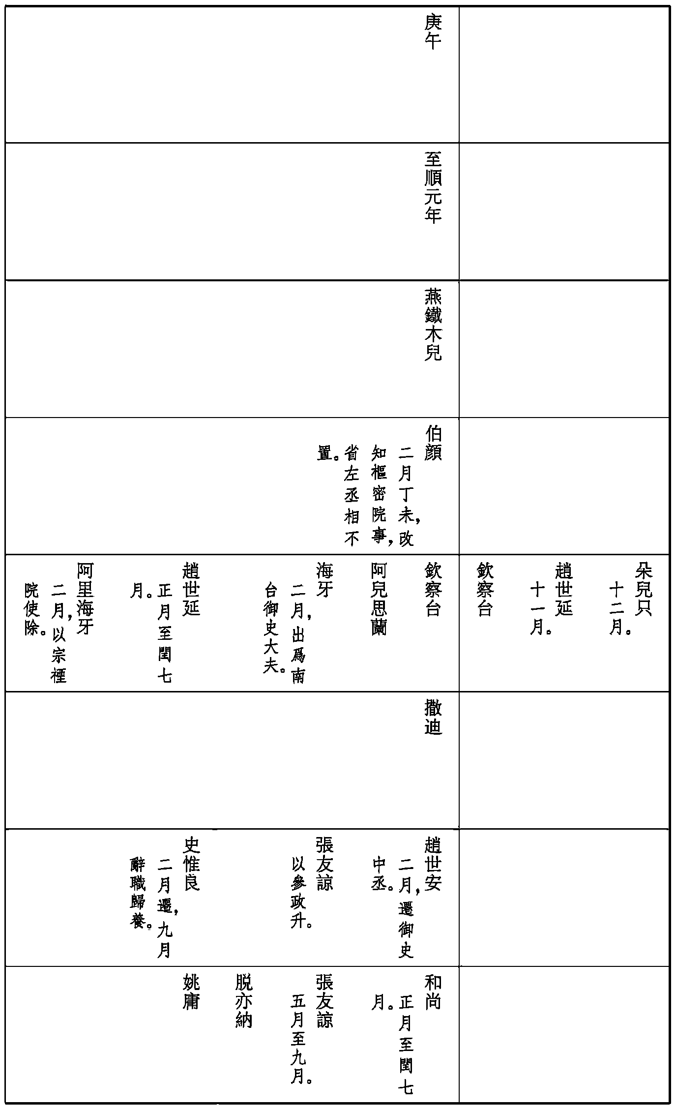 [一〇]「三月免署商議省事」,「署商議省事」五字原誤在下欄「咱喜魯丁」下。按《元史》卷一七本紀第十七《世祖十四》載「平章政事麥朮丁以久居其任,乞令免署,惟食其禄,與商議中書省事」,今據以移正。