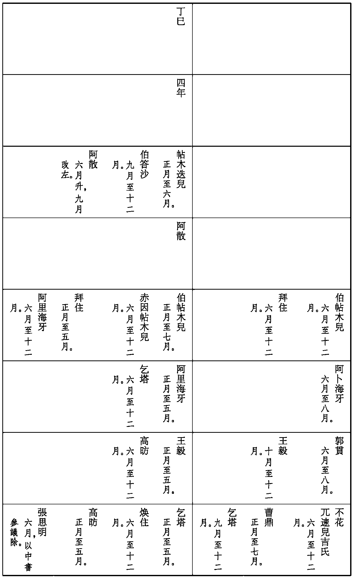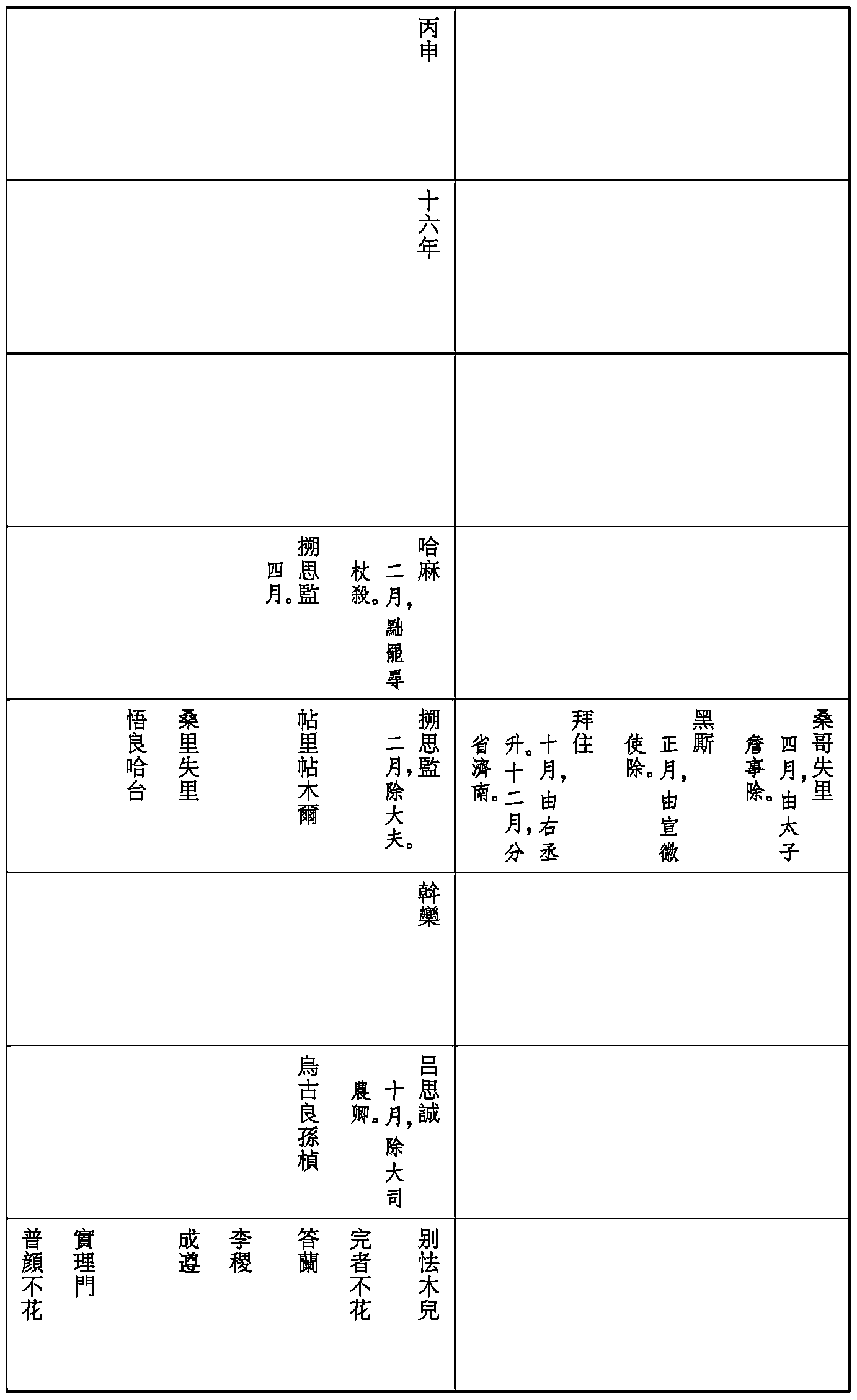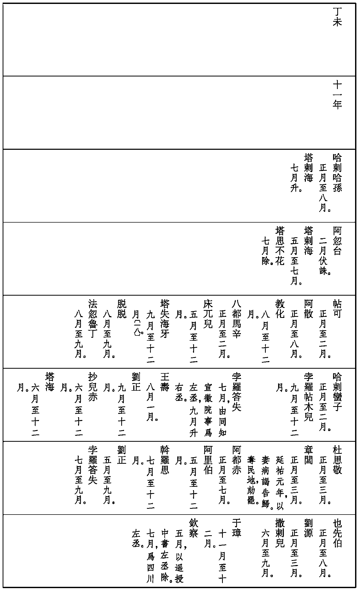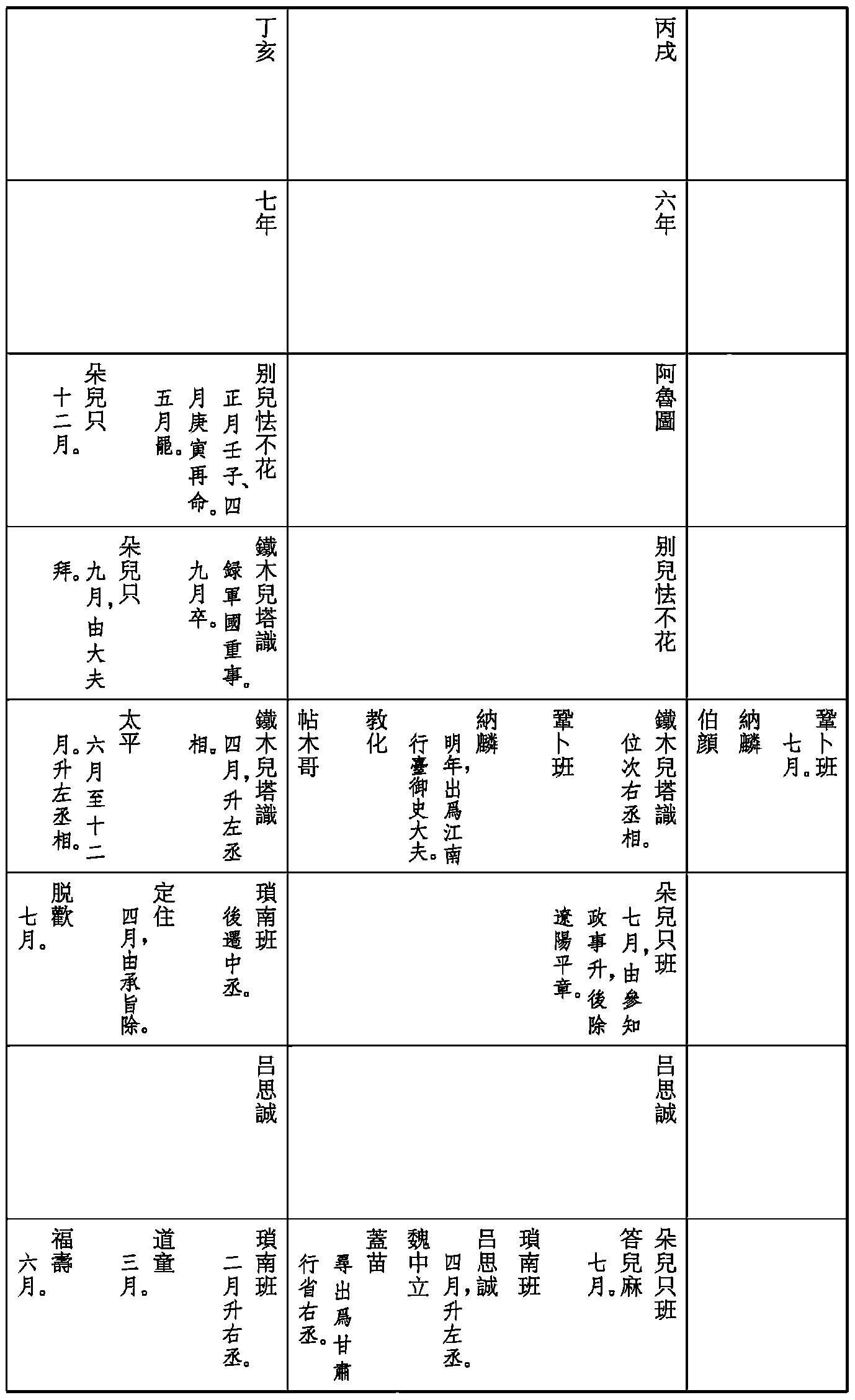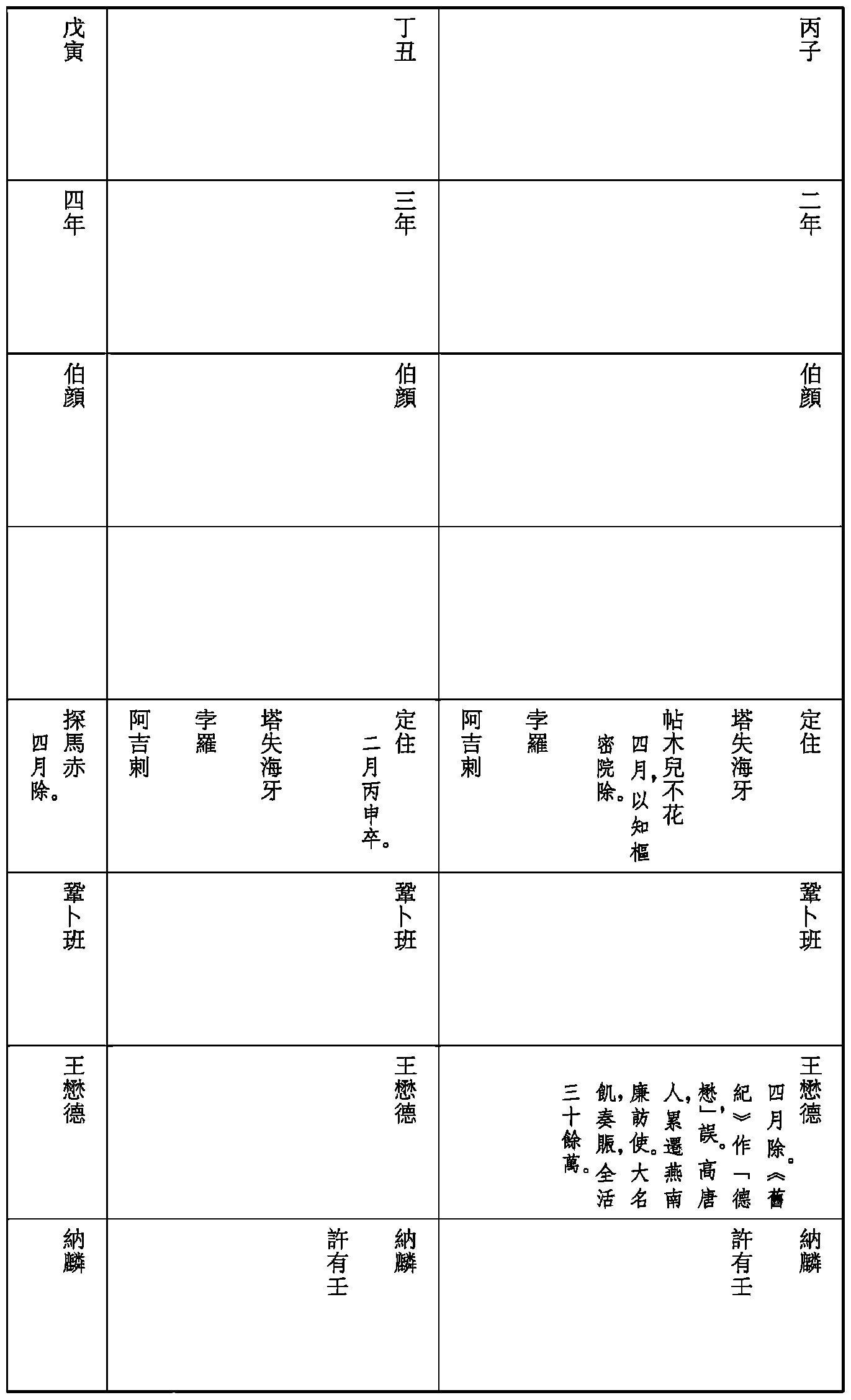 [一〇]「三月免署商議省事」,「署商議省事」五字原誤在下欄「咱喜魯丁」下。按《元史》卷一七本紀第十七《世祖十四》載「平章政事麥朮丁以久居其任,乞令免署,惟食其禄,與商議中書省事」,今據以移正。