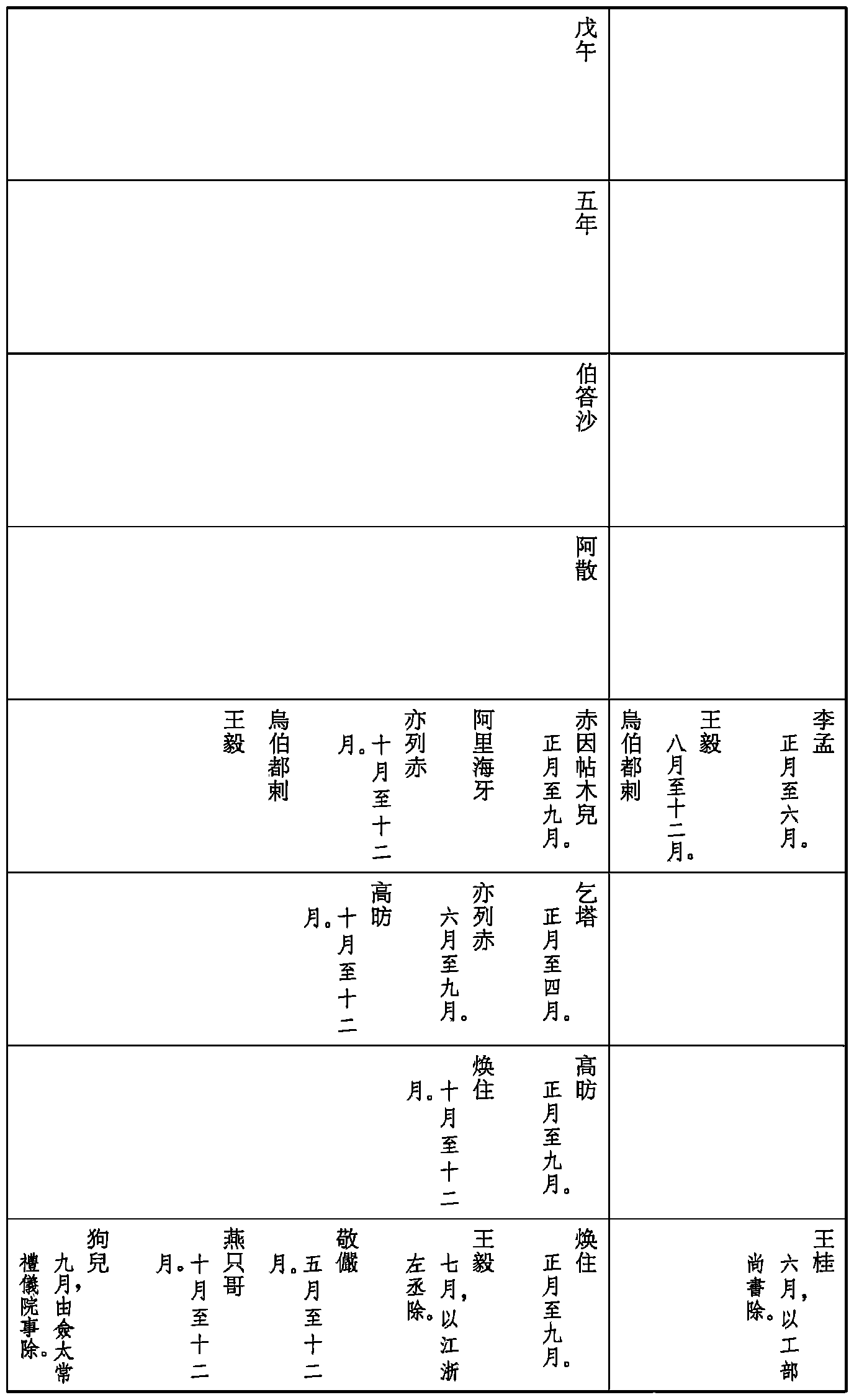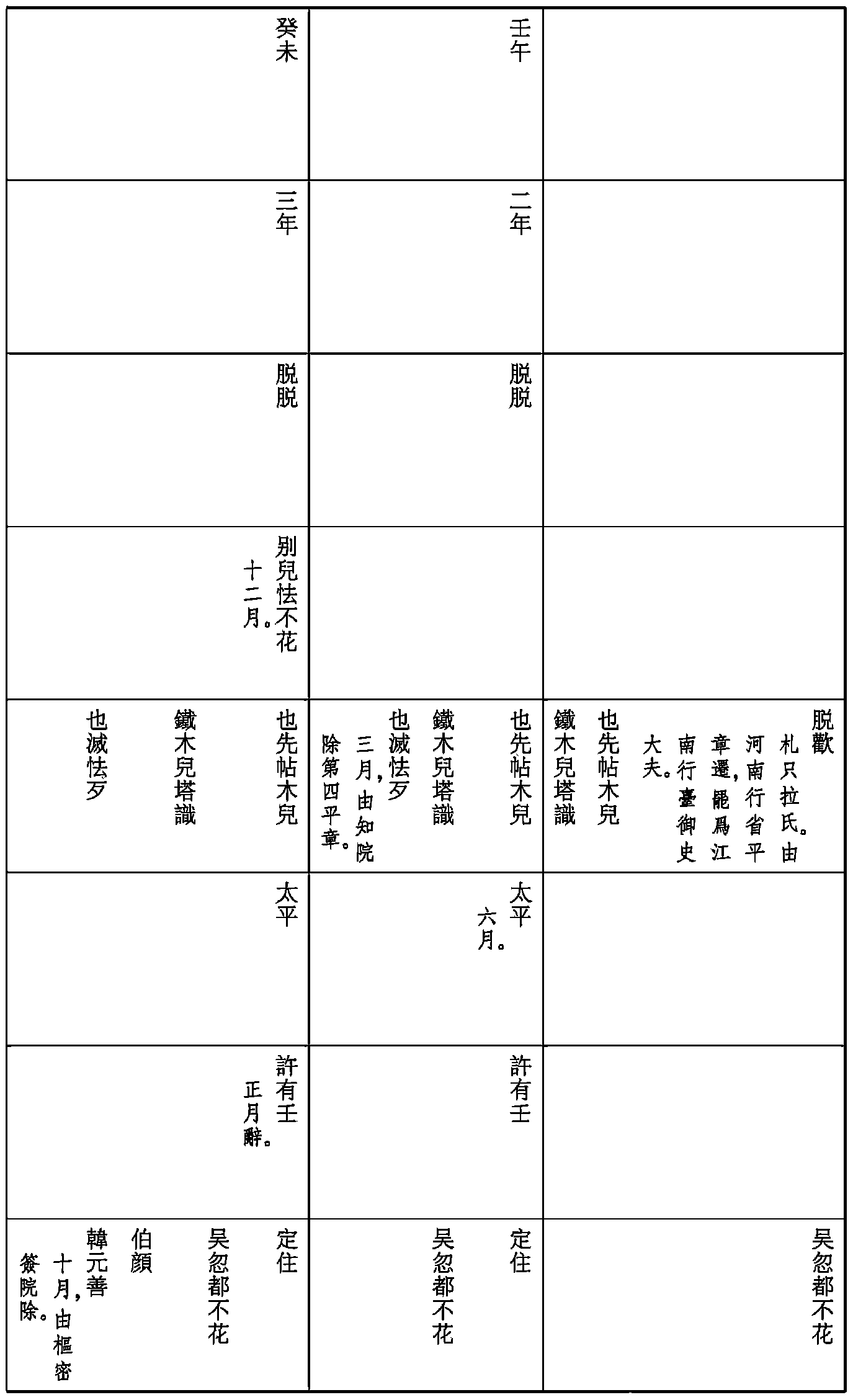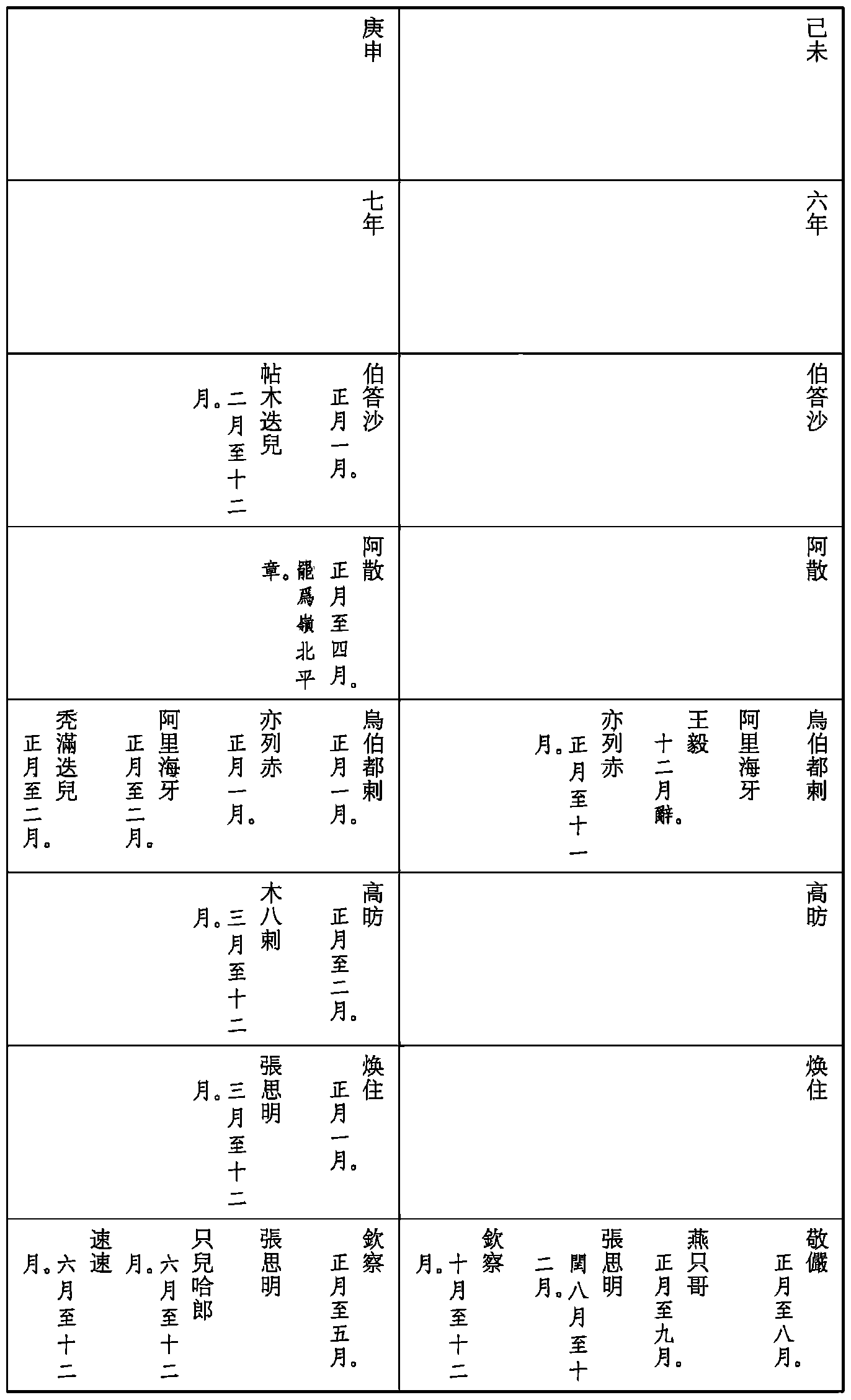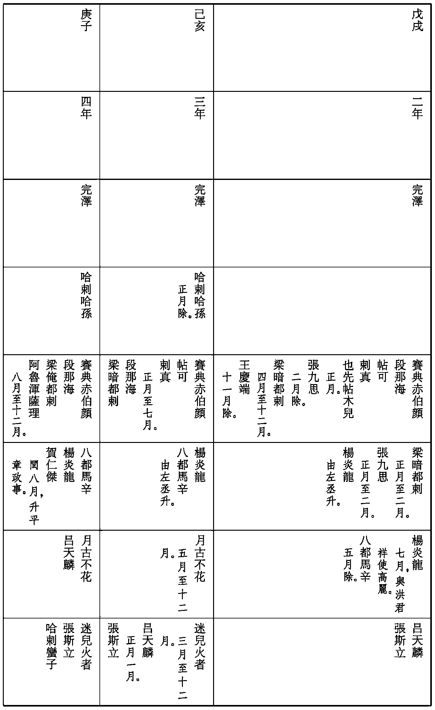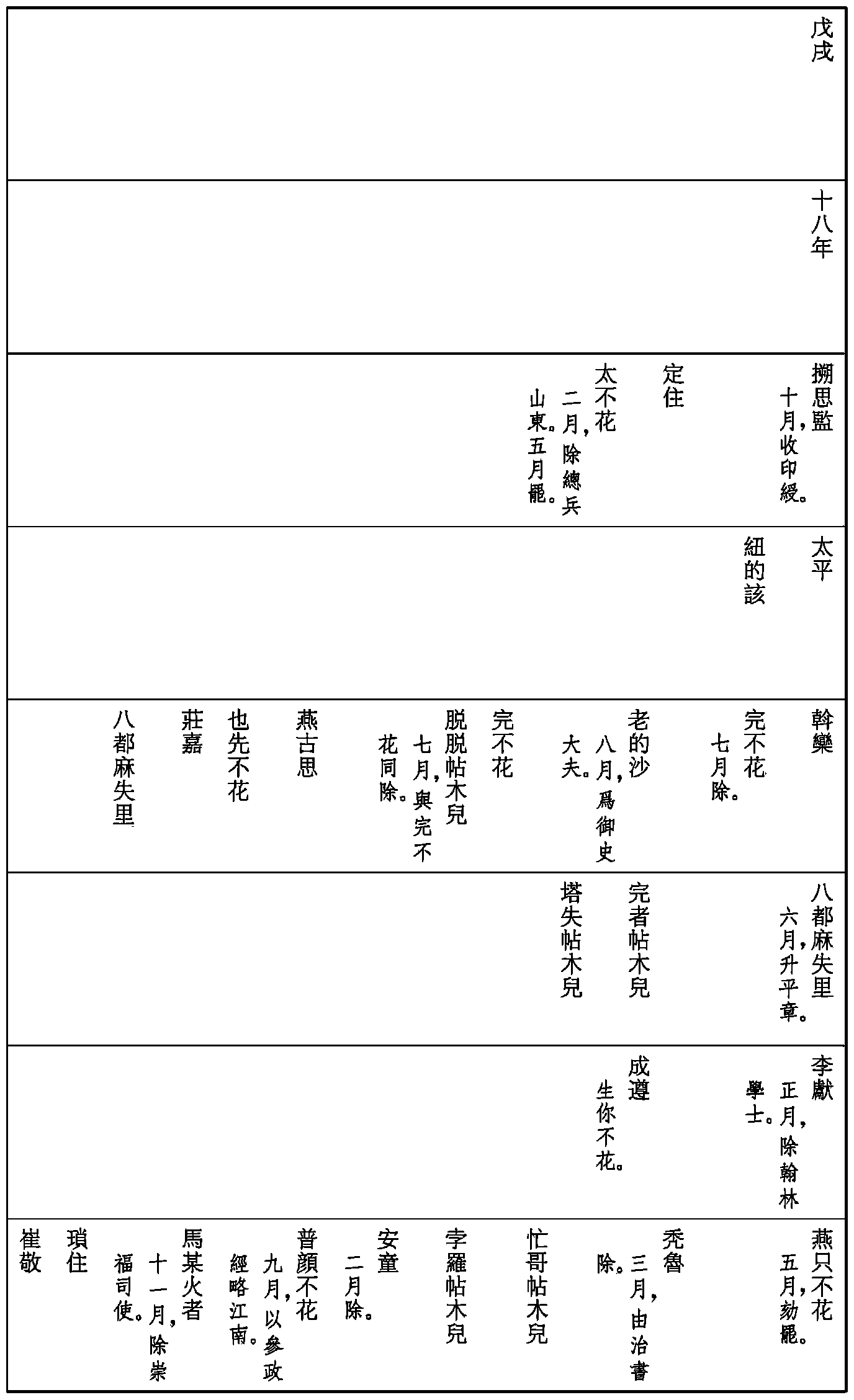 [一〇]「三月免署商議省事」,「署商議省事」五字原誤在下欄「咱喜魯丁」下。按《元史》卷一七本紀第十七《世祖十四》載「平章政事麥朮丁以久居其任,乞令免署,惟食其禄,與商議中書省事」,今據以移正。