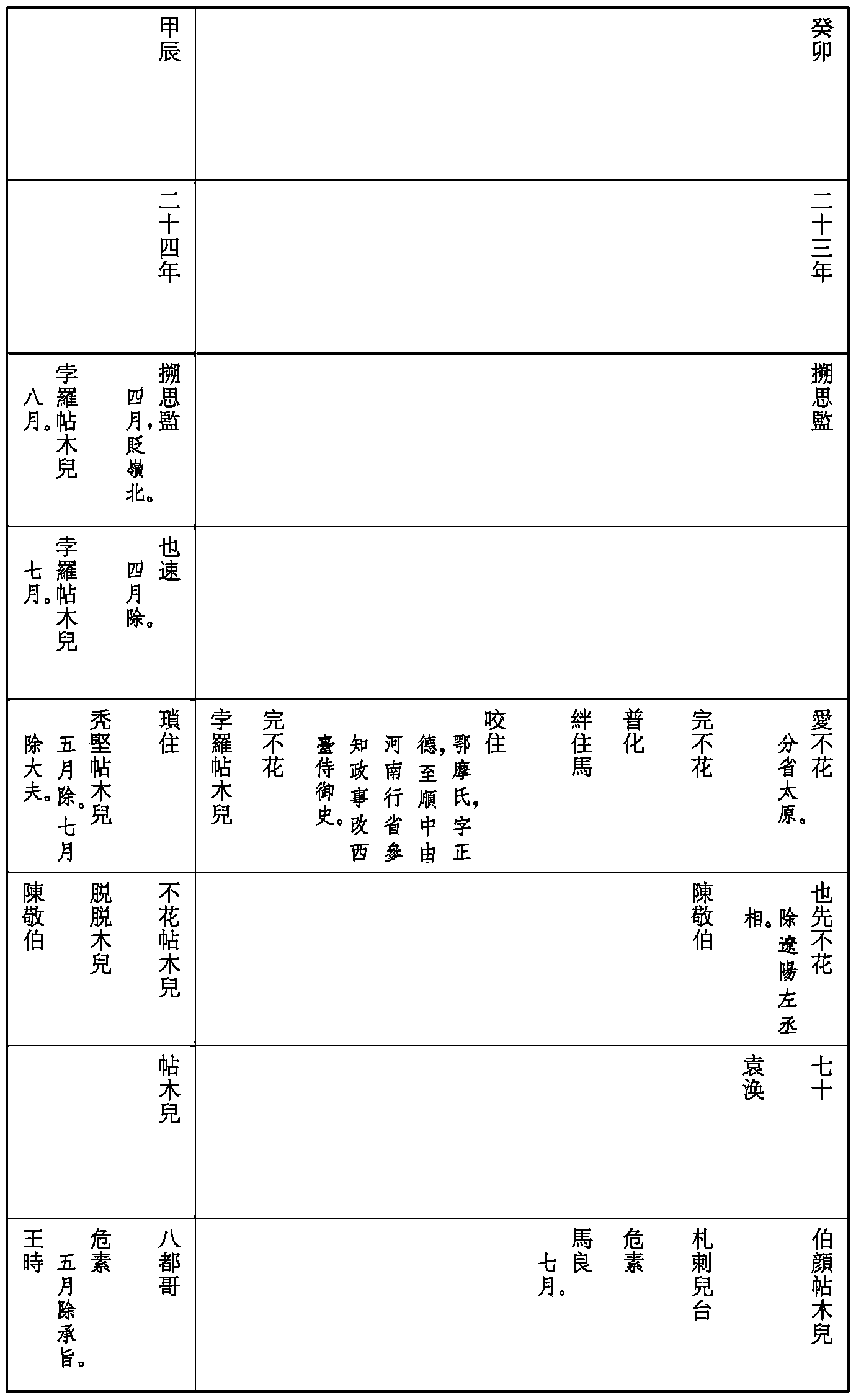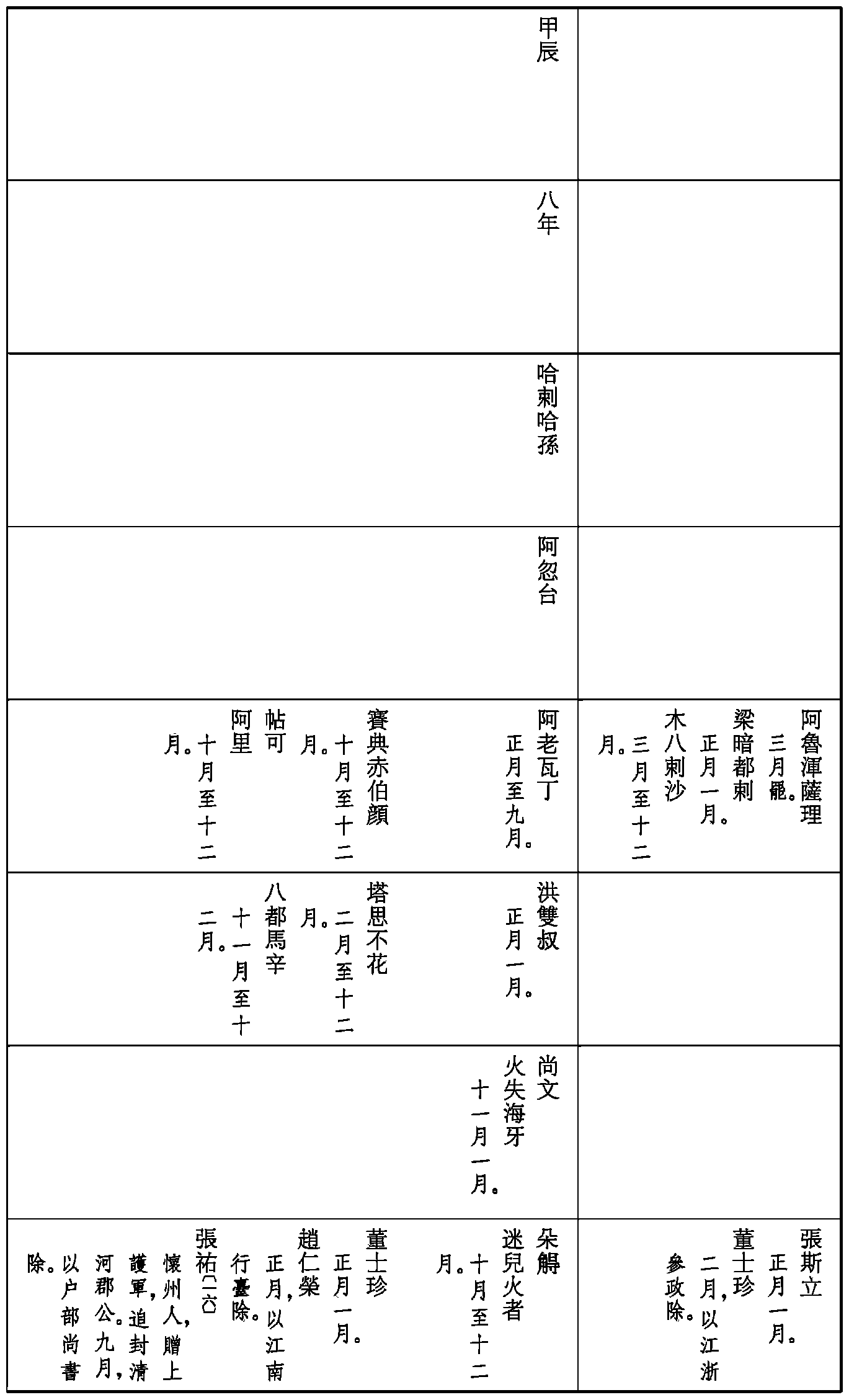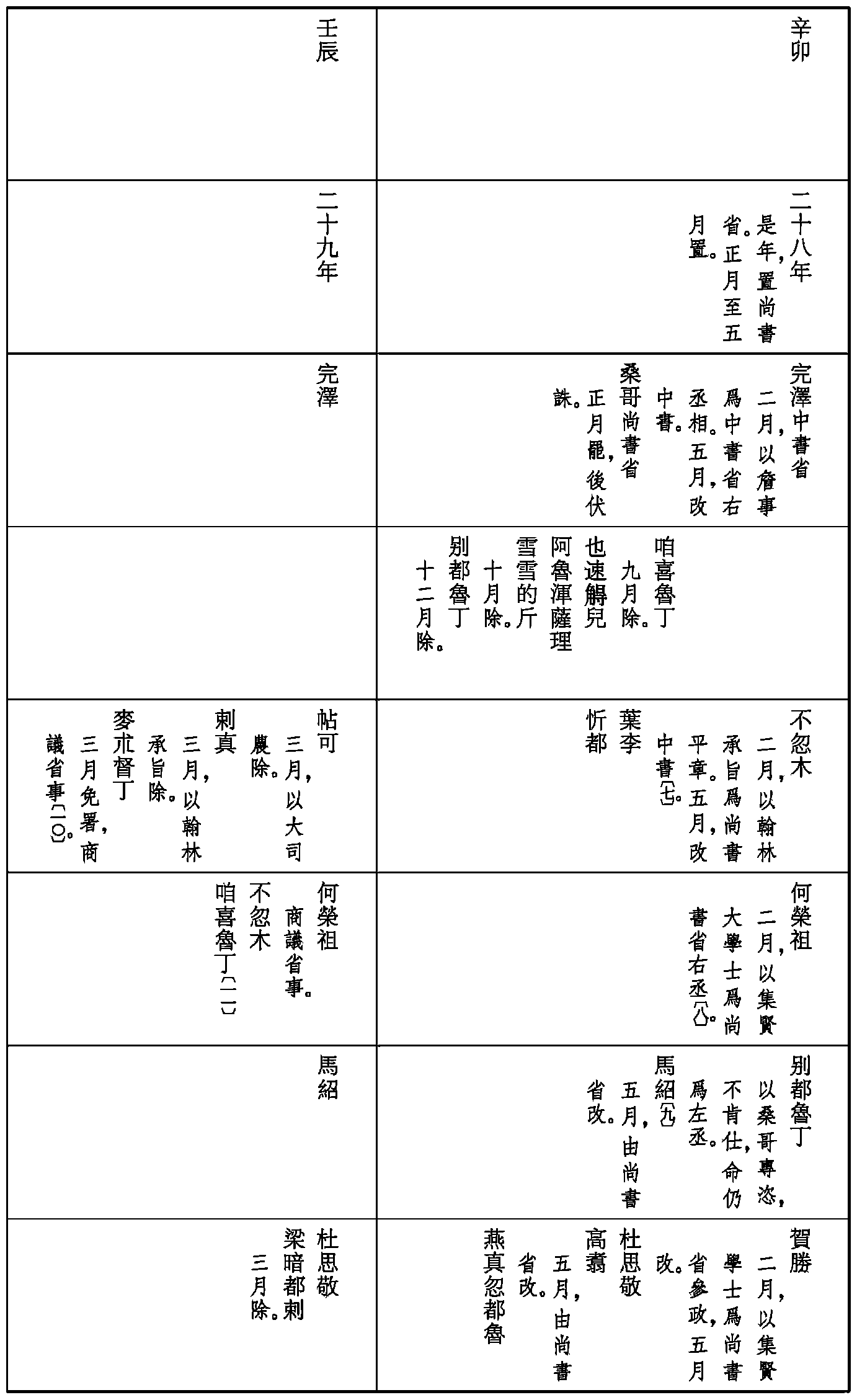 [七]「改中書」,原作「改月改」。按《元史》卷一六本紀第十六《世祖十三》載,至元二十八年二月,不忽木以翰林學士承旨爲尚書省平章政事,五月罷尚書省,改不忽木爲中書省平章政事。據例,此當作「改中書」,因改。