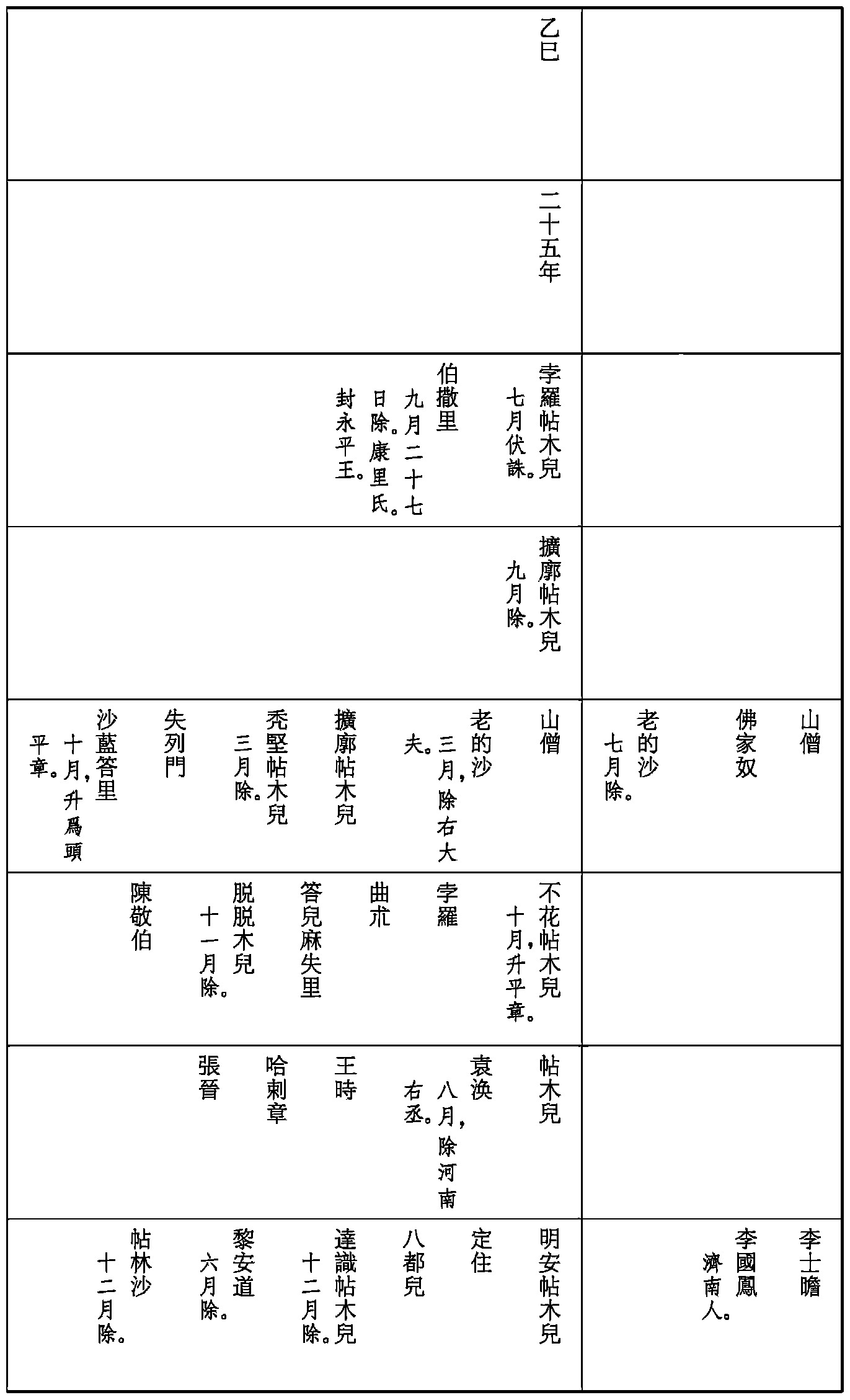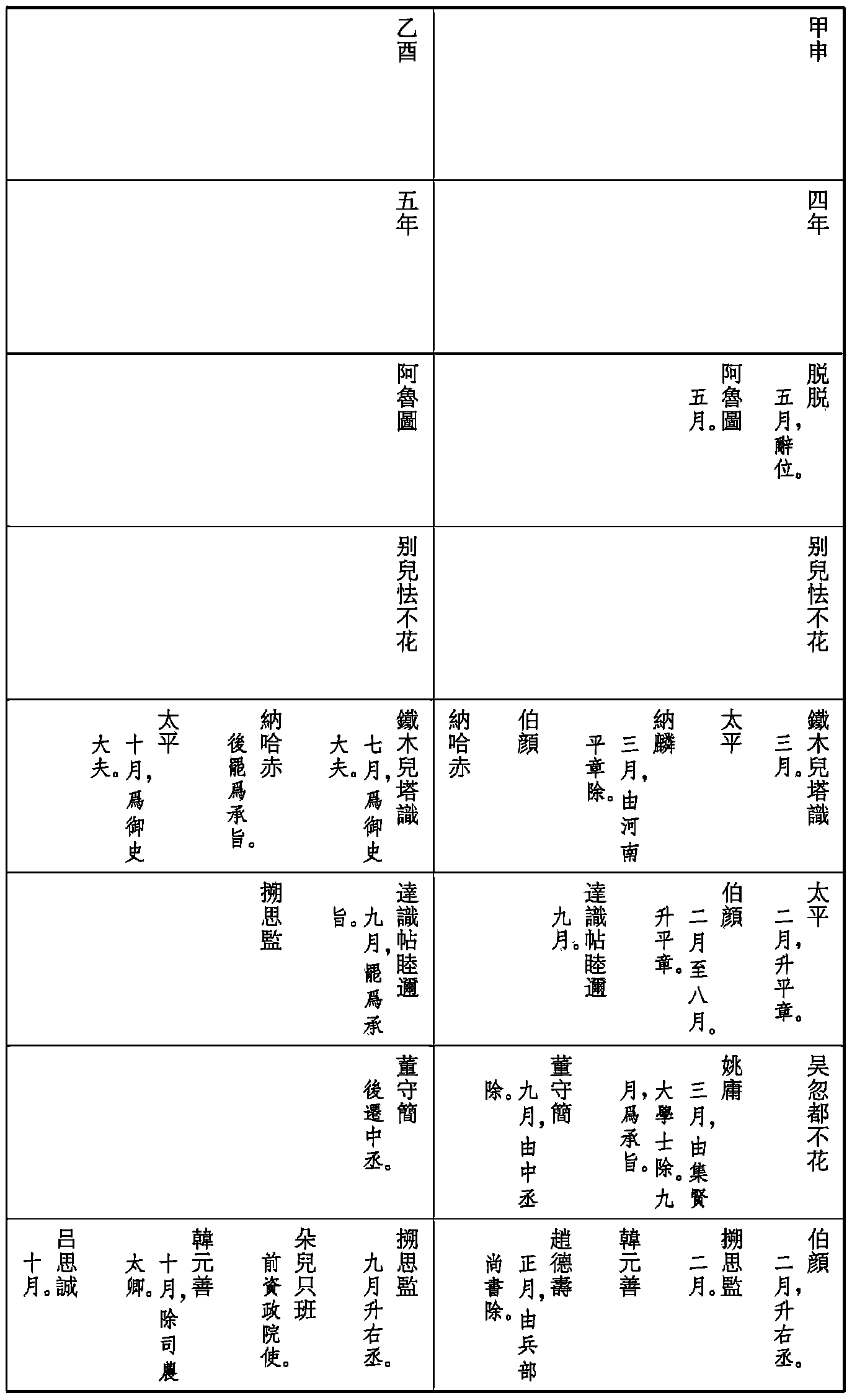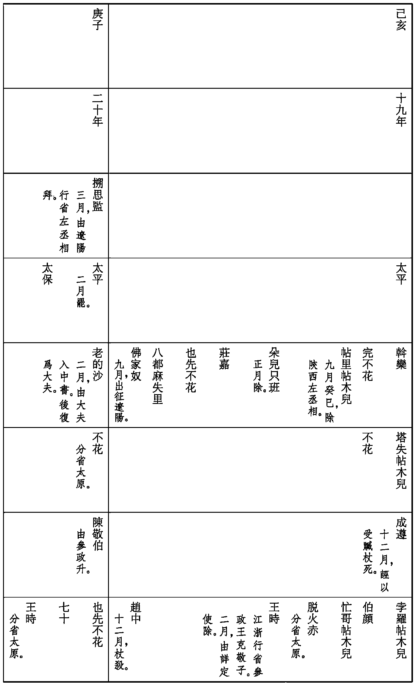 [二]「左丞相」,原作「山丞相」。按據上文忽都察兒上年十一月除左丞相,至此降爲平章政事。「山」顯係「左」之訛,因改。
