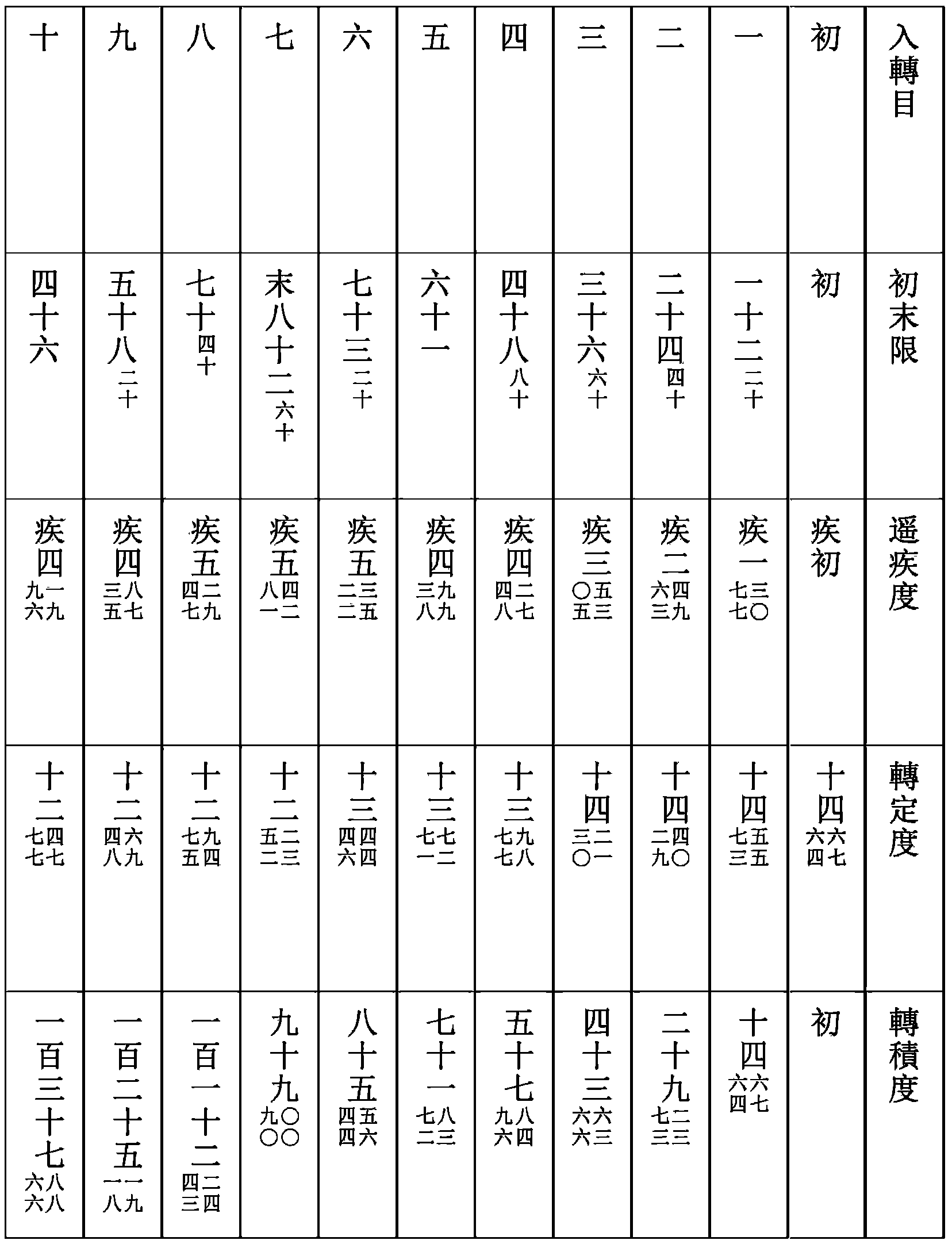 各視入轉日及分秒。在轉中已下,爲疾曆。已上,減去轉中,爲遲曆。