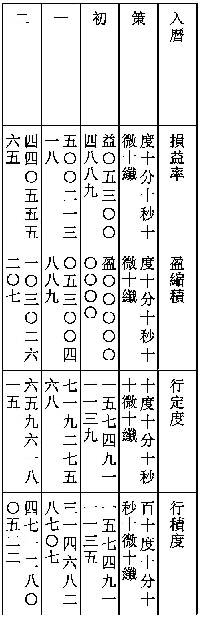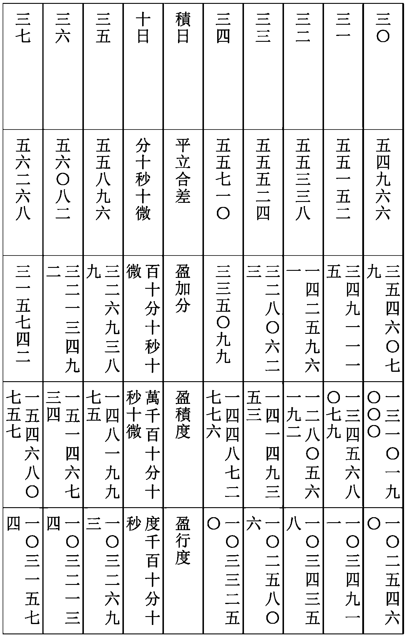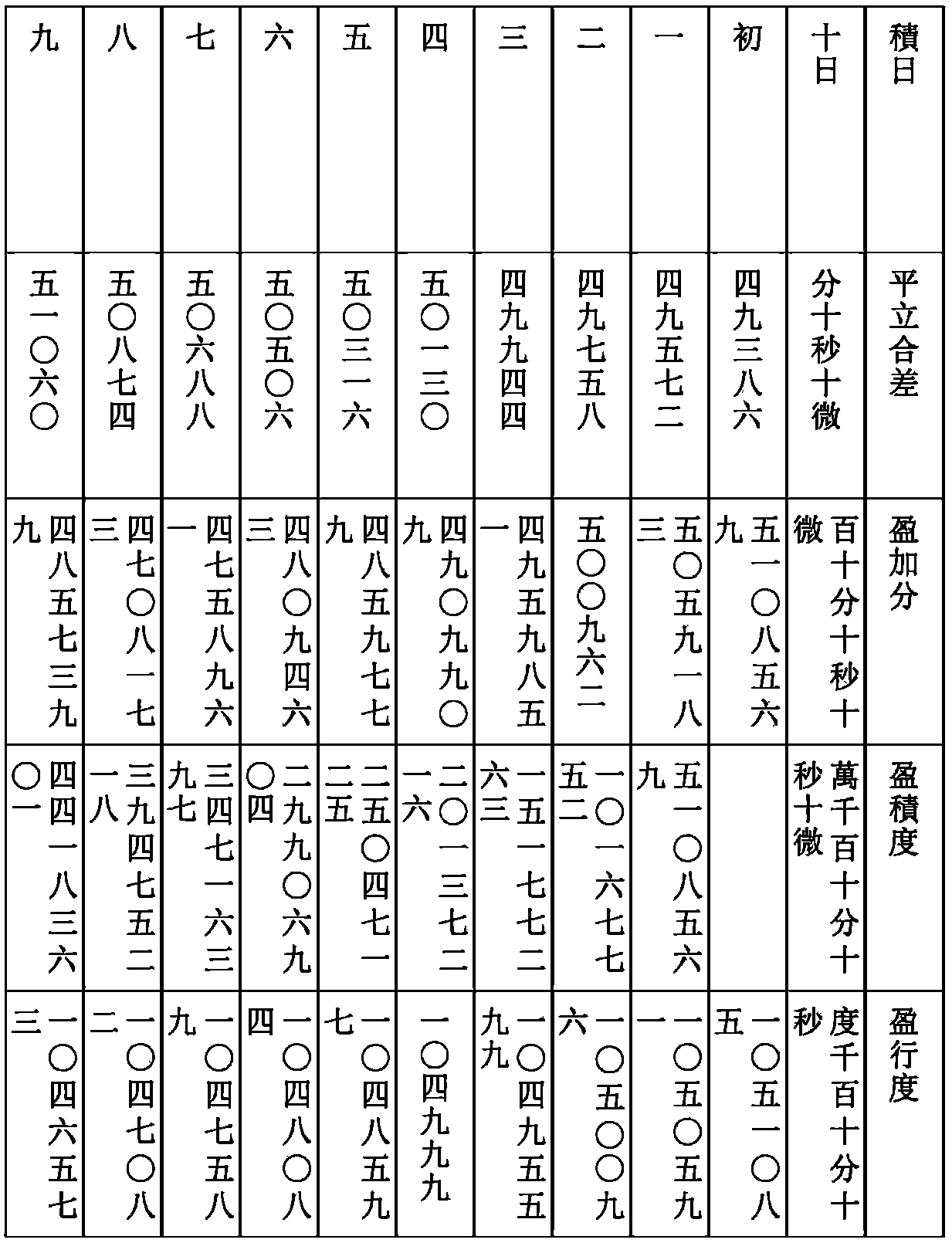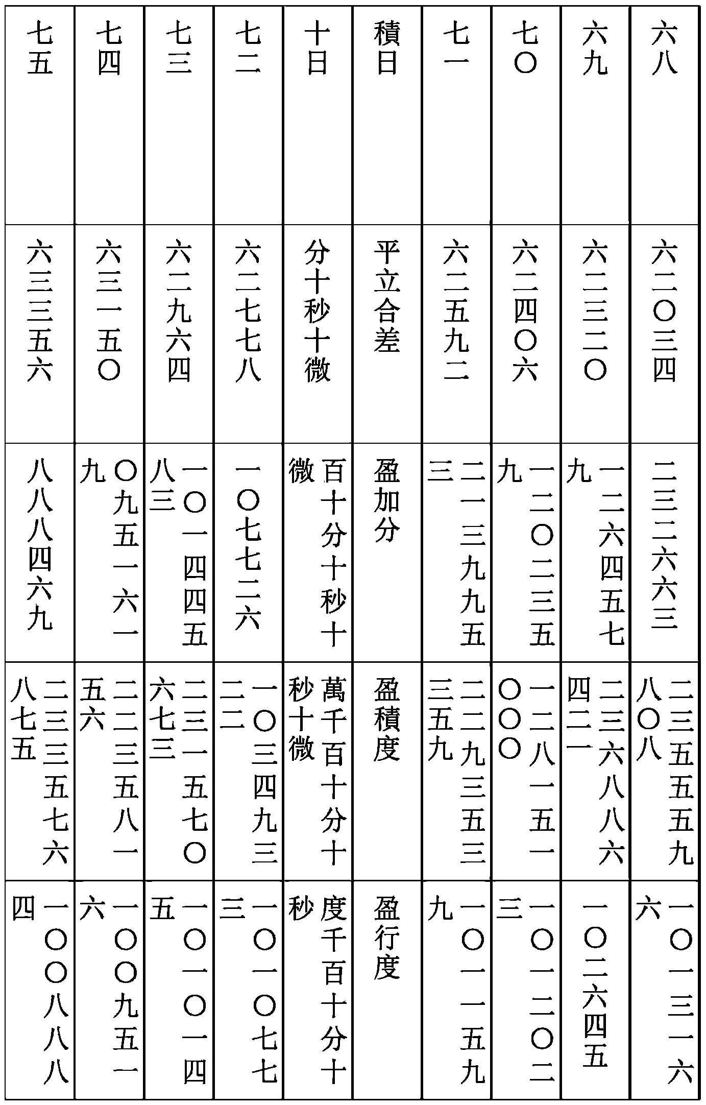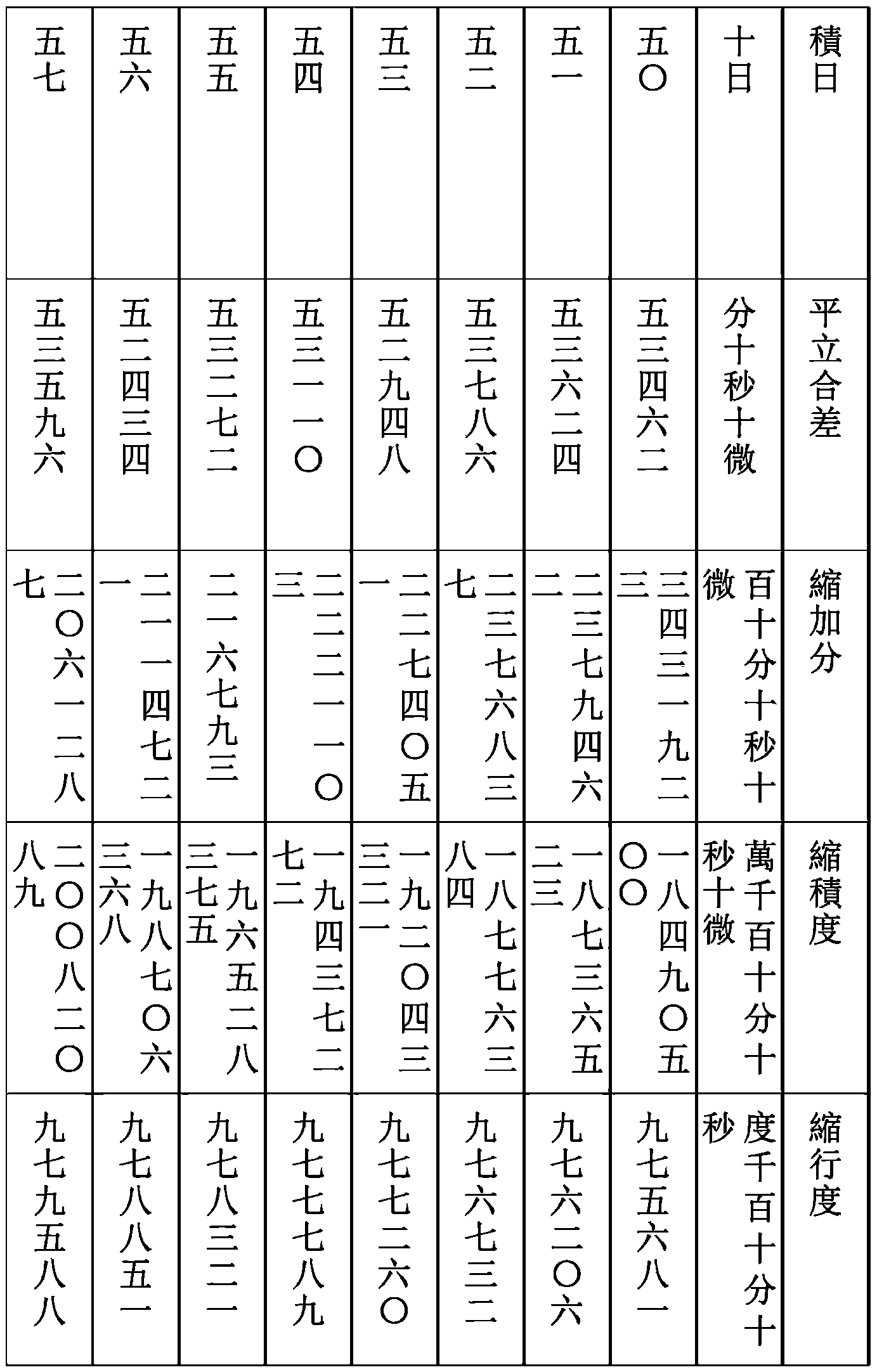 晨分加二百五十分爲日出分,日周一萬分内減晨分爲昏分,昏分減二百五十分爲日入分,又減五千分爲半晝分。故立成只列晨昏分,則出入及半晝分皆具,不必盡列也。