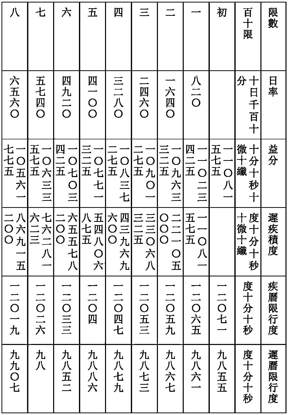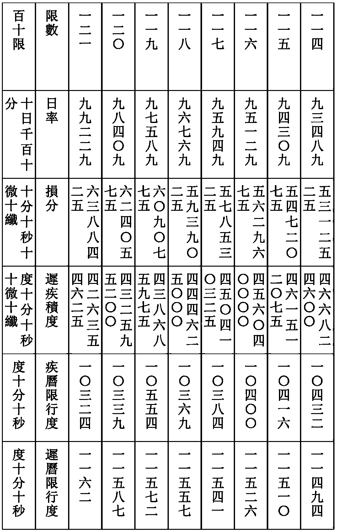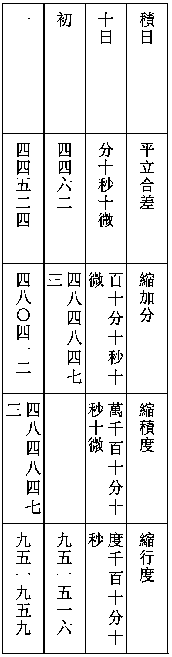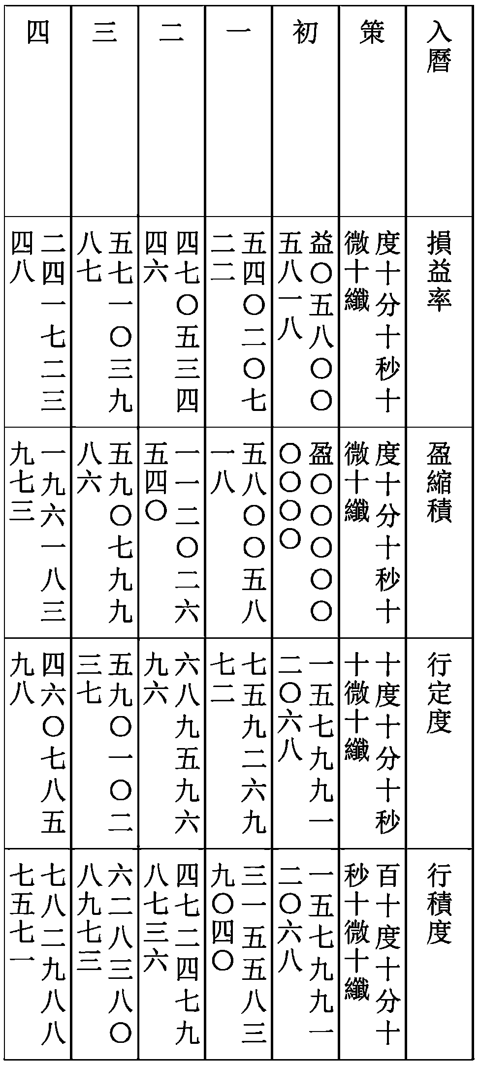 晨分加二百五十分爲日出分,日周一萬分内減晨分爲昏分,昏分減二百五十分爲日入分,又減五千分爲半晝分。故立成只列晨昏分,則出入及半晝分皆具,不必盡列也。