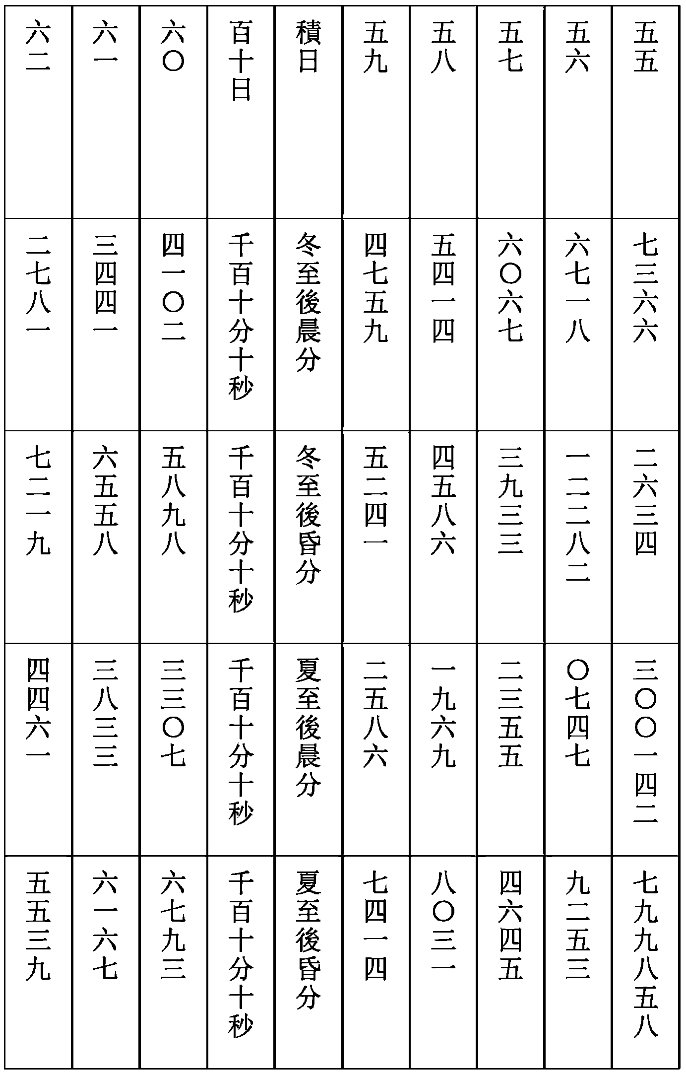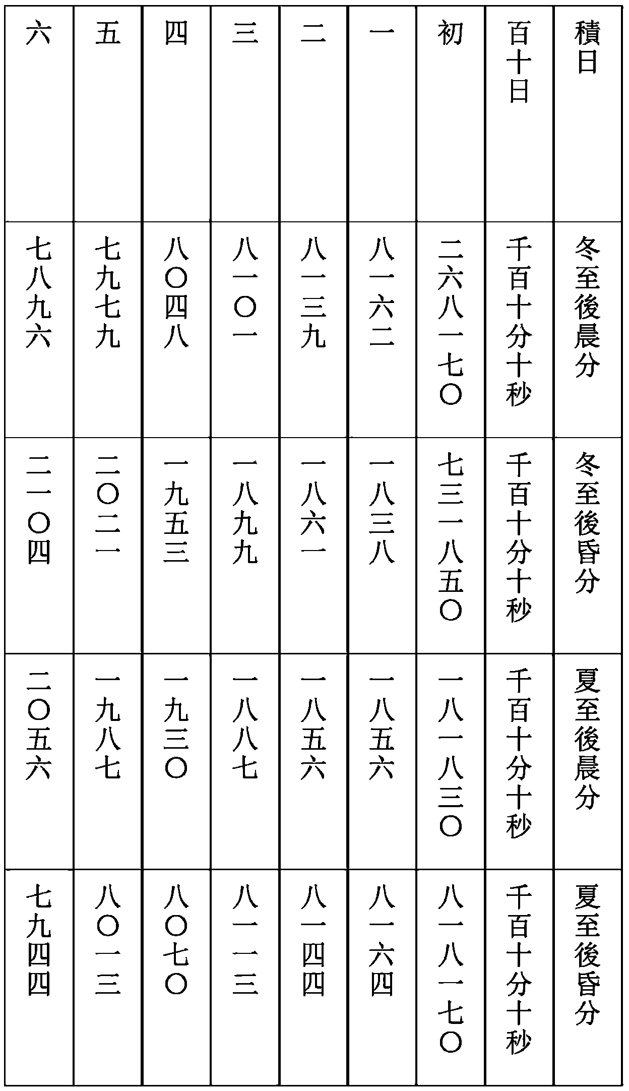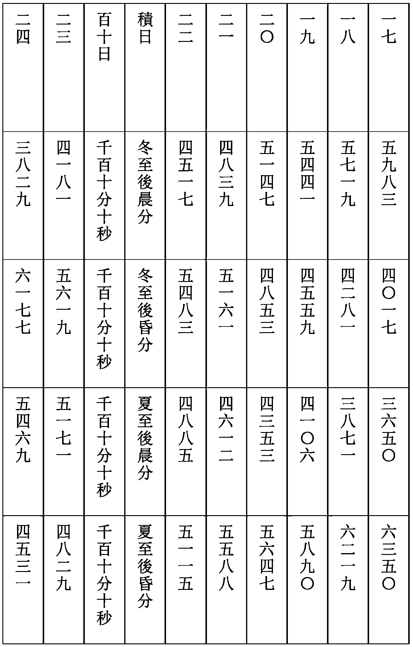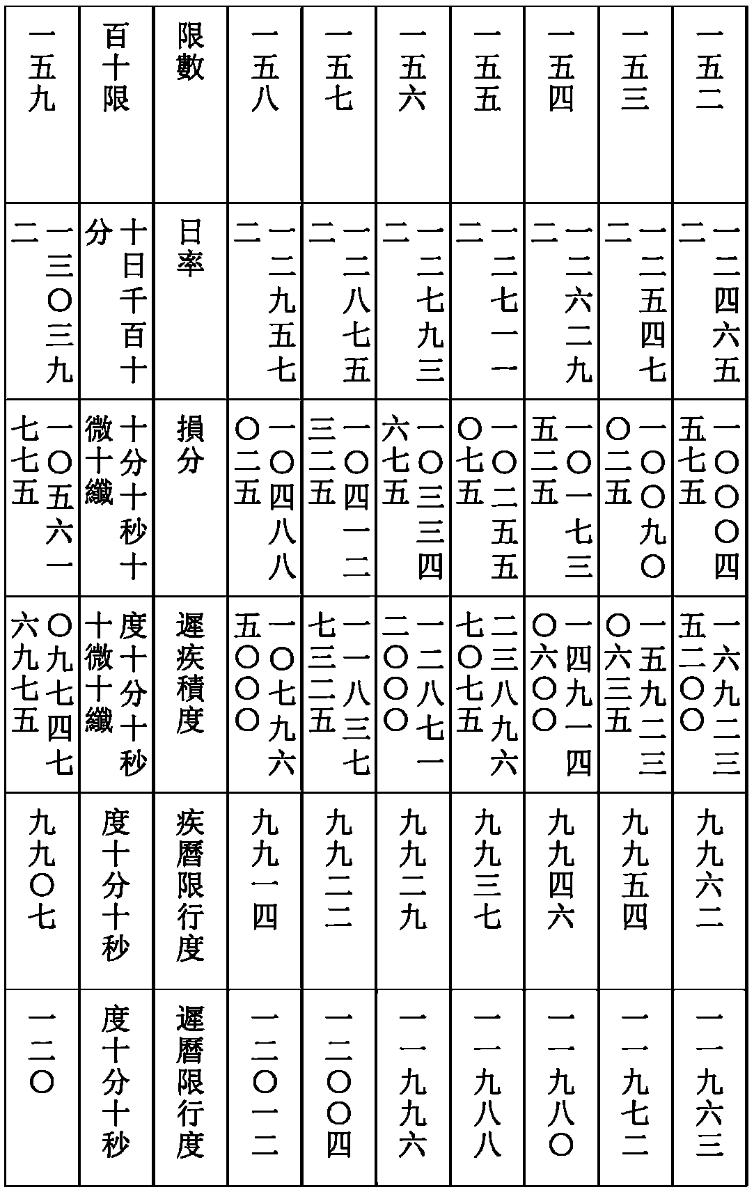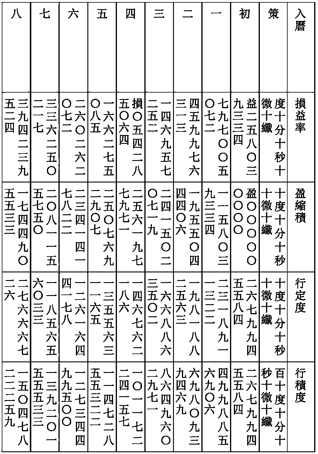 晨分加二百五十分爲日出分,日周一萬分内減晨分爲昏分,昏分減二百五十分爲日入分,又減五千分爲半晝分。故立成只列晨昏分,則出入及半晝分皆具,不必盡列也。