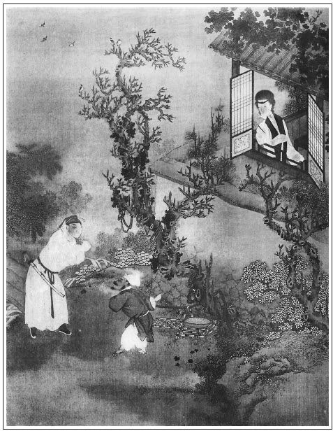 進入第二重殿後,轉過一重側門,卻是吳道官的道院。進的門來,兩下都是些瑤草琪花,蒼松翠竹。西門慶抬頭一看,只見兩邊門楹上貼著一副對聯道: