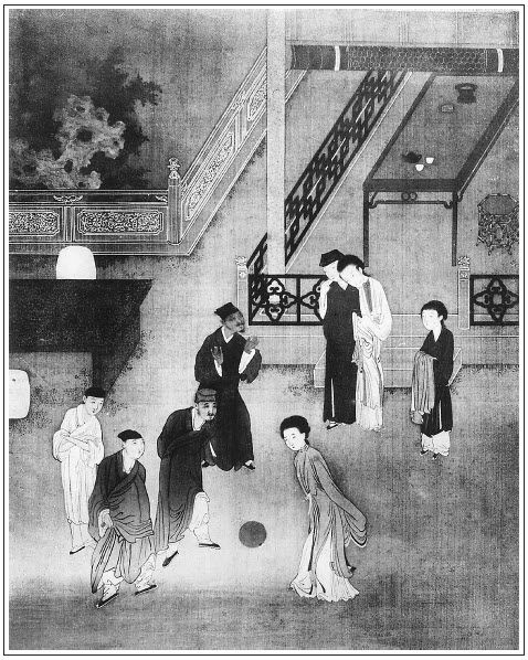 西門慶打發架兒出門,安排酒上來吃。桂姐滿泛金盃,雙垂紅袖,餚烹異品,果獻時新,倚翠偎紅,花濃酒艷。酒過兩巡,桂卿、桂姐一個彈箏,一個琵琶,兩個彈著唱了一套《霽景融和》。正唱在熱鬧處,張夾又一花樣。見三個穿青衣黃板鞭者──謂之圓社,手裡捧著一隻燒鵝,提著兩瓶老酒,大節間來孝順大官人,向前打了半跪。西門慶平昔認的,一個喚白禿子,一個喚小張閒,一個是羅回子,繡眉命名妙甚,宛然二人在目。因說道:「你們且外邊候候,待俺們吃過酒,踢三跑。」於是向桌子上拾了四盤嗄飯、一大壺酒、一碟點心,打發眾圓社吃了,整理氣毬伺候。西門慶吃了一回酒,出來外面院子裡,先踢了一跑。張夾又一段。次教桂姐上來,與兩個圓社踢。一個楂頭,一個對障,勾踢拐打之間,無不假喝彩奉承。就有些不到處,都快取過去了。反來向西門慶面前討賞錢,說:「桂姐的行頭,就數一數二的,強如二條巷董官女兒數十倍。」當下桂姐踢了兩跑下來,使的塵生眉畔,汗濕腮邊,氣喘吁吁,腰肢困乏。袖中取出春扇兒搖涼,張夾又一段。與西門慶攜手,看桂卿與謝希大、張小閒踢行頭。白禿子、羅回子在旁虛撮腳兒等漏,往來拾毛。張夾又一段。亦有《朝天子》一詞,單表這踢圓的始末: