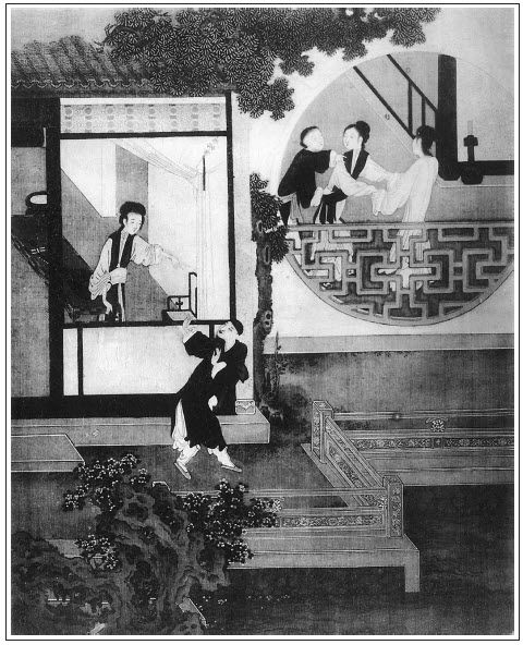 須臾,過了玉樓生日。一日,月娘往對門喬大戶家吃酒去了。約後晌時分,西門慶從外來家,已有酒了,走到儀門首,這蕙蓮正往外走,兩個撞個滿懷。張夾又與瓶兒對照。西門慶便一手摟過脖子來,就親了個嘴,口中喃喃吶吶說道:「我的兒,你若依了我,頭面衣服,隨你揀著用。」繡眉純以利動之,已落第二義。張夾純以財動之,便非金、瓶一類矣。那婦人一聲兒沒言語,推開西門慶手,一直往前走了。西門慶歸到上房,叫玉簫送了一疋藍緞子到他屋裡,如此這般對他說:「爹昨日見你穿著紅襖,配著紫裙子,怪模怪樣的不好看,才拿了這疋緞子,使我送與你,教你做裙子穿。」這蕙蓮開看,卻是一疋翠藍兼四季團花喜相逢緞子。說道:「我做出來,娘見了問怎了?」玉簫道:「爹到明日還對娘說,你放心。爹說來,你若依了這件事,隨你要甚麼,爹與你買。今日趕娘不在家,要和你會會兒,你心下如何?」那婦人聽了,微笑不言,張夾又另寫一淫婦樣。因問:「爹多咱時分來?我好在屋裡伺候。」玉簫道:「爹說小廝們看著,不好進你屋裡來的。教你悄悄往山子底下洞兒裡,那裡無人,堪可一會。」老婆道:「只怕五娘、六娘知道了,不好意思的。」玉簫道:「三娘和五娘都在六娘屋裡下棋,你去不妨事。」當下約會已定,玉簫走來回西門慶說話。兩個都往山子底下成事,玉簫在門首與他觀風。正是: