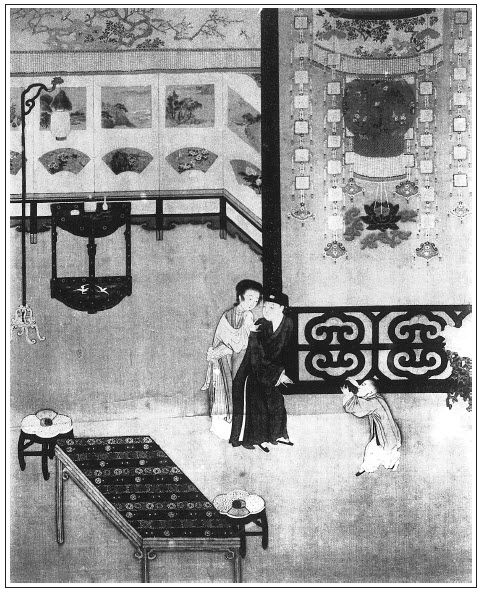 玉樓等剛走過門首來,只見賁四娘子,繡旁又一波。在大門首張眉韓,寒也。賁,葉也。皆西門慶臨死散場之人。此處預為一照,故知「冰鑒」一回乃小結煞也。笑嘻嘻向前道了萬福,說道:「三位娘那裡走了走?請不棄到寒家獻茶。」玉樓道:「方纔因韓嫂兒哭,俺站住問了他聲。承嫂子厚意,天晚了,不到罷。」賁四娘子道:「耶樂,三位娘上門怪人家,就笑話俺小家人家茶也奉不出一杯兒來?」生死拉到屋裡。原來上邊供養觀音八難並關聖賢,當門掛著雪花燈兒一盞。掀開門簾,擺設春台,與三人坐。連忙教他十四歲女兒長姐過來,與三位娘磕頭遞茶。玉樓、金蓮每人與了他兩枝花兒。李瓶兒袖中取了一方汗巾,又是一錢銀子,與他買瓜子兒嗑。喜歡的賁四娘子拜謝了又拜。款留不住,玉樓等起身。到大門首,小廝來興在門首迎接。金蓮就問:「你爹來家不曾?」來興道:「爹未回家哩。」三個婦人,還看著陳敬濟在門首放了兩個一丈菊和一筒大煙蘭、一個金盞銀台兒,才進後邊去了。繡旁餘興未已。西門慶直至四更來家。張夾以上一段,寫西門沒家法。正是: