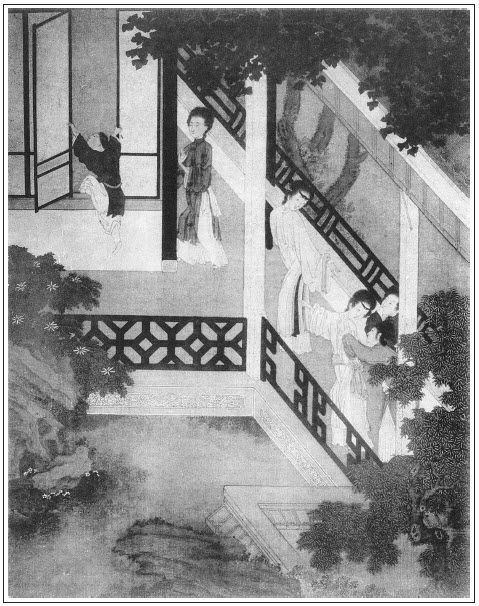 眾人唱著不覺到角門首。張夾角門二。玉樓把月琴遞與春梅,張夾月琴三。和李瓶兒往後去了。繡旁一痕不亂。張夾描瓶兒處已完,玉樓處亦完。