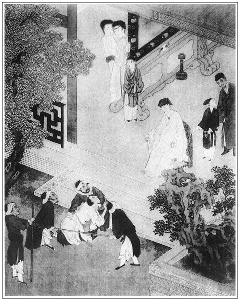 西門慶回到廳上,拉了把椅子坐下,就一片聲叫平安兒。那平安兒走到跟前,西門慶罵道:「賊奴才,還站著?」叫答應的,就是三四個排軍在旁伺候。那平安不知甚麼緣故,諕的臉蠟查黃,跪下了。西門慶道:「我進門就吩咐你,但有人來,答應不在。你如何不聽?」平安道:「白大叔來時,小的回說爹往門外送行去了,沒來家。他不信,強著進來了。小的就跟進來問他:『有話說下,待爹來家,小的稟就是了。』他又不言語,自家推開廳上隔子坐下。落後,不想出來就撞見了。」西門慶罵道:「你這奴才,不要說嘴!你好小膽子兒?人進來,你在那裡耍錢吃酒去來,不在大門首守著!」令左右:「你聞他口裡。」那排軍聞了一聞,稟道:「沒酒氣。」西門慶吩咐:「叫兩個會動刑的上來,與我著實拶這奴才!」當下兩個伏侍一個,套上拶指,只顧擎起來。拶的平安疼痛難忍,叫道:「小的委實回爹不在,他強著進來。」那排軍拶上,把繩子綰住,跪下稟道:「拶上了。」西門慶道:「再與我敲五十敲。」旁邊數著,敲到五十上住了手。西門慶吩咐:「打二十棍!」須臾打了二十,打的皮開肉綻,滿腿血淋。西門慶喝令:「與我放了。」兩個排軍向前解了拶子,解的直聲呼喚。張夾忍心哉!西門慶罵道:「我把你這賊奴才!你說你在大門首,想說要人家錢兒,在外邊壞我的事,休吹到我耳朵內,把你這奴才腿卸下來!」那平安磕了頭起來,提著褲子往外去了。西門慶看見畫童兒在旁邊,說道:「把這小奴才拿下去,也拶他一拶子。」一面拶的小廝殺豬兒似怪叫。張夾小人得志乃如此。這裡西門慶在前廳拶人不題。