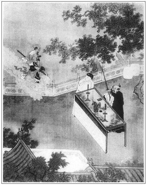 到三更天氣,建立燈壇完備,潘道士高坐在上。下面就是燈壇,按青龍、白虎、朱雀、玄武,上建三台華蓋;張夾上。周列十二宮辰,張夾周圍。下首才是本命燈,張夾下。共合二十七盞。先宣念了投詞。西門慶穿青衣俯伏階下,左右盡皆屏去,不許一人在左右。燈燭熒煌,一齊點將起來。那潘道士在法座上披下發來,仗劍,口中唸唸有詞。望天罡,取真氣,布步玦,躡瑤壇。