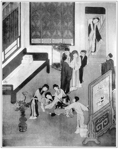 到次日,宋巡按擺酒,後廳筵席治酒,裝定果品。大清早辰,本府出票撥了兩院三十名官身樂人,兩名伶官、四名排長領著,來西門慶宅中答應。只見任醫官從早辰就騎馬來了,西門慶忙迎到廳上陪坐,道連日闊懷之事。任醫官道:「昨日盛使到,學生該班,至晚才來家,見尊刺,今日不俟駕而來。敢問何人欠安?」西門慶道:「大賤內偶然有些失調,請後溪一診。」須臾茶至。吃了茶,任醫官道:「昨日聞得明川說,老先生恭喜,容當奉賀。」西門慶道:「菲才備員而已,何賀之有。」一面西門慶分付:「後邊對你大娘說,任老爹來了,明間內收拾。」琴童應諾,到後邊。大妗子、李嬌兒、孟玉樓都在房內,只見琴童來說:「任醫官來了,爹分付教收拾明間裡坐的。」月娘只不動身,說道:「我說不要請他,平白教人家漢子,睜著活眼,把手捏腕的,不知做甚麼!張夾丑絕不堪。作者寫此回,雖為金蓮散場,實因一路寫月娘,俱是隱筆,恐看官不明,故此回放手一寫其醜,與前掃雪夜反襯也。叫劉媽媽子來,吃兩服藥,由他好了。好這等搖鈴打鼓的,好與人家漢子喂眼。」張夾丑絕不堪。玉樓道:「大娘,已是請人來了,你不出去卻怎樣的,莫不回了人去不成?」大妗子又在旁邊勸著說:「姑娘,他是個太醫,你教他看看你這脈息,還知道你這病源,不知你為甚起氣惱,傷犯了那一經。吃了他藥,替你分理理氣血,安安胎氣也好。張夾一安如何再安,見眾人一時俱以月娘有胎為重,則吃藥安胎,月娘神奸畢露。劉婆子他曉得甚麼病源脈理?一時耽誤怎了。」月娘方動身梳頭,戴上冠兒,玉簫拿鏡子,孟玉樓跳上炕去,替他挐抿子掠後鬢。李嬌兒替他勒鈿兒。孫雪娥預備拿衣裳。繡眉有妾者何等便當,凡為大娘子者,何苦不容。張夾反襯金蓮不在此也。不一時,打扮的粉妝玉琢,張夾一句將月娘假病挾制西門處襯得十分圓滿。夫既是病容,安得粉妝玉琢。正是: