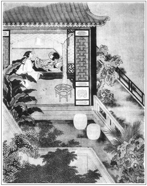 婦人看見其詞,到於晚夕月上時,早把春梅、秋菊兩個丫頭打發些酒與他吃,關在那邊炕屋睡。張夾放入春梅,不得不頓一頓。又春梅豈如秋菊一類呆人,屢寫其為婦人酒醉關在那邊。見春梅明知而不問,是婦人心腹也。與後「奴豈不知」一語想照。此則用筆暗描,得雙之影矣。然後自在房中,綠窗半啟,絳燭高燒,張夾是夜等人者。收拾床鋪衾枕,薰香澡牝,獨立木香棚下,專等敬濟來赴佳期。西門大姐那夜恰好被月娘請去後邊,聽王姑子宣捲去了,張夾月娘可殺,始終月娘壞事。文旁西門慶家不當出壞事耶?此正天理昭彰時,乃深恨月娘,不知是何脾胃也。只有元宵兒在屋裡。敬濟梯己與了他一方手帕,分付他:「看守房中,我往你五娘那邊下棋去。等大姑娘進來,你快來。」元宵兒應諾了。敬濟得手,走來花園中,只見花篩月影,參差掩映。走到荼䕷架下,張夾葡萄架與荼䕷架,對照章法,故前有琴童。下添一木香棚,作連鎖章法,又出一春梅也。遠望見婦人摘去冠兒,亂挽烏雲,悄悄在木香棚下獨立。這敬濟猛然從荼䕷架下突出,雙手把婦人抱住。把婦人諕了一跳,說:「呸,小短命!猛然外事出來,諕了我一跳。早是我,你摟便將就罷了,若是別人,你也恁膽大摟起來?」敬濟吃得半酣兒,笑道:「早是摟了你,就錯摟了紅娘,也是沒奈何。」繡旁趁勢就插入春梅,妙甚。張夾原評謂此處插入春梅,予謂自酒醉,春梅關在炕屋,已明點春梅心事矣。兩個於是相摟相抱,攜手進入房中。房中熒煌煌掌著燈燭,桌上設著酒饌,一面頂了角門,並肩而坐飲酒。婦人便問:「你來,大姐在那裡?」敬濟道:「大姐後邊聽宣捲去了,我分付下元宵兒,有事來這裡叫,我只說在這裡下棋。」說畢,上歡笑做一處。飲酒多時,常言「風流茶說合,酒是色媒人」,張夾又題二句。不覺竹葉穿心,桃花上臉,一個嘴兒相親,一個腮兒廝搵,罩了燈,上床交接。有《六娘子》張夾可知全寫金蓮,不是寫敬濟。小詞為證: