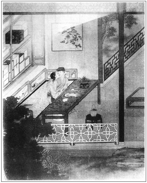 到於晚夕,婦人先在後邊月娘前,假托心中不自在,用了個金蟬脫殼,歸到前邊。月娘後邊儀門老早開了,丫鬟婦人都放出來,要聽尼僧宣卷。張夾可殺,月娘壞事到底。金蓮央及春梅,說道:「好姐姐,你快些請他去罷。」春梅道:「等我先把秋菊那奴才,與他幾鍾酒,灌醉了,倒扣他在廚房內。我方好去。」於是篩了兩大碗酒,打發秋菊吃了,扣他在廚房內,拿了個筐兒,走到前邊,先撮了一筐草,就悄悄到印子鋪門首,低聲叫門。正值傅夥計不在鋪中,往家去了。獨有敬濟在炕上才歪下,忽見有人叫門,聲音像是春梅,連忙開門,見是他,滿面笑道:「果然是小大姐,沒人,請裡面坐。」春梅走入房內,便問:「小廝們在那裡?」繡眉寫得情景活現,絕無一呆語死容。張夾金蓮卻帶丫鬟氣,春梅卻帶夫人氣。敬濟道:「玳安和平安,都在那邊生藥鋪中睡哩,獨我一個在此受孤恓,挨冷淡。」春梅道:「俺娘多上覆你,說你好人兒,這幾日就門邊兒也不往俺那屋裡走走去。說你另有了對門主顧兒了,不稀罕俺娘兒每了。」張夾又挽冷面,又伏嚴州。敬濟道:「說那裡話,自從那日著了諕,驚散了,又見大娘緊門緊戶,所以不敢走動。」春梅道:「俺娘為你這幾日心中好生不快,逐日無心無緒,茶飯懶吃,做事沒入腳處。今日大娘留他後邊聽宣卷,也沒去,就來了。一心只是牽掛想你,巴巴使我來,好歹教你快去哩。」敬濟道:「多感你娘兒們厚情,何以報答?你略先走一步兒,我收拾了,隨後就去。」一面開櫥門,取出一方白綾汗巾,一副銀三事挑牙兒與他。就和春梅兩個摟抱,按在炕上,且親嘴咂舌,不勝歡謔。正是: